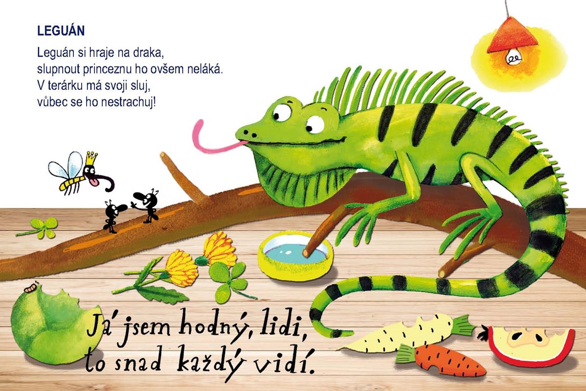 U nás bydlí zvířata nahatá i chlupatá. Kdo je něžně hladí, toho mají rádi. Veselé veršované leporelo Ivony Březinové o zvířatech, která můžete směle doma chovat. Patří mezi ně pes, kočka, akvarijní rybičky, myš, želva, křeček, had, pískomil, papoušek, leguán a morče.