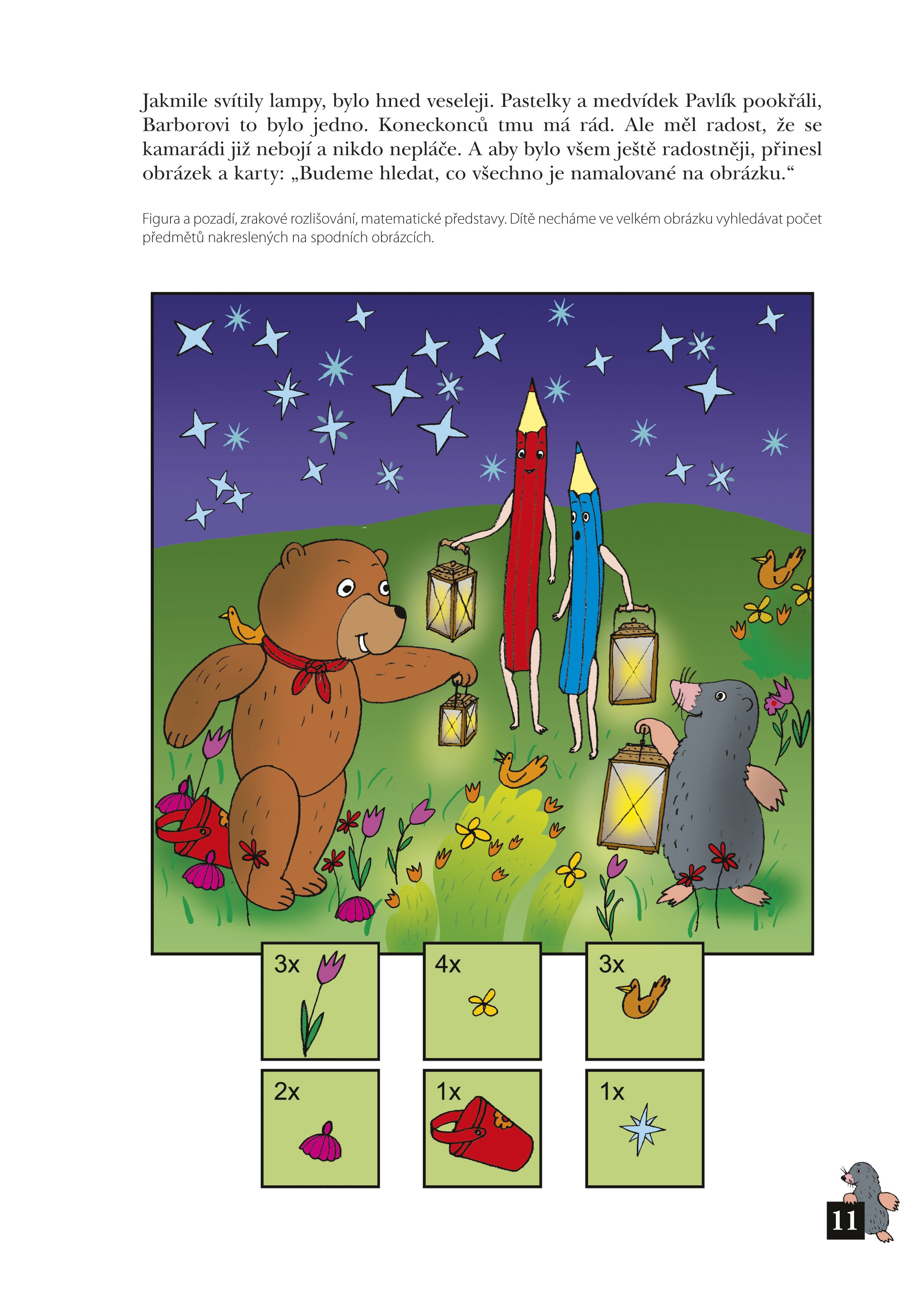 Nemějte obavu, vážený dospělý čtenáři, že to nezvládnete. Autorka pro orientaci Vaši i dětí vybavila text piktogramy, podle nichž zjistíte, co se právě rozvíjí, a hlavně stručnými, srozumitelnými instrukcemi ke každému úkolu a Vám adresovaným dopisem na konci knihy. Dále doporučuji Vaší pozornosti výtvarnou realizaci úkolů, která je výsledkem autorčiny odborné spolupráce s ilustrátorem. Realistické, humorně pojaté obrázky svou barevností a současně přesným respektováním autorčina záměru dítě zaujmou tak, že je vůbec nenapadne, že se vlastně učí číst, psát, počítat, že plní postupně stále obtížnější úkoly, blízké těm školním.