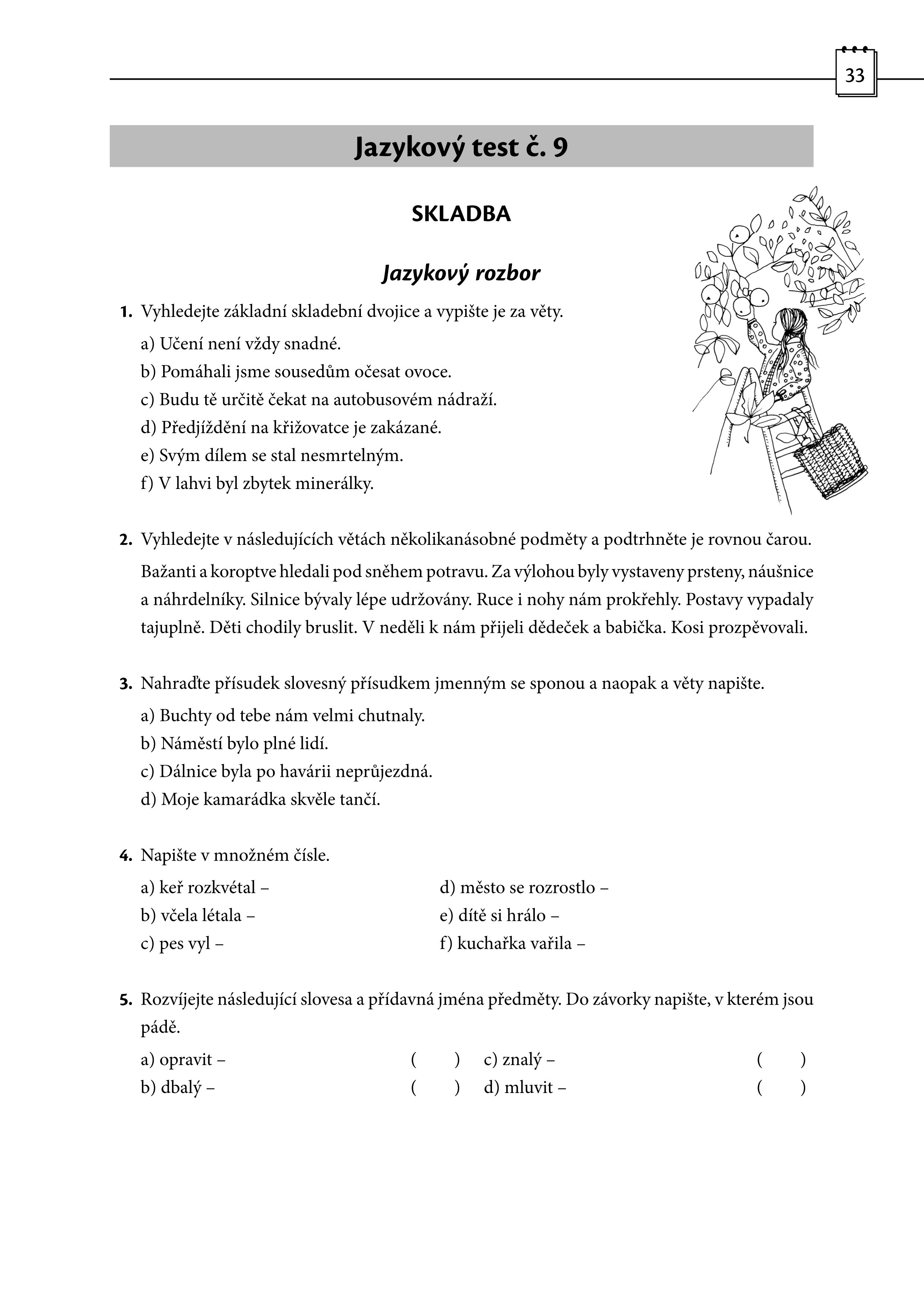 2) 15 jazykových testů: prvních devět je řazeno podle tematických celků probíraných v ročníku, zbývajících šest slouží k souhrnnému opakování základního učiva. Některé z testů obsahují ještě i pravopisnou část a navíc praktické „taháky“ zahrnující pravopisné jevy, v nichž se často chybuje.