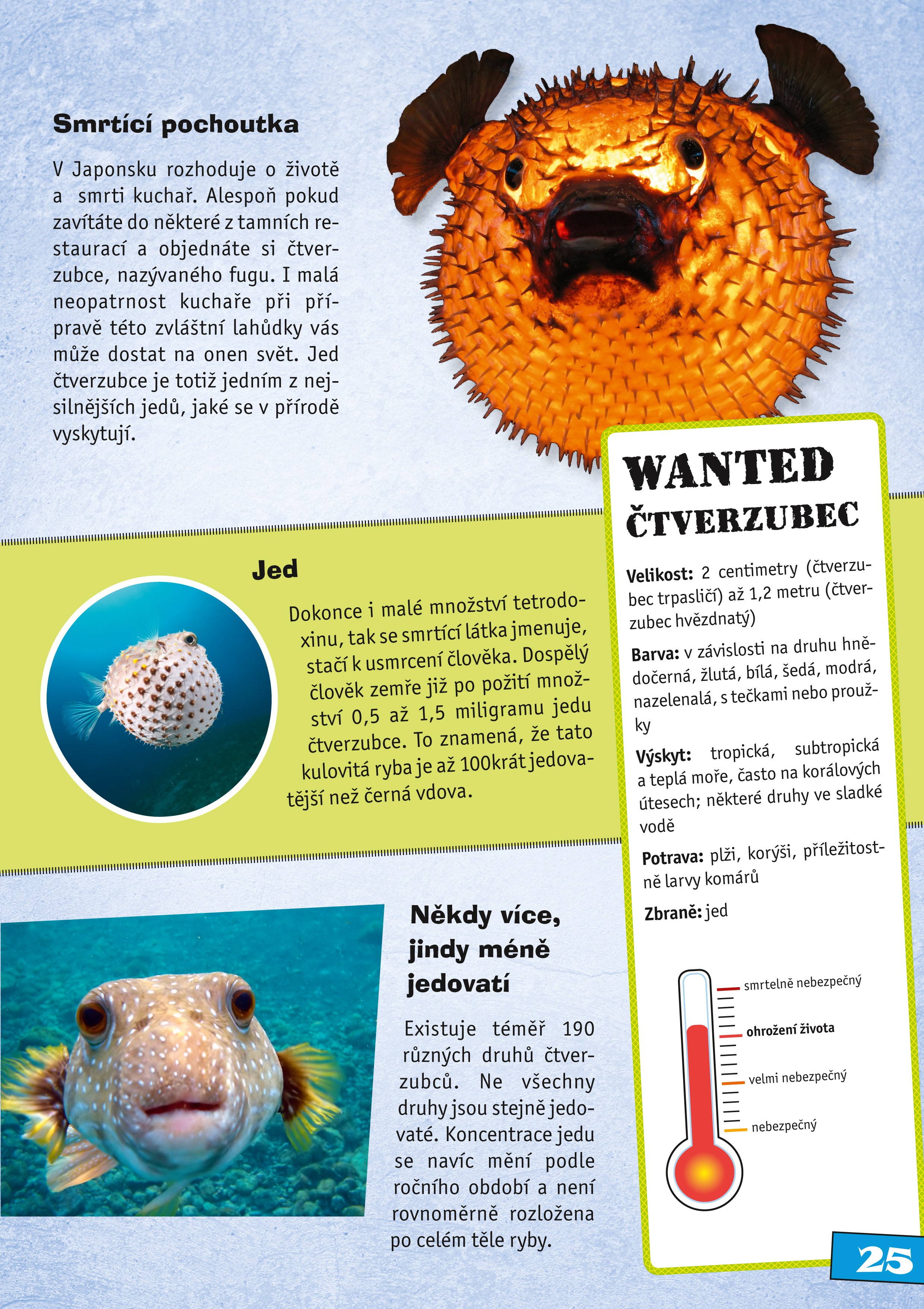 Na základě zevrubných charakteristik a četných fotografií vás kniha seznámí s těmito a dalšími pozoruhodnými živočichy a představí vám také jejich smrticí zbraně. Přehledná stupnice zřetelně ukazuje, jak nebezpeční jednotliví živočichové jsou.