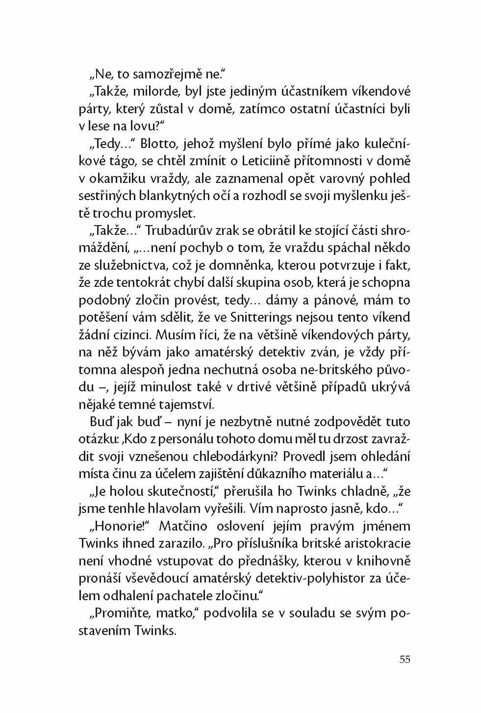 Extrémně urozený, avšak poněkud slabomyslný aristokrat Blotto a jeho extrémně inteligentní a krásná sestra Twinks se účastní víkendového dýchánku na jednom venkovském sídle, když dojde k maléru. Jejich hostitelka, vévodkyně vdova z Melmontu je zavražděna. Amatérský detektiv, který je shodou okolností také přítomen, obviní z vraždy Corkyho Froggeta, osobního řidiče rodiny Lyminsterů. Blotto a Twinks mohou Corkyho nevinu dokázat pouze jediným způsobem: odhalením skutečného pachatele.