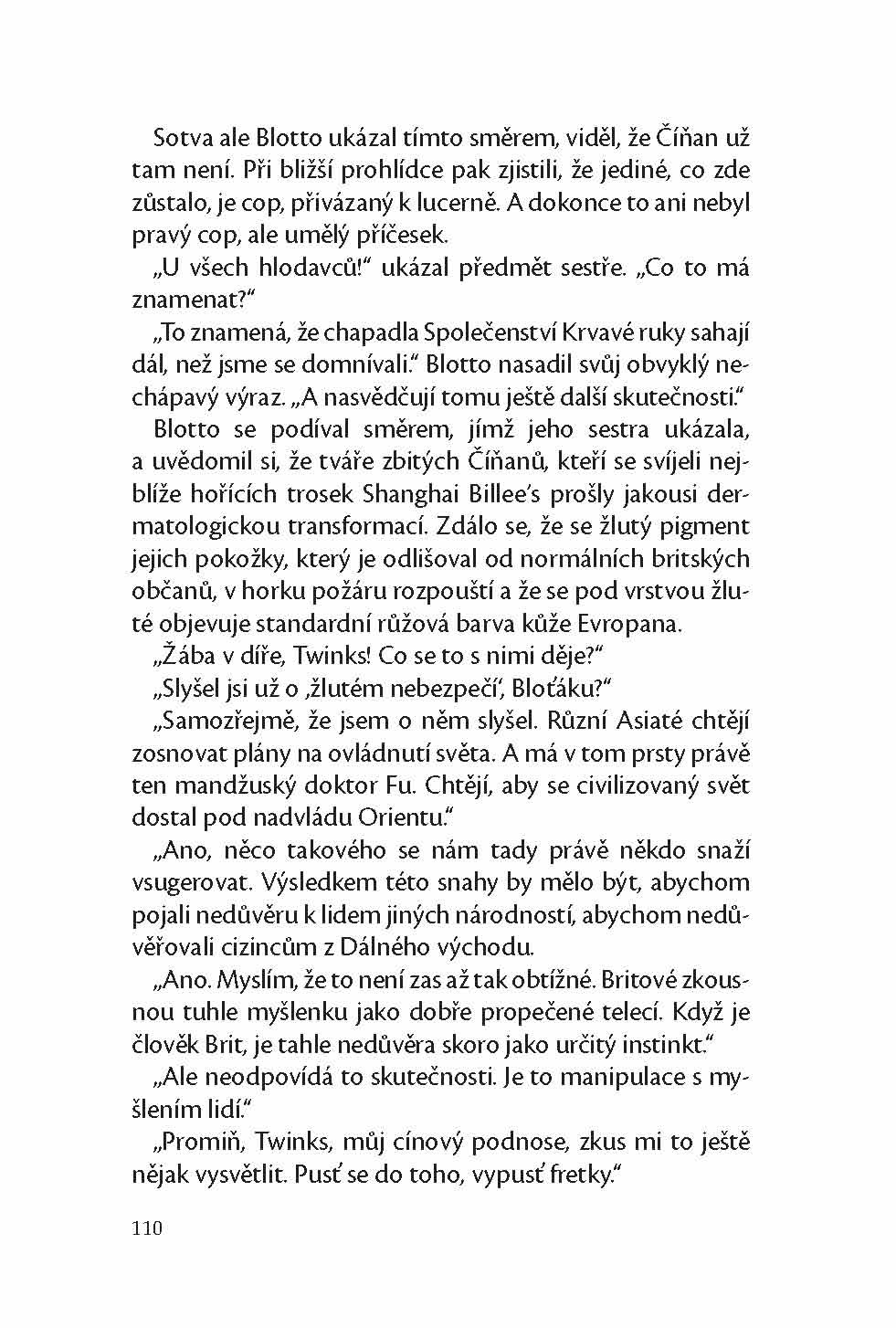 Tak začíná vyšetřování dalšího detektivního případu aristokratického dua, které čtenáře provede opiovým doupětem v londýnské čtvrti Limehouse, skotským hradem, starým cornwallským dolem na cínovou rudu, aby nakonec vyvrcholilo napínavým soubojem v samotném nervovém centru proradného Společenství krvavé ruky.