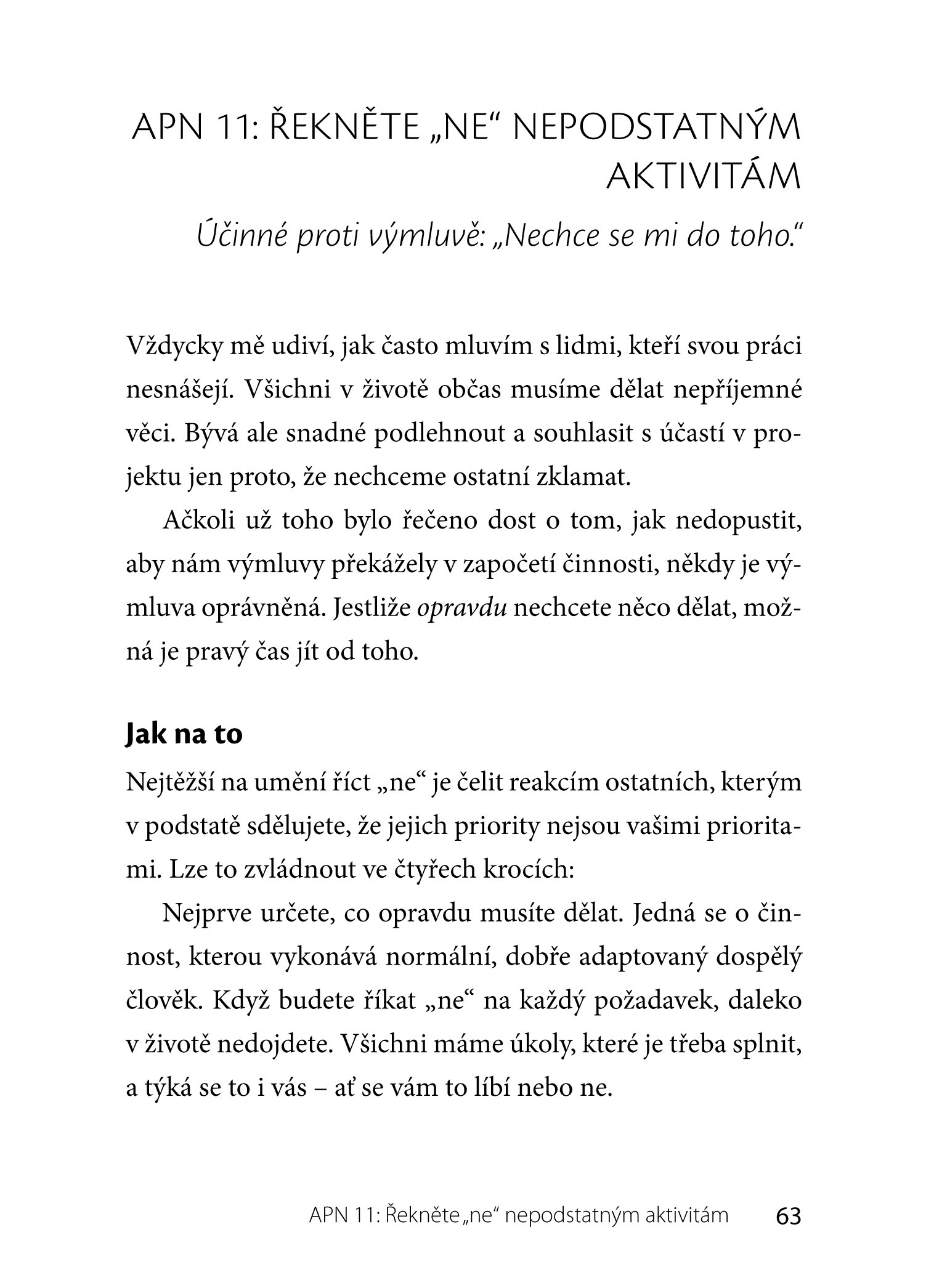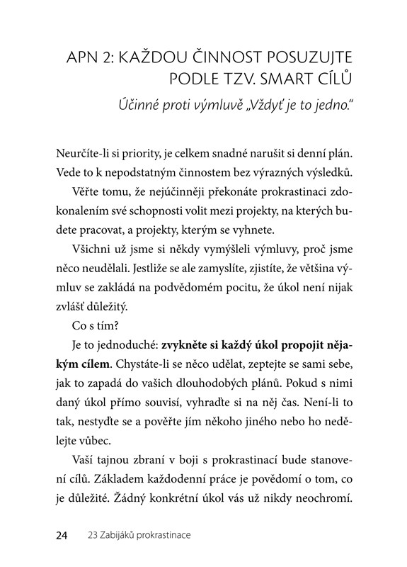 Měli byste se soustředit na práci či na učení, místo toho vás ale napadá spousta výmluv, proč se do úkolu nemůžete pustit. Potřebujete zavolat Robertovi, nemáte správné materiály, ořezané tužky nebo zkrátka nevíte, odkud začít. Ať už zní naše "protože" jakkoli, všichni zažíváme okamžiky, kdy prokrastinujeme. Zanechat prokrastinace je však snadné. Opravdu. Stačí jen, abyste si osvojili určité návyky a z nich pak udělali běžnou součást svého života. V této knize najdete přehled nápadů, které vám pomohou vyhnout se každodenní prokrastinaci.