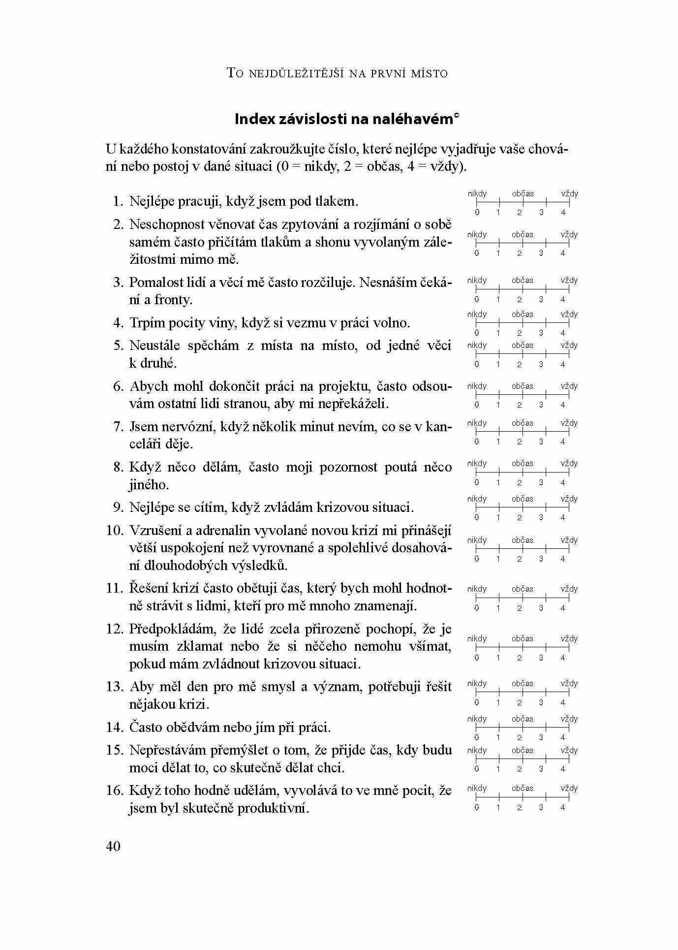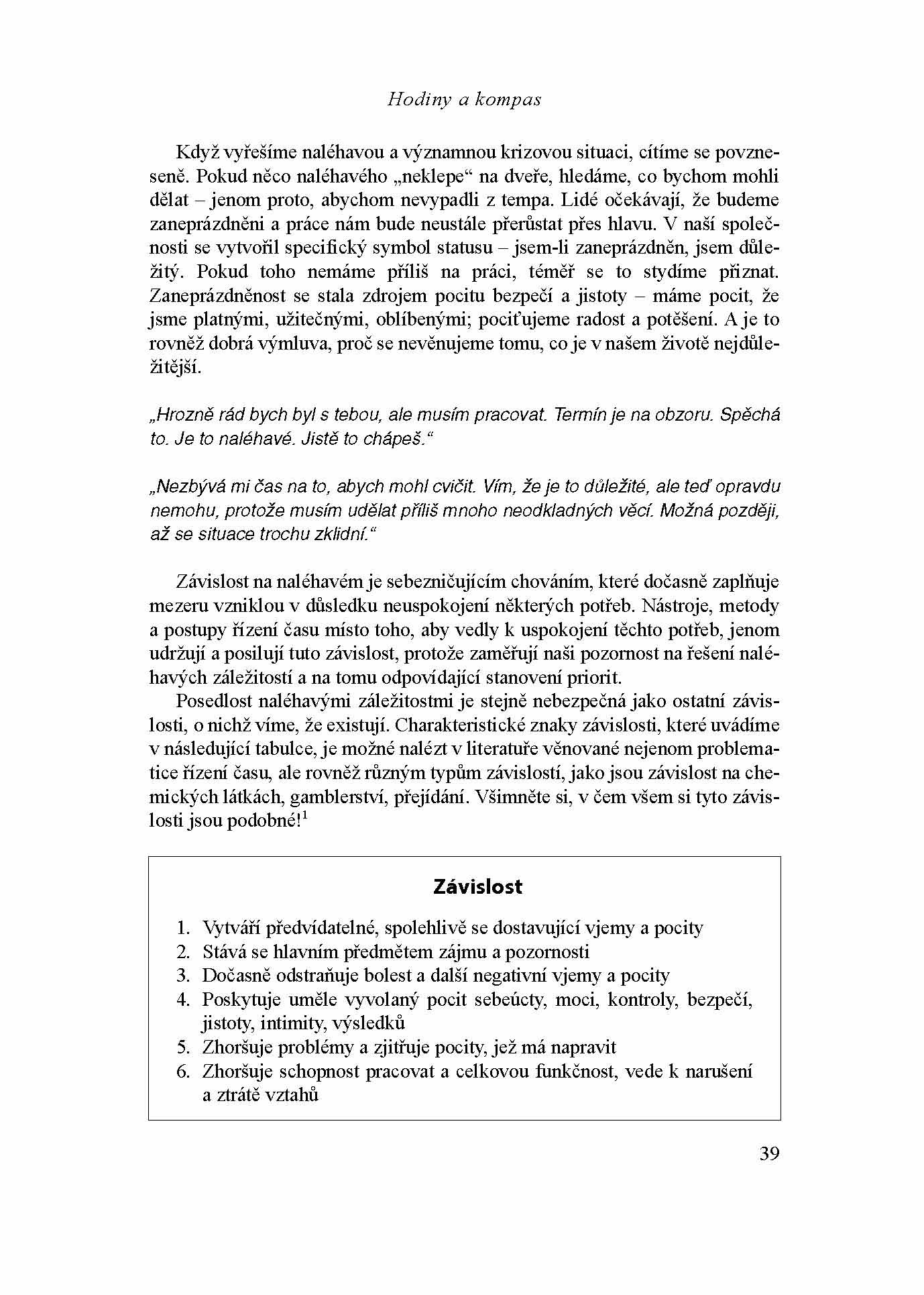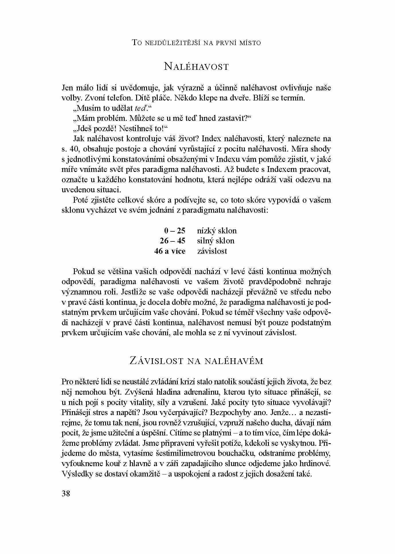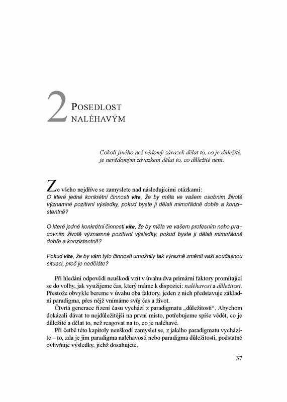 Lidé si neustále stěžují na to, s jakými překážkami se musí dnes a denně potýkat ve snaze docílit, aby stačili splnit všechny pracovní úkoly, věnovat se rodině, přátelům… Proč tak často nedáváme to nejdůležitější na první místo? Existuje přece nespočet metod, postupů a nástrojů, zaměřených na to, jak řídit a kontrolovat svůj čas. Stále se nám odevšad dostává ujištění, že všechno zvládneme, pokud budeme pracovat ještě usilovněji, naučíme se dělat věci lépe a rychleji, budeme využívat nové metody, prostředky a nástroje nebo si vše uspořádáme a zorganizujeme jinak než dosud.