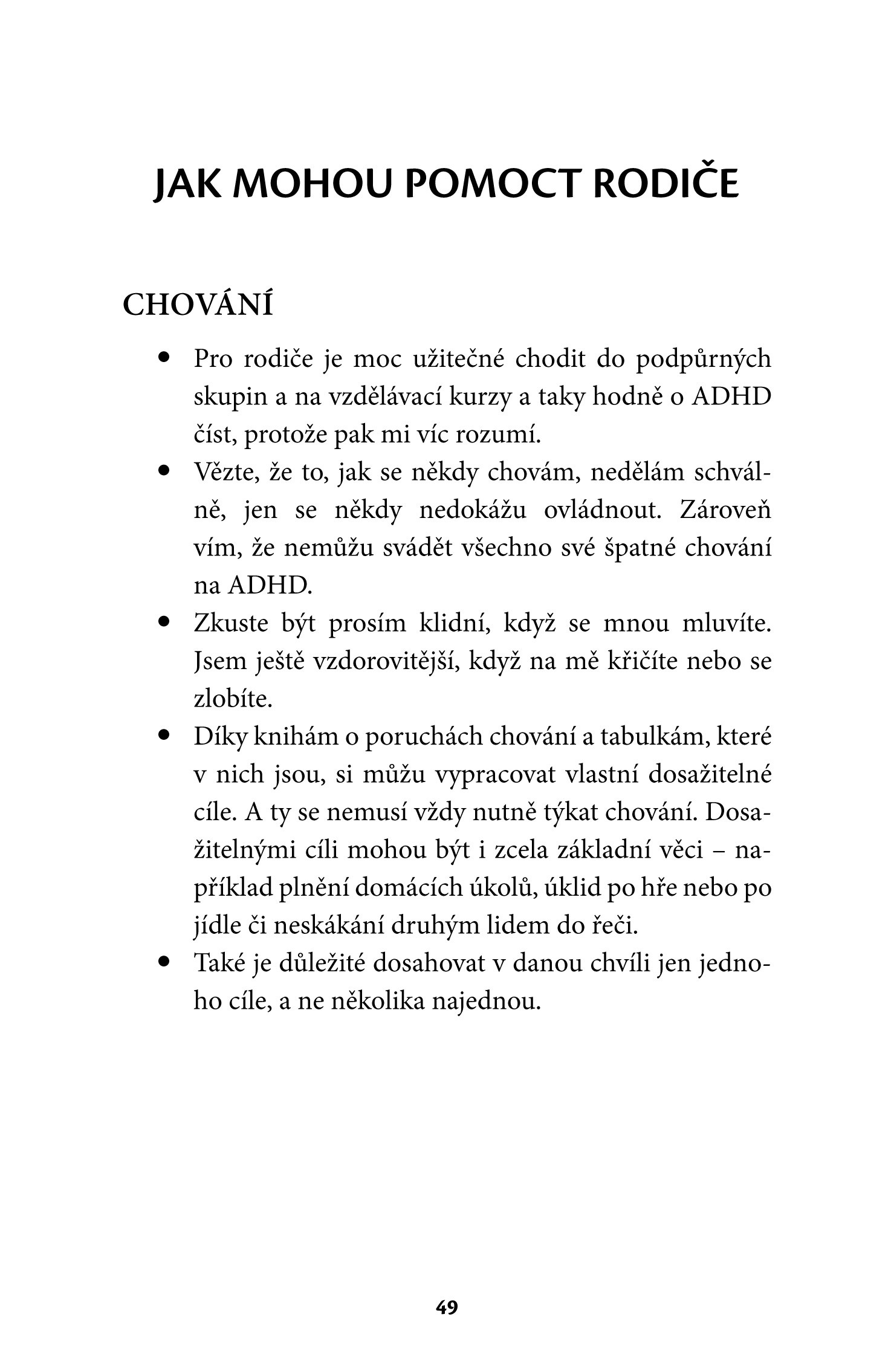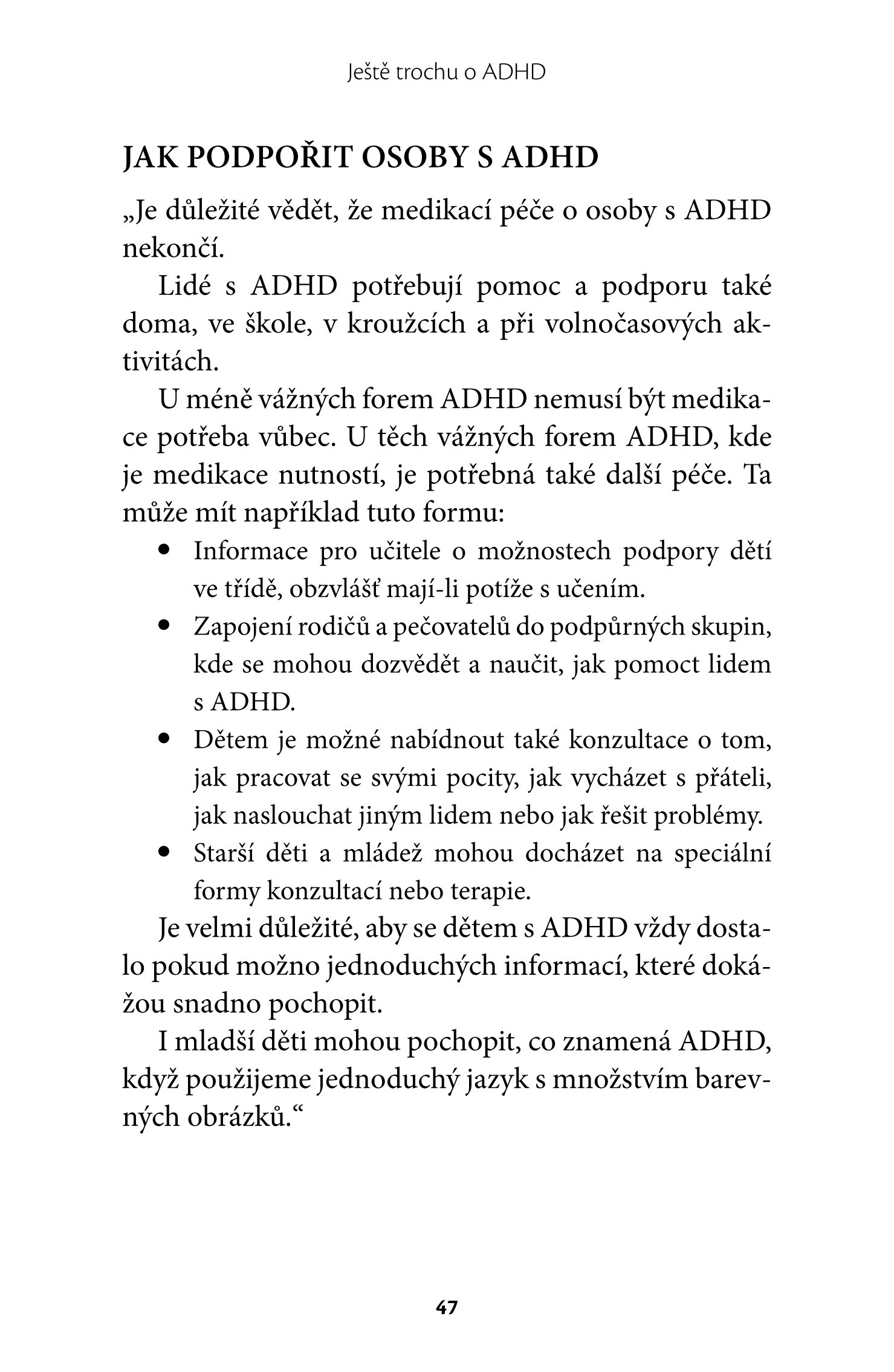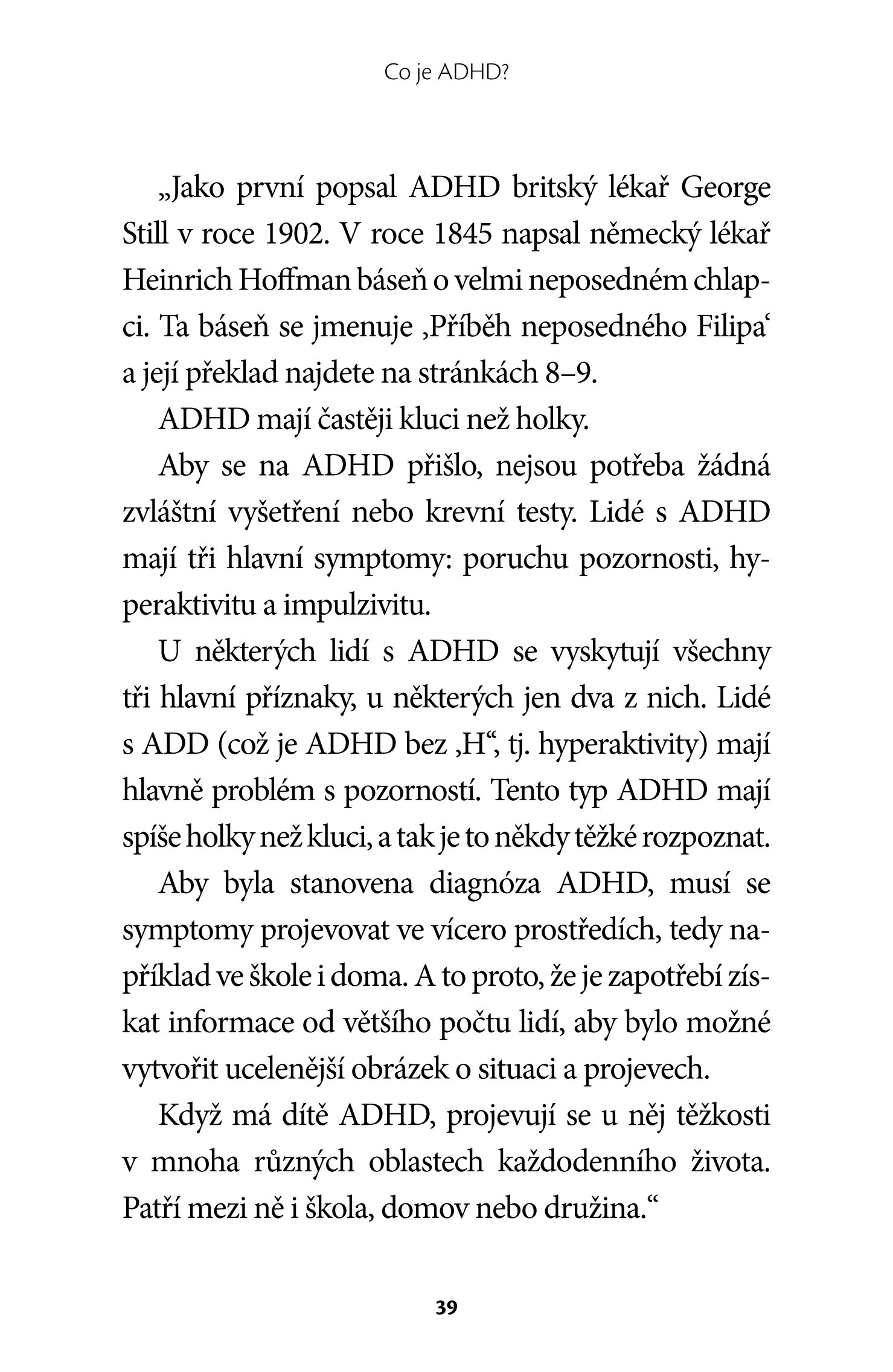 Díky vyprávění o hyperaktivitě z pohledu dítěte a jazykem dítěte je kniha pochopitelná i malému čtenáři. V ilustrativním příběhu se děti s ADHD velmi snadno poznají, naučí nahlížet na sebe sama bez ponižujících „nálepek“ a budou umět svůj problém vysvětlit kamarádům a říct si o pomoc.