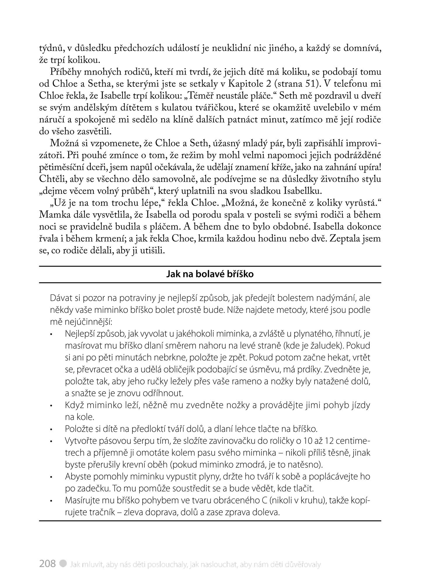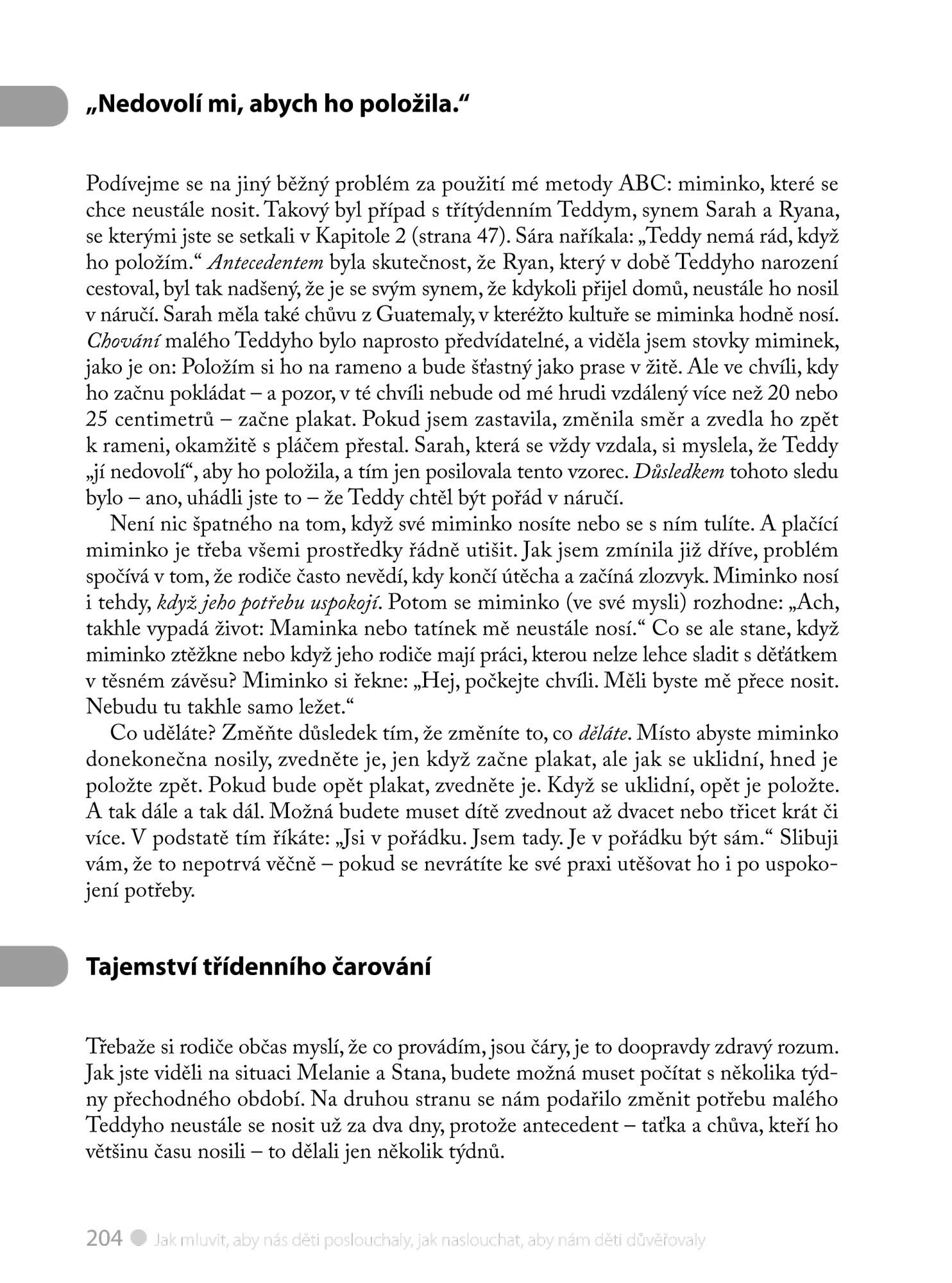 Autorka využívá jednoduchých, ale jednoznačných postupů, které nastolují dítěti řád a systém v denním harmonogramu. Pomocí testu zjistíte, zda je vaše dítě „andělské“, „učebnicové“, „přecitlivělé“, „odvážné“ či „nabručené“. Získáte tím přesnější informaci, jak k dítěti přistupovat.