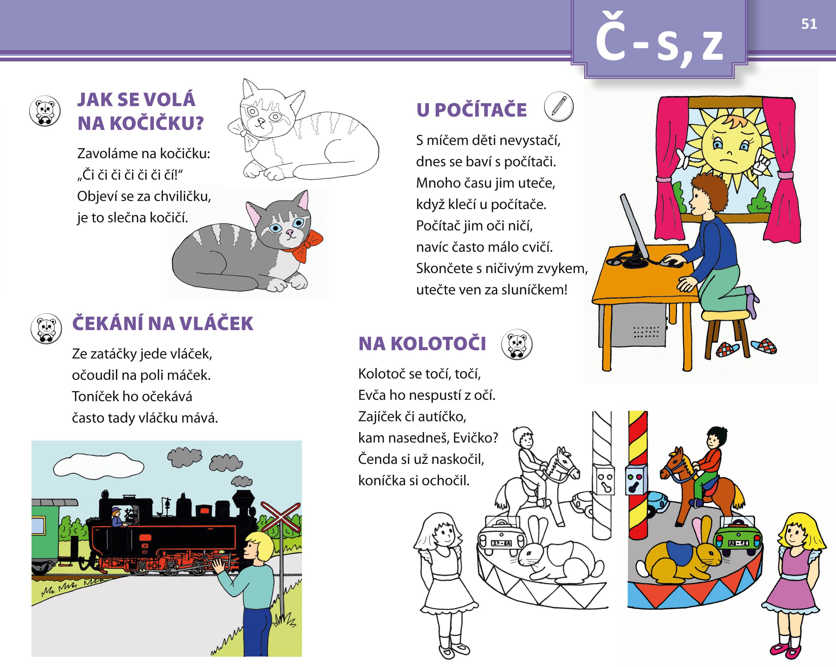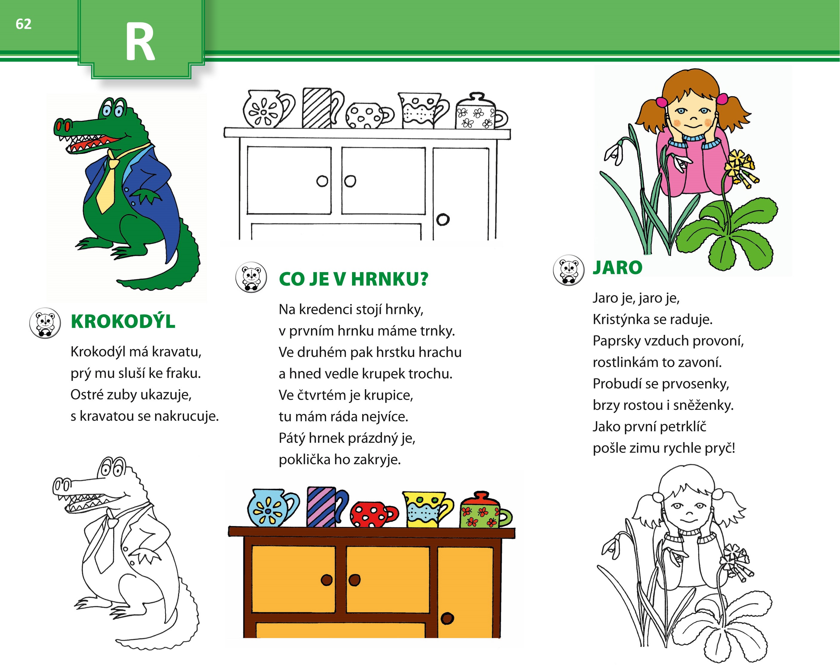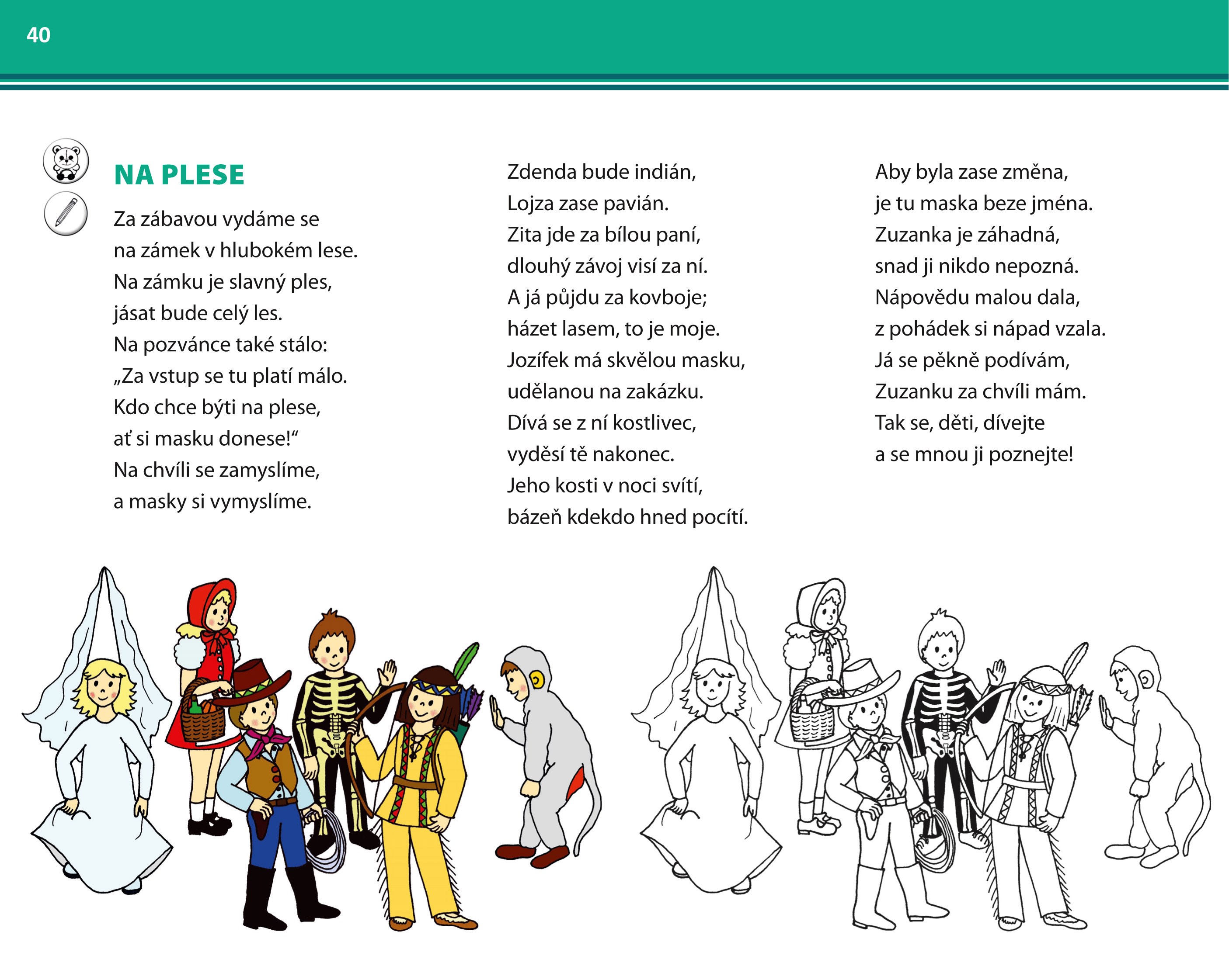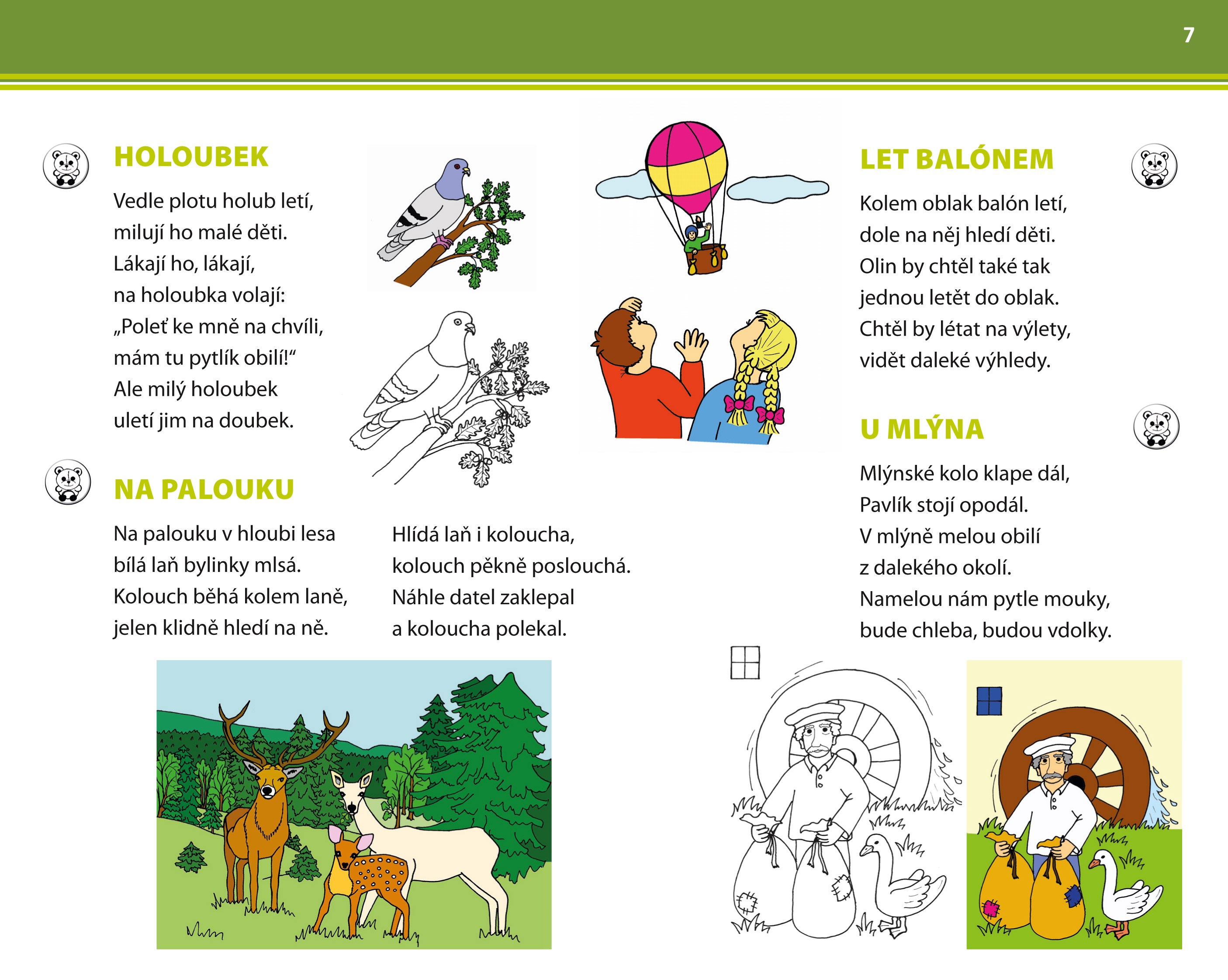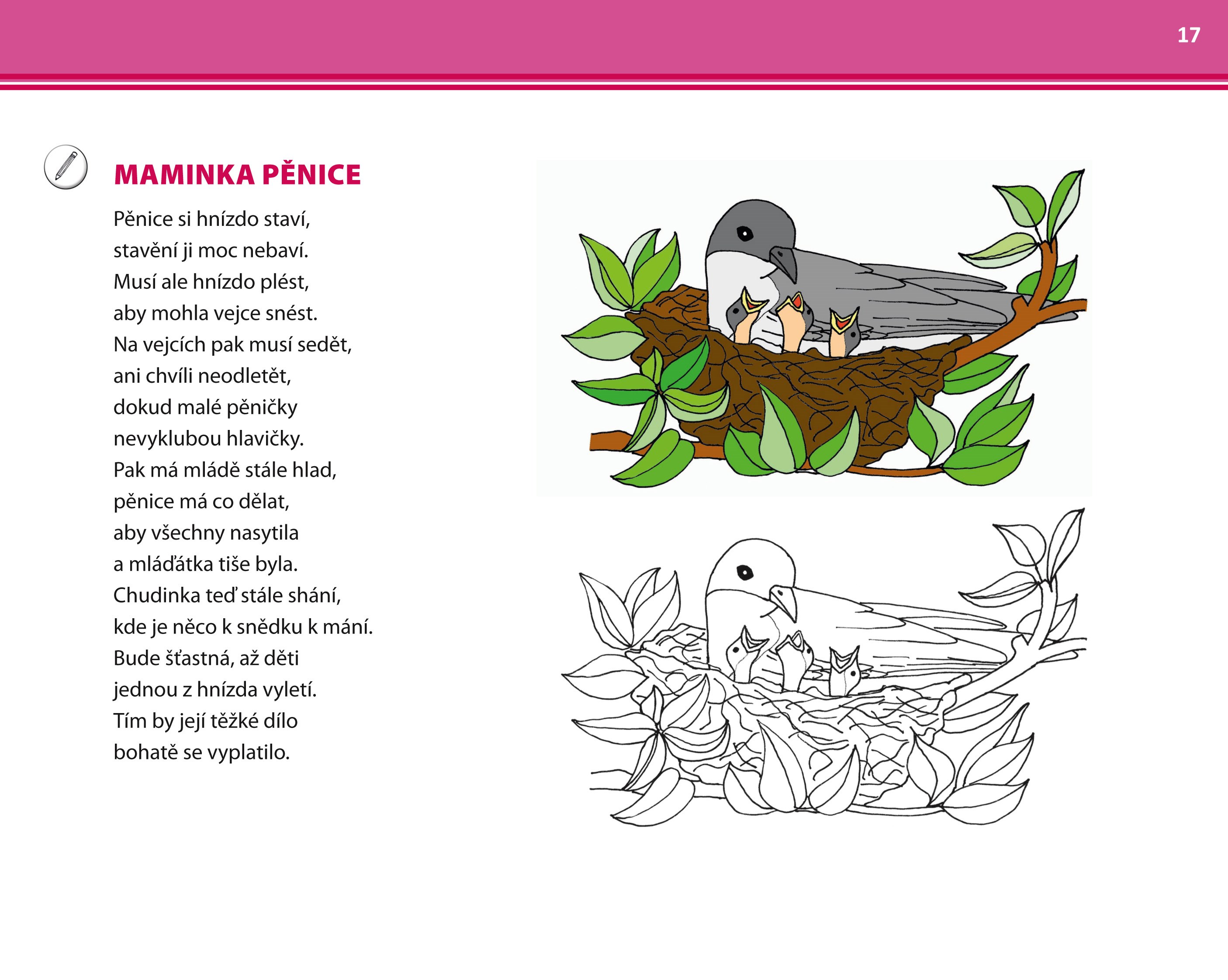 Některé říkanky jsou kromě barevného obrázku doplněny i obrázkem černobílým, který si mohou děti po práci s textem za odměnu vybarvit.