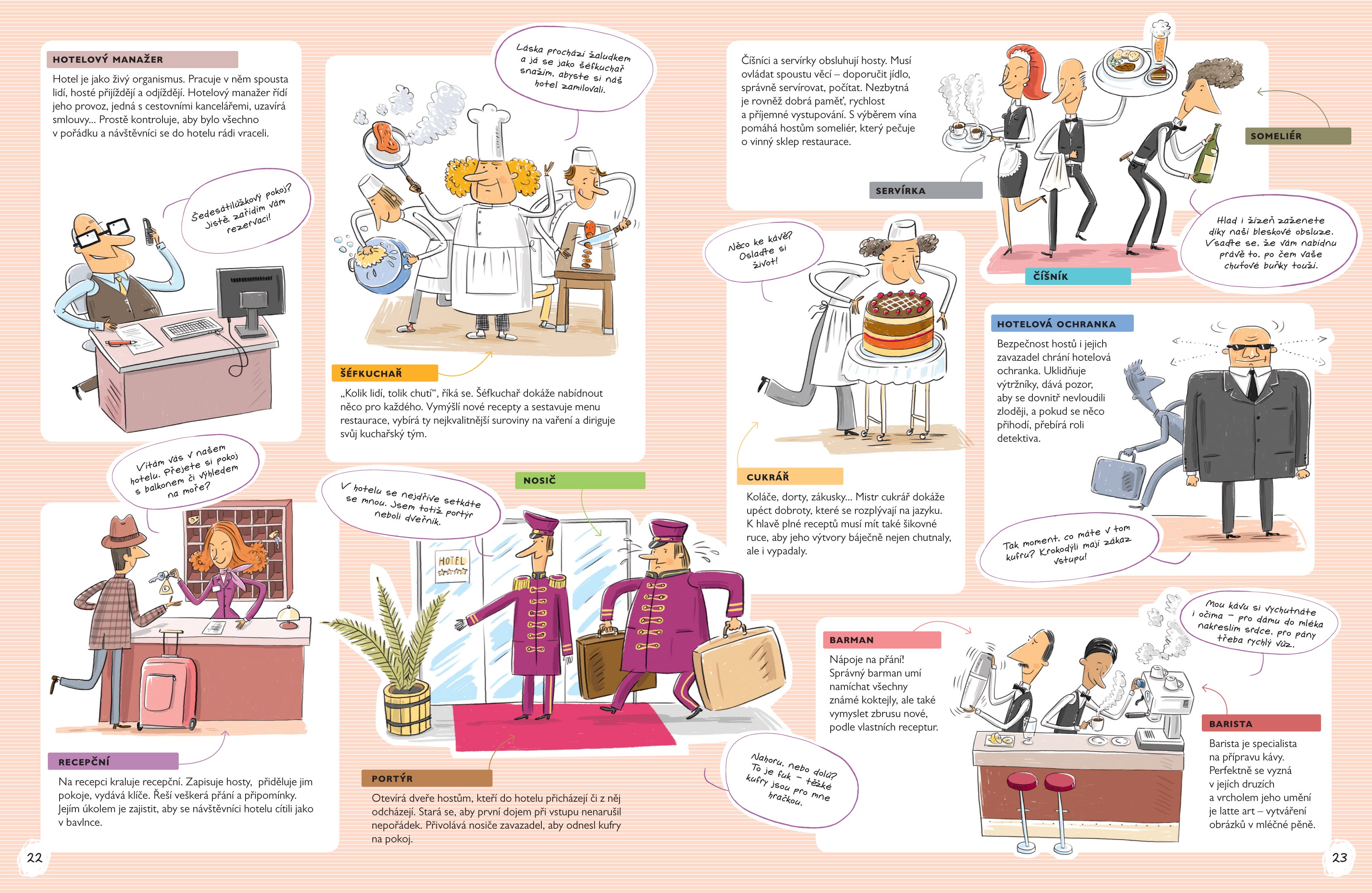 Publikace pro zvídavé děti od šesti let nabízí pohled do sedmnácti pracovních prostředí, v nichž se seznámí s třemi sty různých profesí. Každá kapitola začíná dvoustránkovou ilustrací, na níž jsou lidé při výkonu své práce. Nejzajímavější profese jsou na další dvoustraně detailněji popsány. Pro snadnou orientaci slouží rejstřík všech zařazených povolání na začátku knihy.