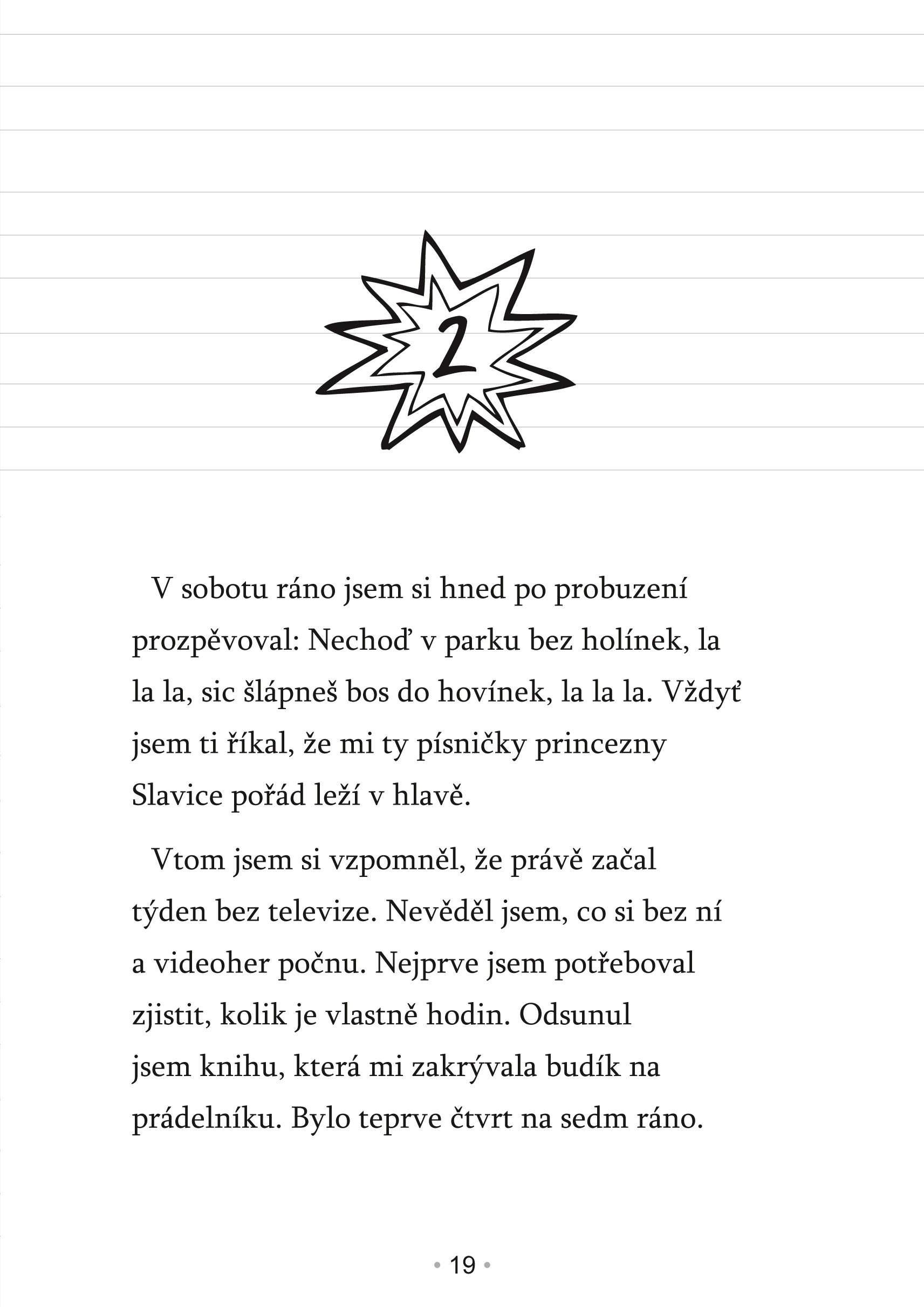 Tak si to představte: Náš pan učitel se zbláznil! Chce po nás, abychom celý týden vůbec ale vůbec, to znamená, že ani jednou, nezapnuli televizi! No chápete to? Jak po mně může někdo vážně chtít, abych celý týden vydržel bez mých oblíbených pořadů a bez videoher? Nejhorší na tom, je že se na nás domluvil i se všemi rodiči, takže nám nezbývá než se ten děsivě hrozný a hrozně děsivý týden zabavit jinak. Jsem zvědav, kolik děcek z naší třídy tohle přežije!