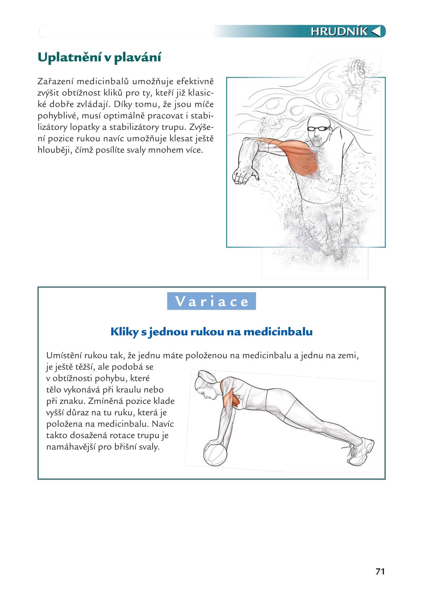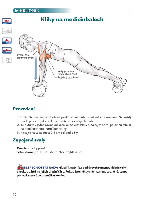 Obrázky svalů pracujících při startu, obrátkách nebo při pohybu během čtyř závodních plaveckých způsobů (kraulu, prsou, motýlka a znaku) vám objasní spojitost mezi cvičením a konkrétní situací v bazénu. Cviky můžete modifikovat a zaměřit na určité části těla, zlepšit svoji kondici, a snížit riziko zranění při plavání.