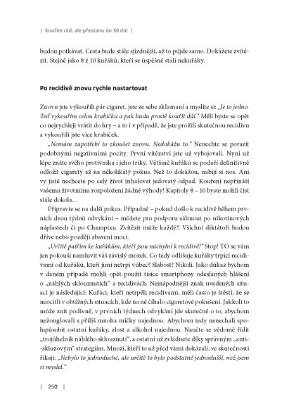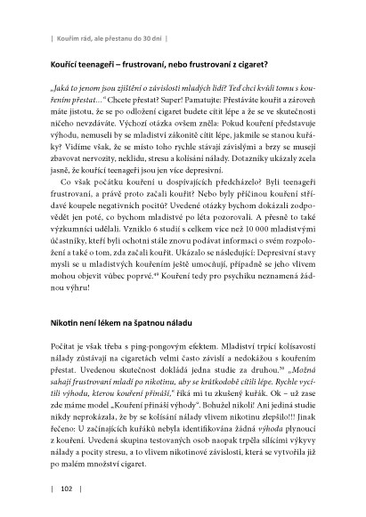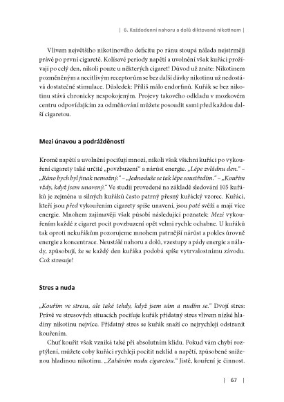 Autor této knihy vám předkládá soubor rad, který vám pomůže s kouřením definitivně skoncovat. Ví, jak nikotin přeprogramovává mozek, činí vás náchylnějšími ke stresu, způsobuje výkyvy nálad. Ví, že na to, proč stále ještě kouříte, má vliv spousta malých detailů. Naučí vás je odhalit, pojmenovat a pochopit. Pak přestanete kouřit.