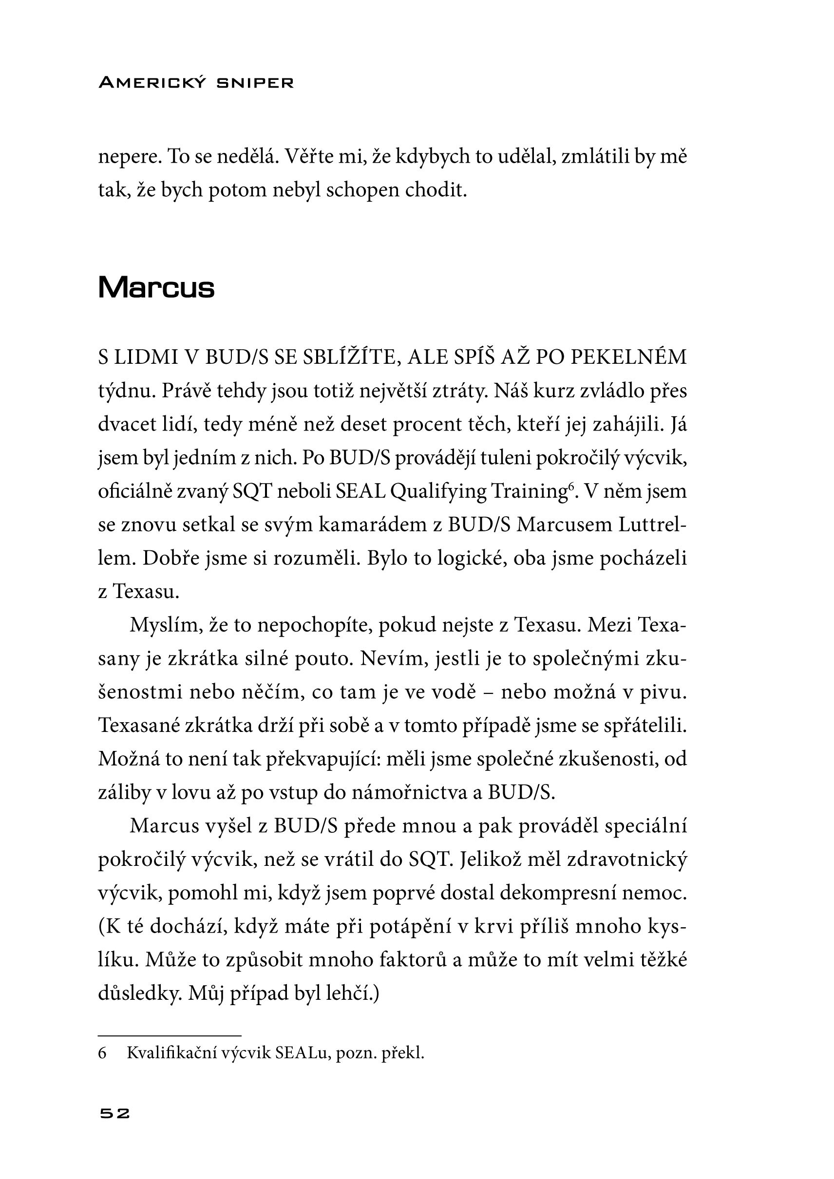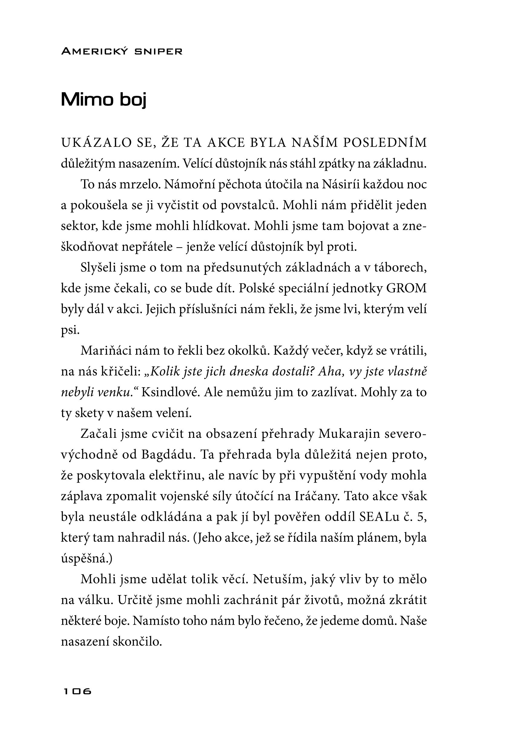 „Chris Kyle dokázal vyniknout i v elitní společnosti bojovníků SEALu. Špičkový odstřelovač Kyle udělal a viděl věci, o kterých se bude mluvit ještě dlouho, nejen mezi americkými vojáky, ale i mezi těmi, kdo v boji stáli proti nám a na vlastní kůži pocítili efektivitu nejúspěšnějšího odstřelovače světa.“