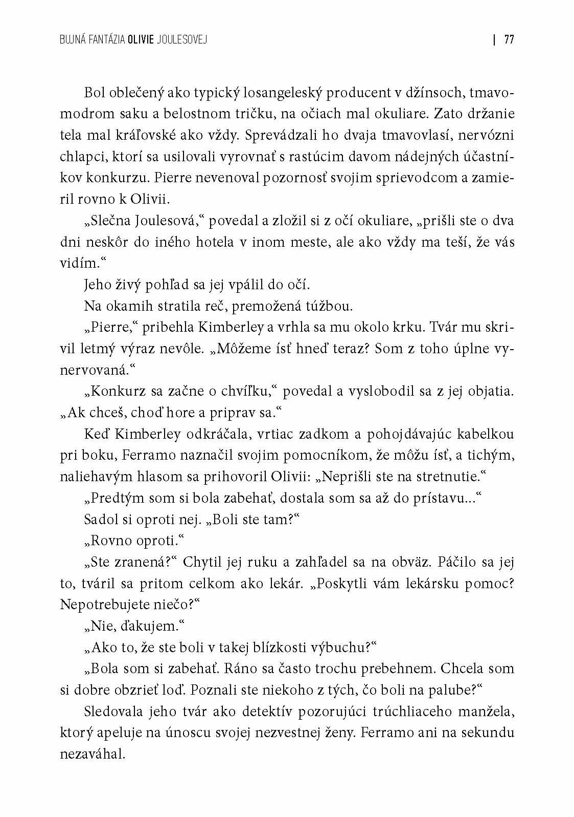 Helen Fieldingová ostáva verná svojej povesti. Bujná fantázia Olivie Joulesovej vás pobaví, zaujme, nechýbajú ani napínavé pasáže a trefné myšlienky hlavnej postavy. Olivia je veselá, vnímavá a hoci sa často vlastným pričinením dostáva do komplikácií, napokon sa z nich vždy šarmantne vymaní. Počas celého deja pritom nie je jasné, či je Pierre iba obeťou jej predstáv, alebo je skutočne nebezpečným zločincom. Preto vám neostáva nič iné, iba spolu s Oliviou cestovať po svete a hľadať dôkazy. A buďte si istí, že to bude skvelá jazda!
