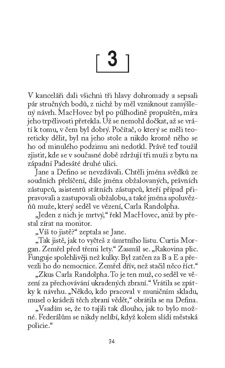 A tak se rozbíhá vyšetřování, které Jane zavede od činžáků z hnědého pískovce ve Village do čtvrtí pro střední vrstvu v Queensu, bohatého Sutton Place i do zlověstných tunelů metra, kde na každém kroku číhá smrtelné nebezpečí.