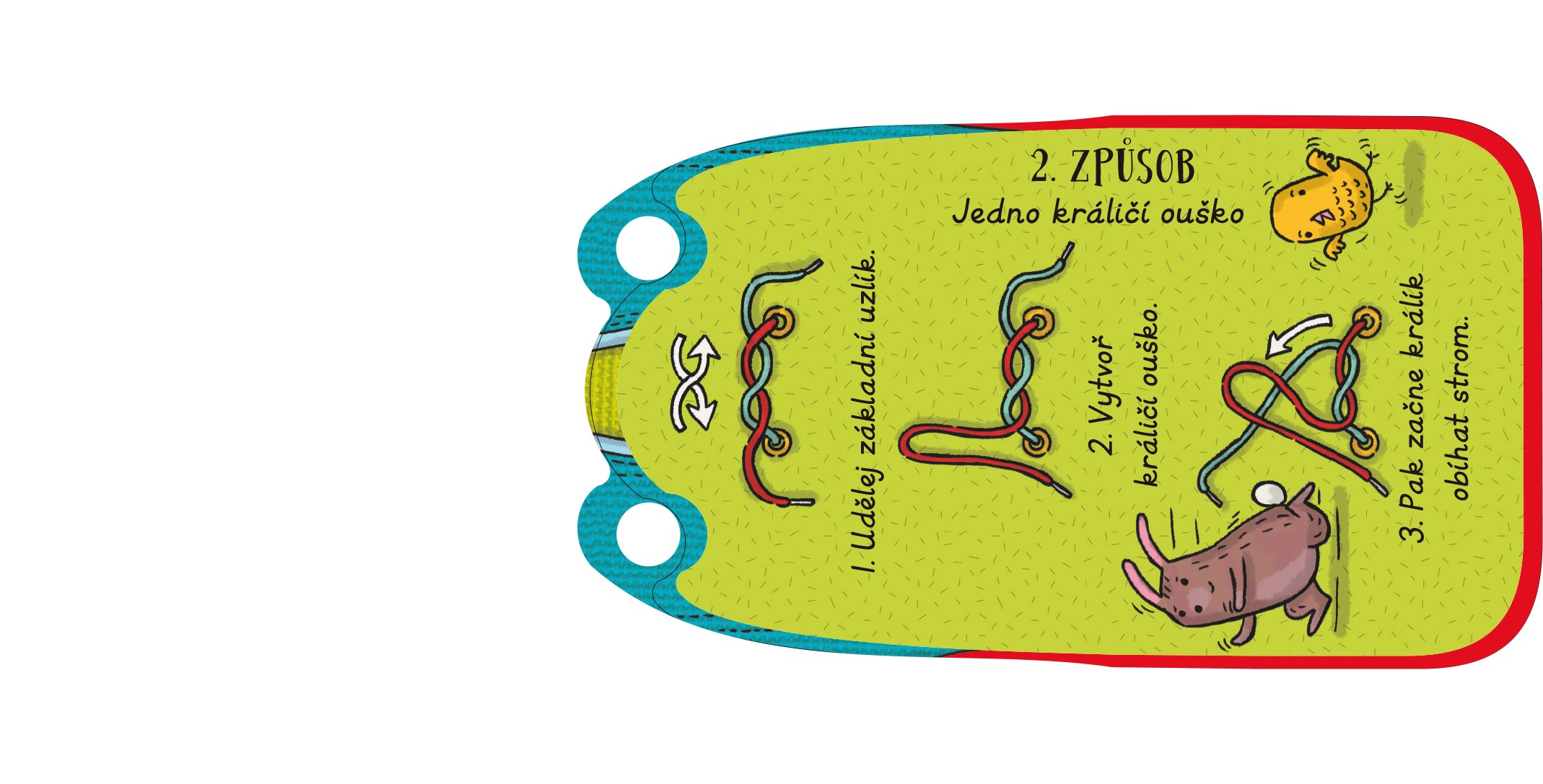 V knize naleznete dva způsoby zavazování tkaniček, aby si mohl každý vybrat ten, který je mu bližší. Tkanička se dá z jednotlivých dírek vytáhnout stejně jako ze skutečné boty. Děti se tedy naučí nejen tkaničky zavazovat, ale zdokonalí si i svoji jemnou motoriku při navlékání tkaniček do dírek.