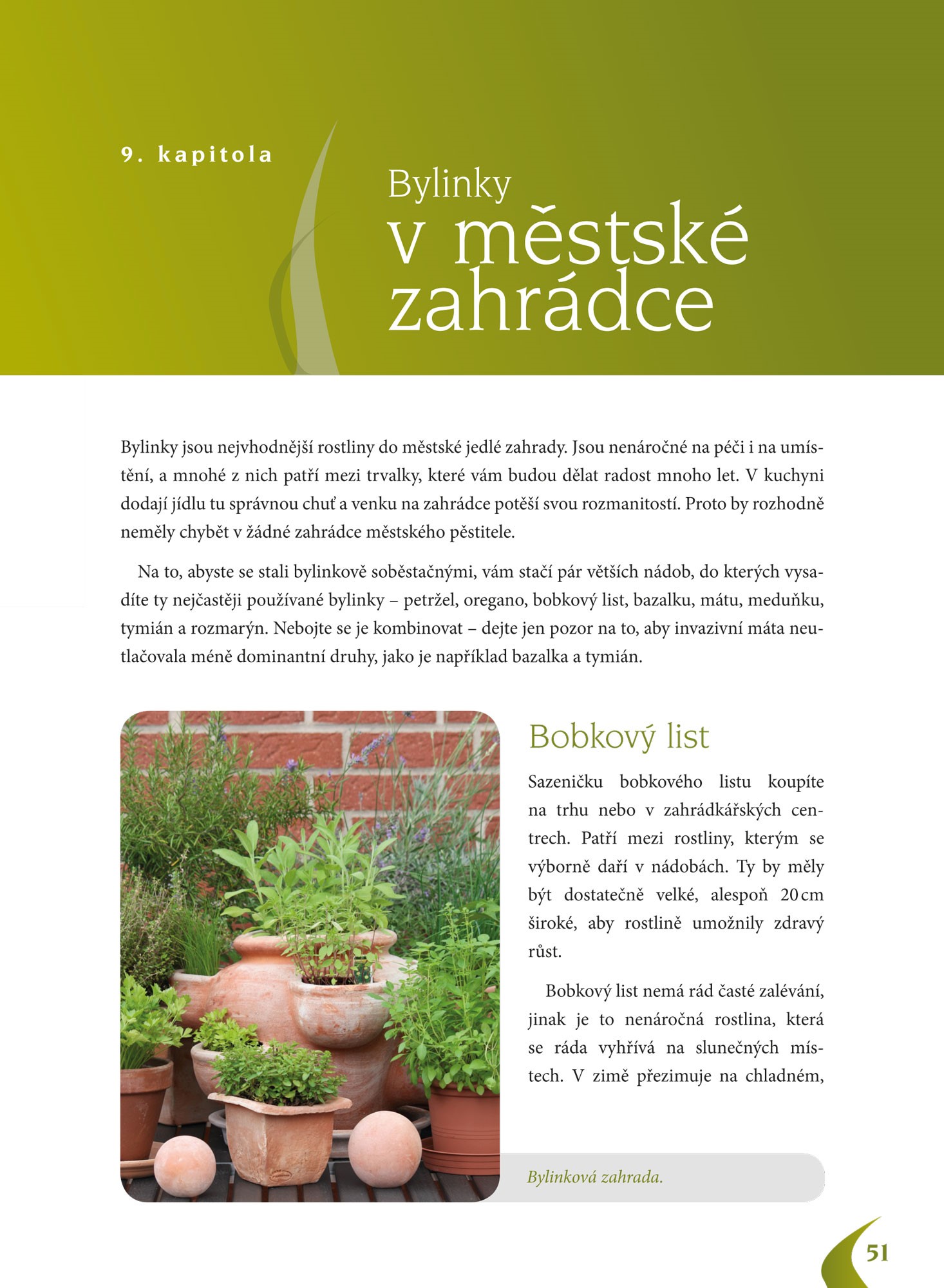 Krok za krokem vám představí, jaké bylinky, ovoce, zeleninu, jedlé květy či vlastní sazenice si můžete takto vypěstovat, jak jednotlivé rostliny kombinovat a poradí s výběrem vhodných nádob. Naučíte se používat přírodní hnojiva, získáte cenné rady jak si poradit s případnými škůdci a chorobami bez použití chemie a také jak efektivně využít malý prostor.