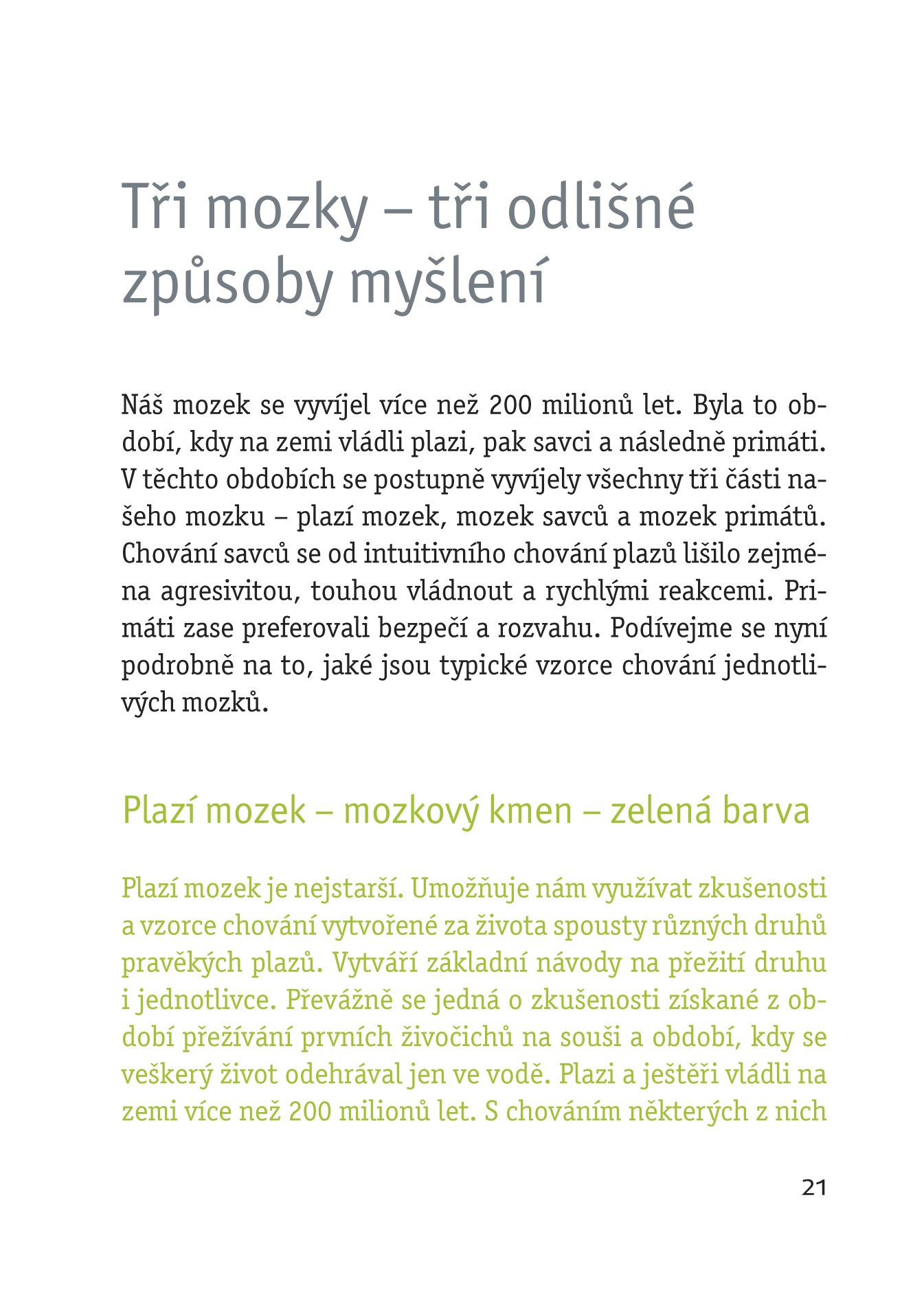 Máte občas pocit, že nechápete chování svého partnera, dítěte či kolegy v práci? Že jednají naprosto nesmyslně? Nebo někdy nedokážete vysvětlit, proč jste něco řekli či udělali? Náš mozek je složitý a bylo o něm vypracováno již mnoho studií, ale stále je co objevovat. Teorie trojjediného mozku není neznámá, ale autor této knihy vám nabízí nové poznatky, jak právě trojjedinost mozku ovlivňuje naše chování. Dozvíte se, jak se chovají lidé, u nichž dominuje plazí mozek, mozek šelem či mozek primátů, jak tyto lidi mezi sebou rozpoznat a jak s nimi jednat. Zjistěte i vy, zda jste plaz, šelma či primát.