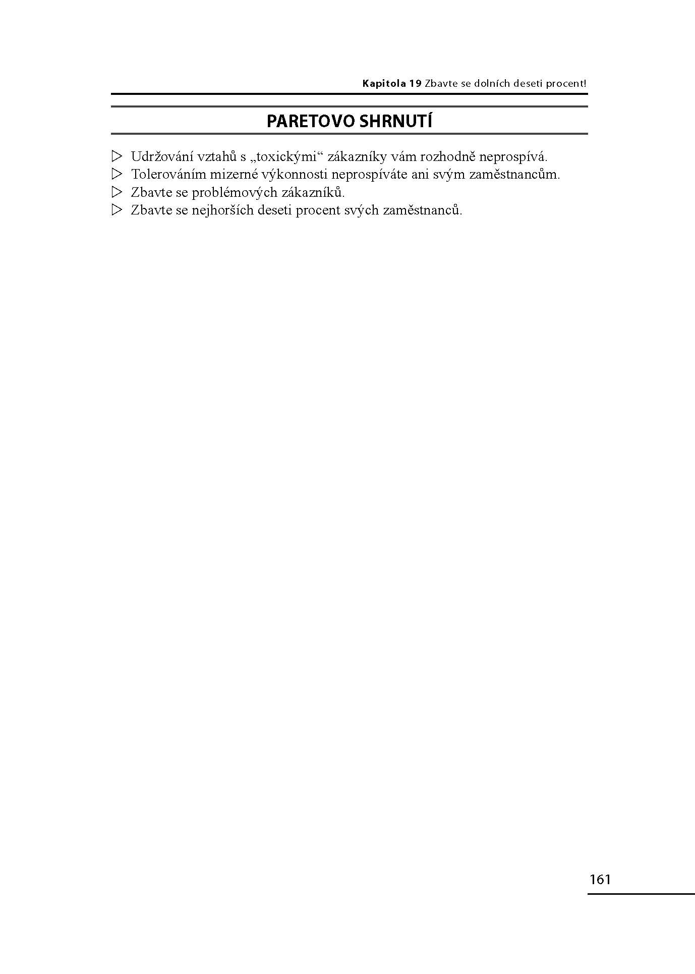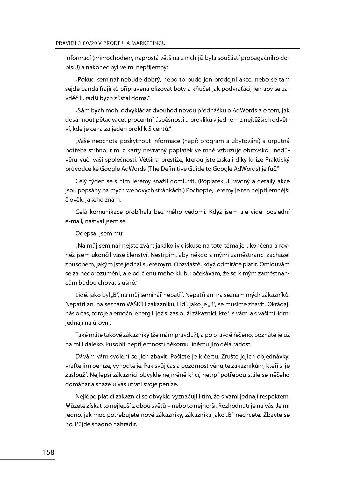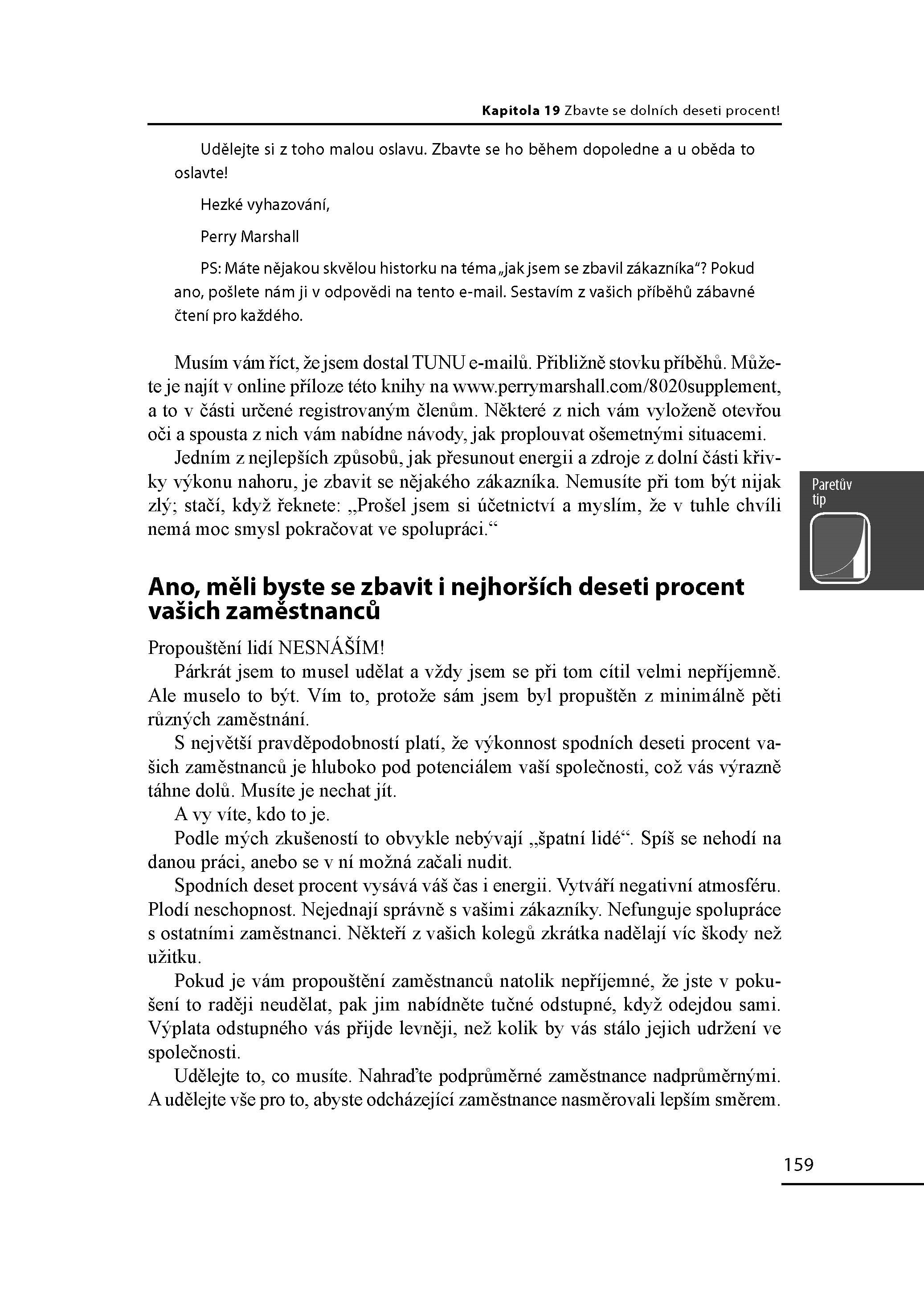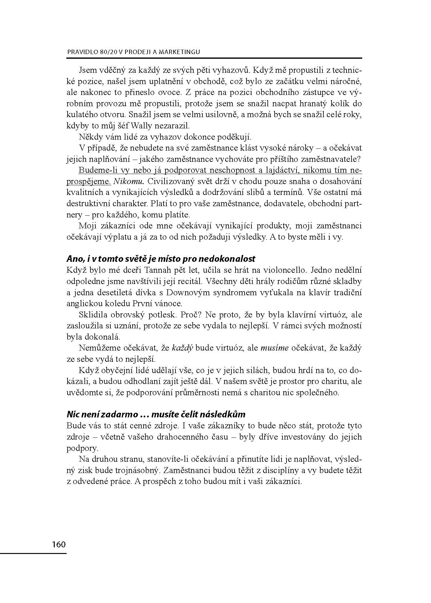 Pravidlo 80/20 je tedy klíčem k tomu, jak kontrolovat a usměrňovat svůj život. Pokud se dokážeme soustředit na několik nejmocnějších a nejdůležitějších sil v nás a kolem nás, můžeme obrátit své úsilí správným směrem a znásobit svou efektivnost. Většina toho, co děláme, nás mnohdy ani nezajímá, a výsledný efekt našeho konání je také často mizivý. Ale pokud se soustředíme na to podstatné, můžeme kontrolovat události ve svém životě, a nedopustit, aby události kontrolovaly nás. Pravidlo 80/20 je jednou z nejúspěšnějších, nejvlivnějších a nejprovokativnějších knih o byznysu a řízení osobního života posledních deseti let. Ne neprávem je dnes tato kniha považována za klasické dílo světové literatury. Nové, aktualizované vydání obsahuje oproti předchozímu vydání části pojednávající o jin a jang pravidla 80/20, udržitelnosti světového rozvoje a povinnosti každého z nás podílet se na odpovědnosti za světové bohatství a pokrok společnosti, které význam a pochopení pravidla 80/20 povznášejí na kvalitativně vyšší úroveň.