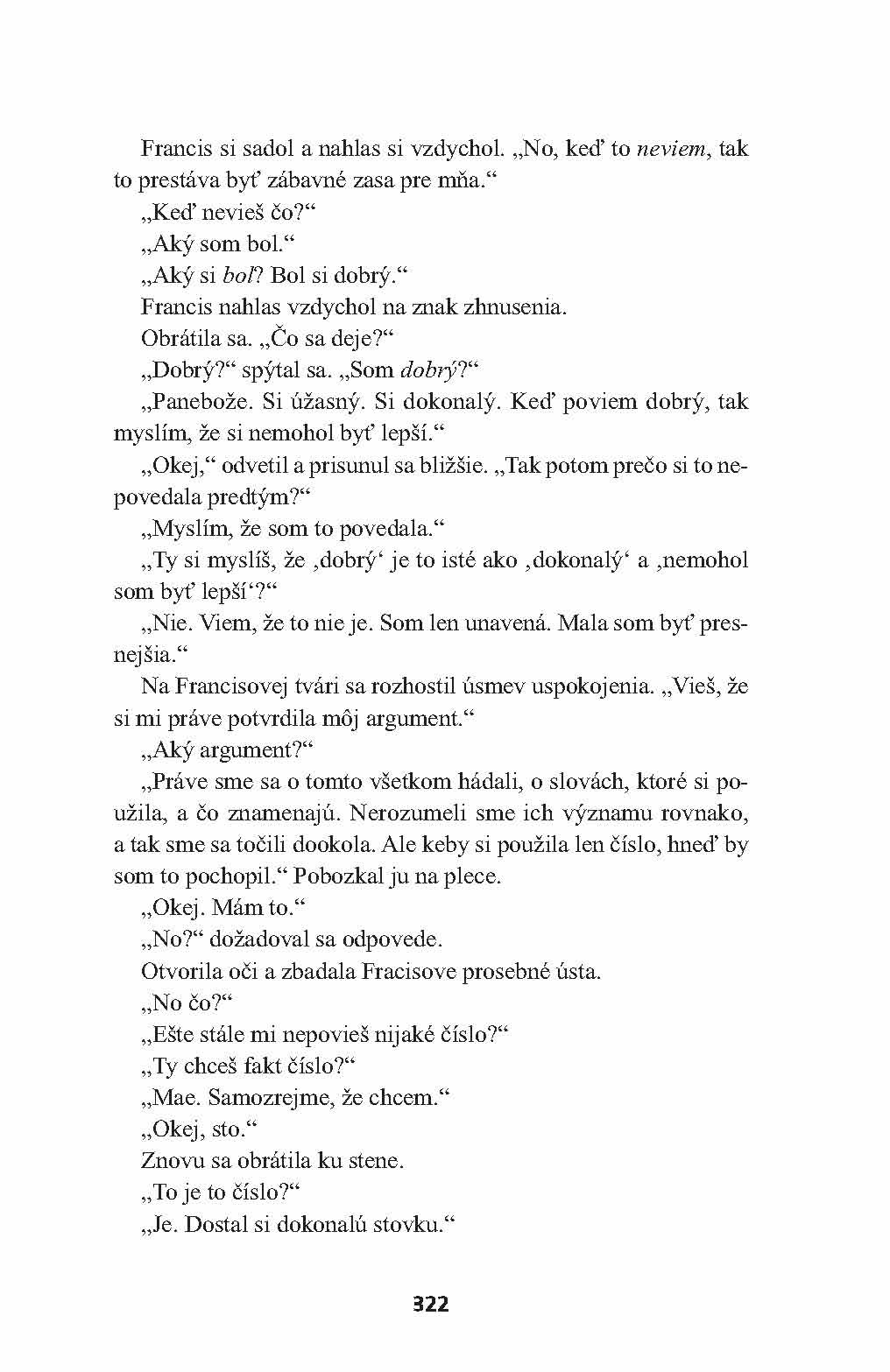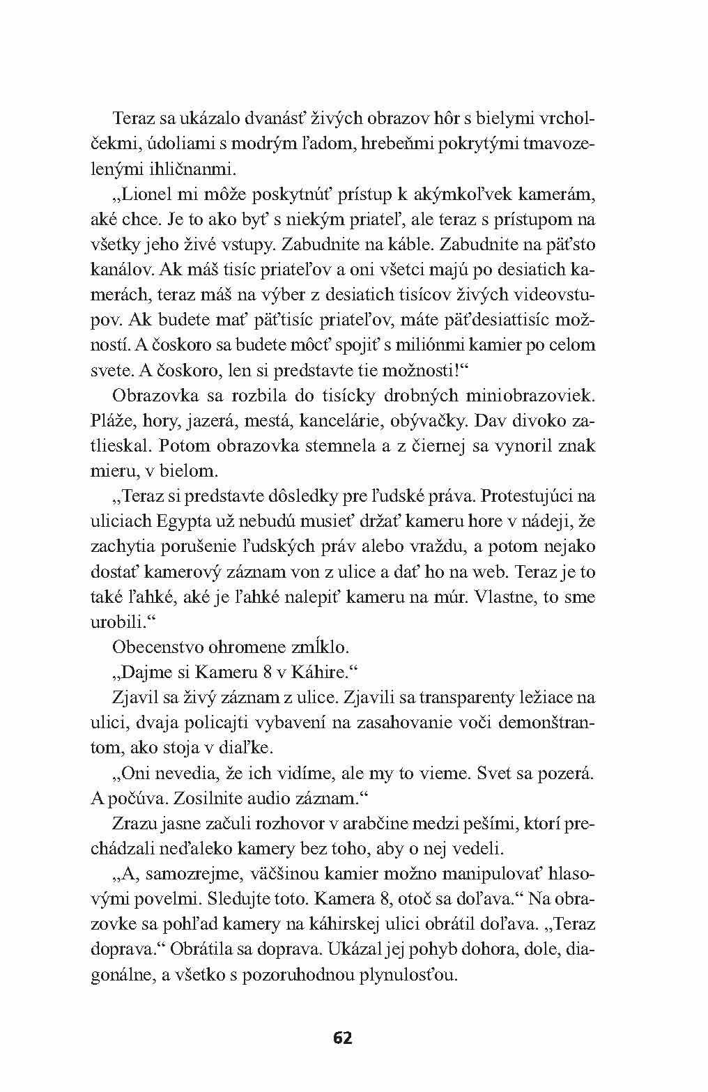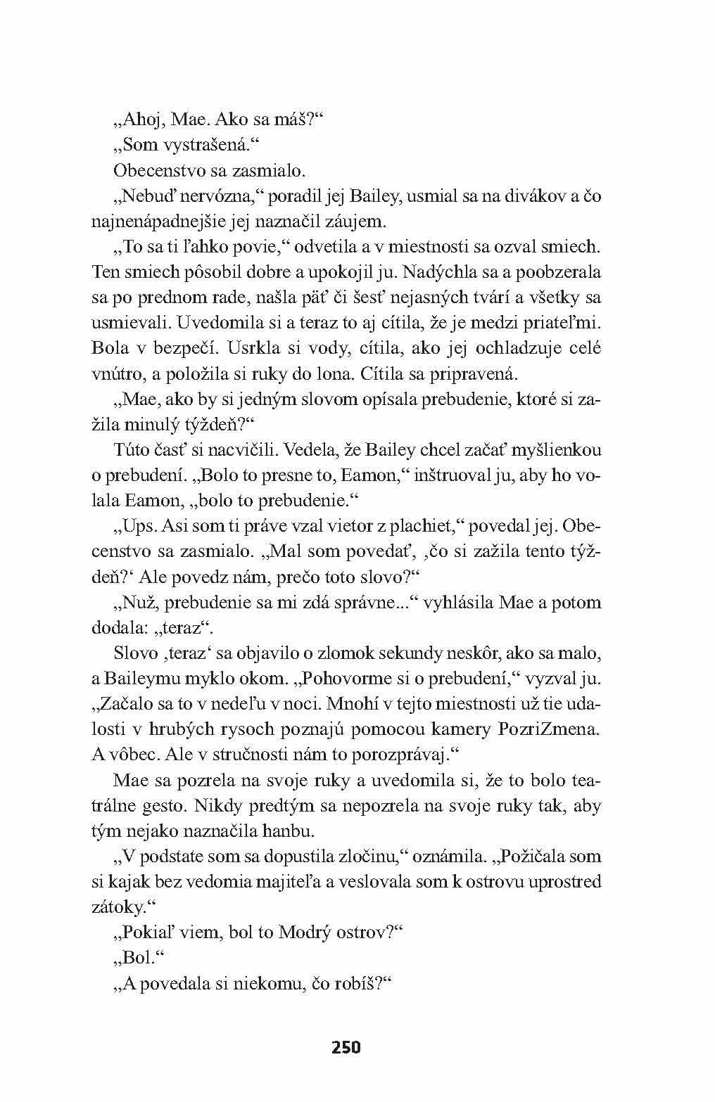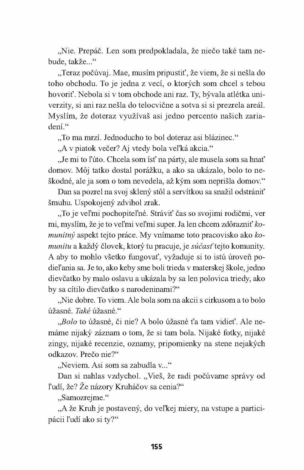 Za šera sa začalo zhromažďovať pár tisíc Kruháčov. Keď Mae stála medzi nimi, vedela, že nikdy nechce pracovať – nikdy nechce byť – nikde inde. Jej rodné mestečko a zvyšok Kalifornie vyzeral ako chaotický zmätok uprostred rozvojového sveta. Za múrmi Kruhu bol samý hluk a boj, sklamania a špina. Ale tu bolo všetko perfektné.“