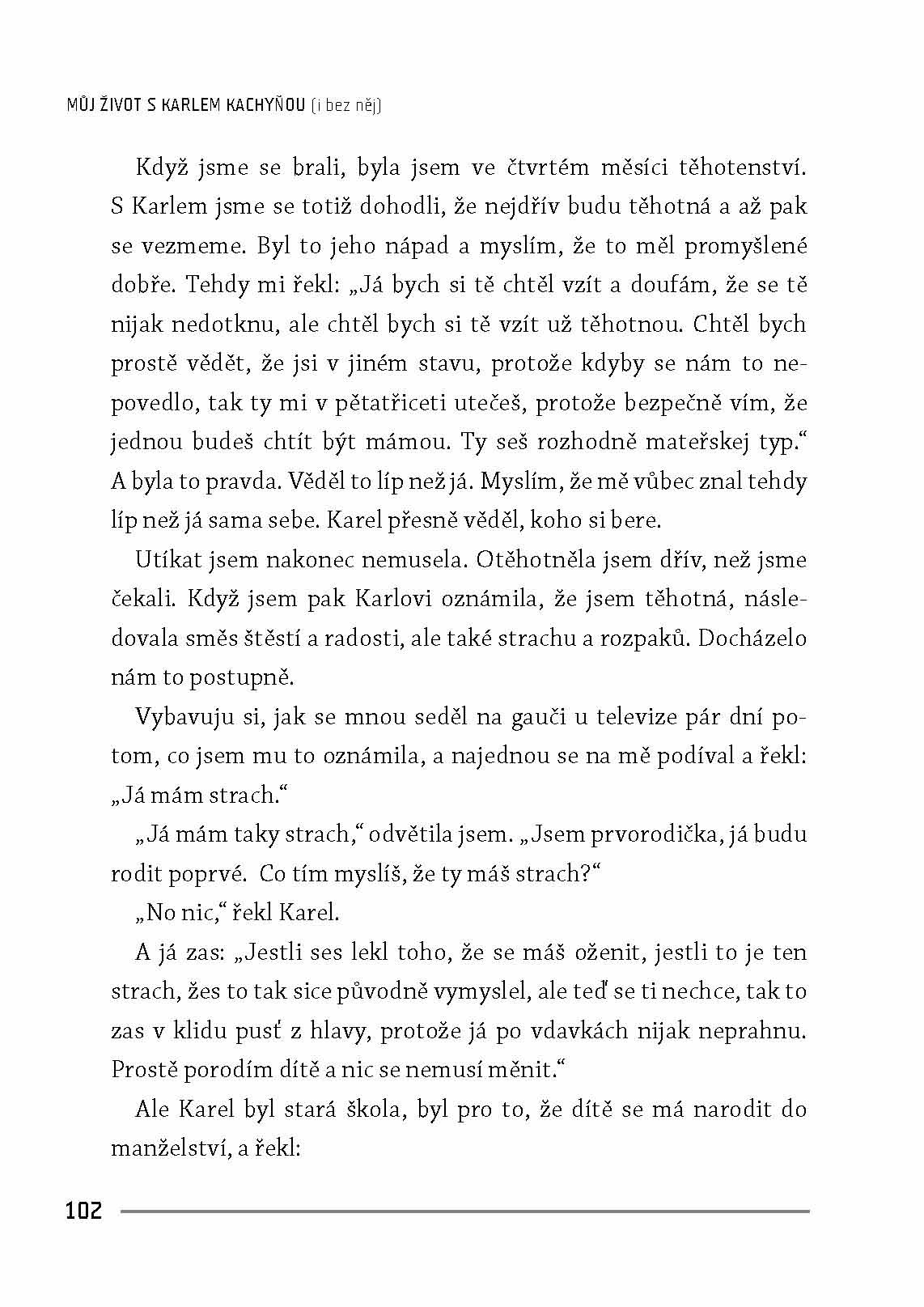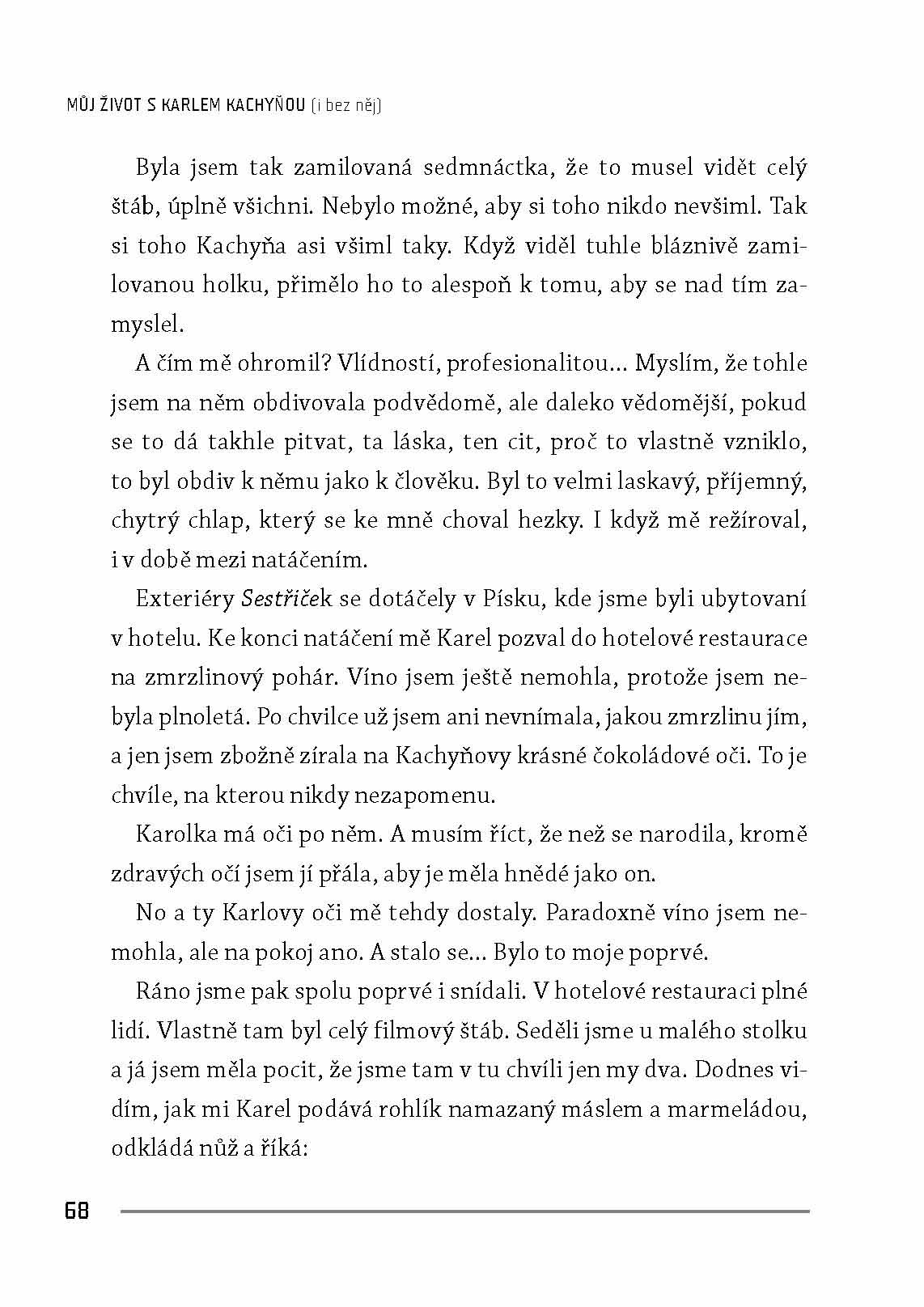 Ve své otevřené autobiografii odhaluje herečka mnoho ze svého soukromí, s láskou líčí společný život s Karlem Kachyňou a popisuje svoji hereckou kariéru se všemi zdary i nezdary. Ačkoliv by se mohlo zdát, že se na ni po smrti jejího manžela pozapomnělo, dál se objevuje v úspěšných filmech a seriálech. Její portrét proto dokreslují vzpomínky hereckých kolegů a dosud nezveřejněné fotografie jak ze soukromého, tak z profesního života.