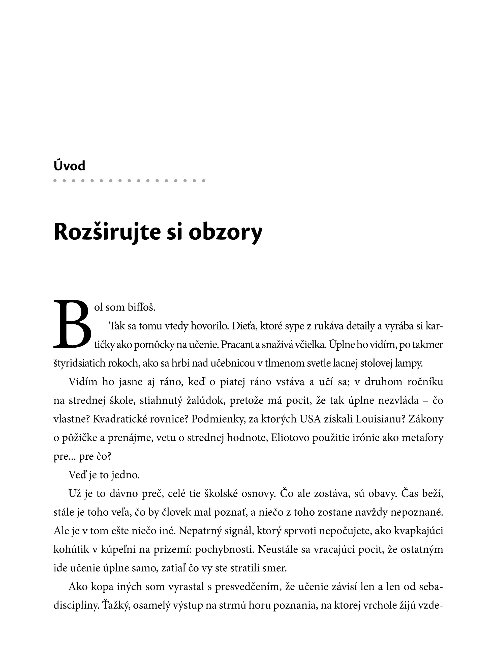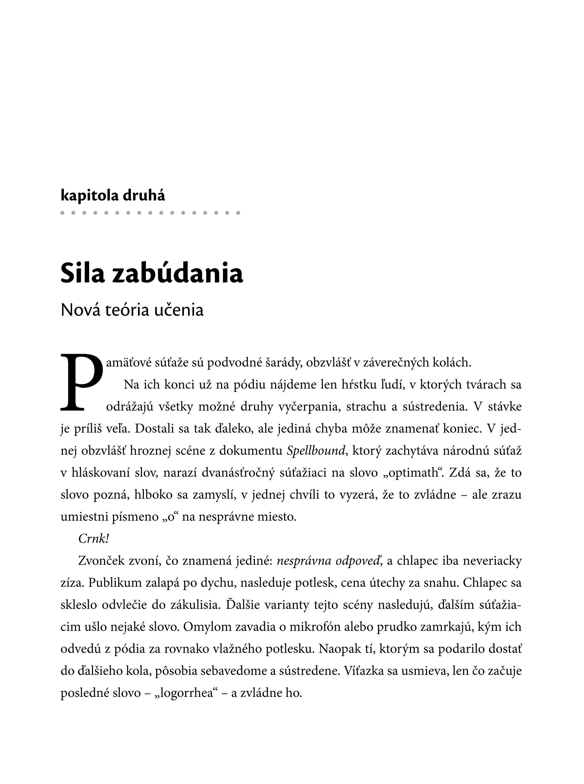 Všetko je vraj inak, než sme si mysleli. Učenie môžeme praktizovať oveľa jednoduchšie a príjemnejšie a výsledky dosiahneme s menším úsilím, ako sme zvyknutí. Ticho, pokoj, sústredenie sa len na jednu vec a bifľovanie? Kdeže! Pokojne si môžeme pustiť hudbu a robiť päť vecí naraz. Náš mozog si s tým hravo poradí a ešte nás odmení tým, že si budeme pamätať viac. Len musíme vedieť, ako naň!