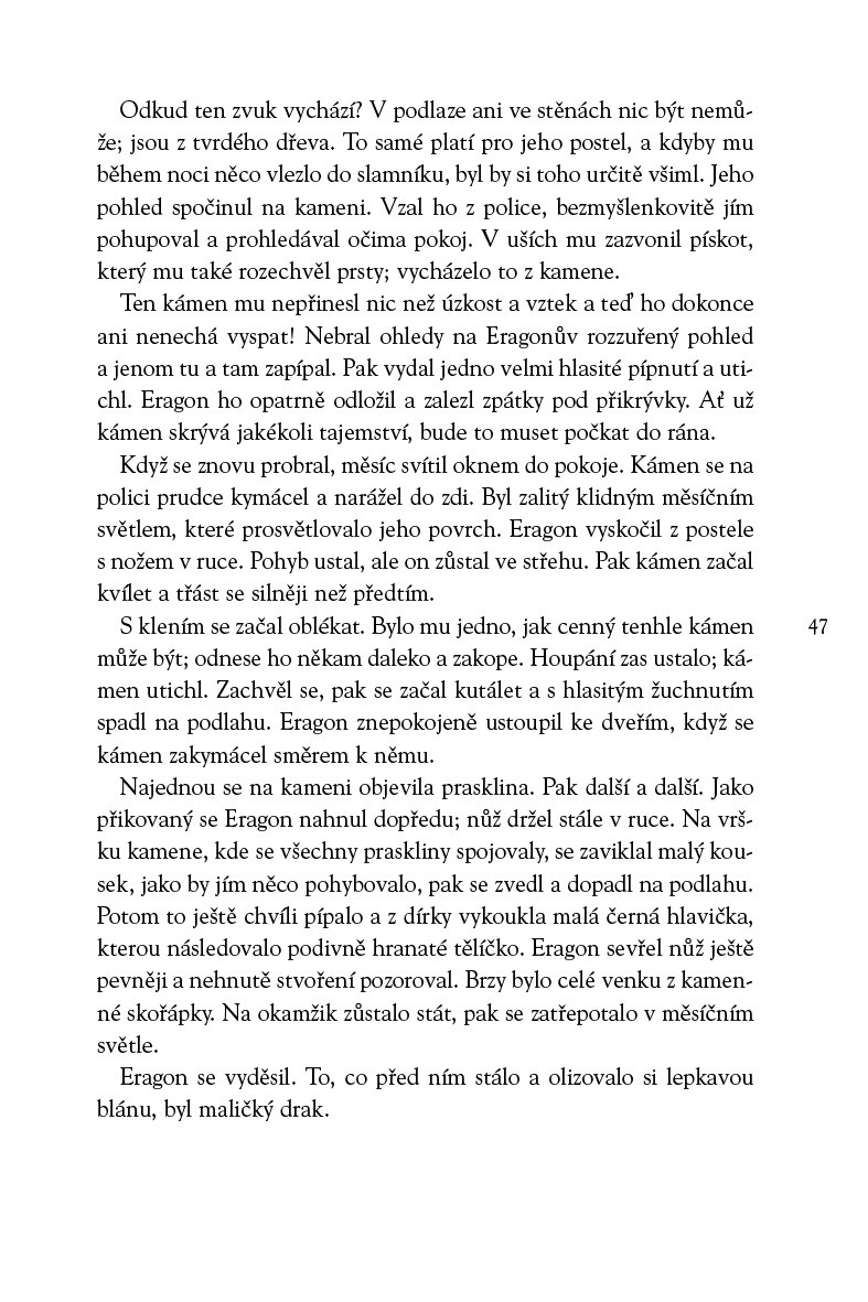 Jeden chlapec, jeden drak, svět dobrodružství. Fantasy bestseller Eragon z pera patnáctiletého Christophera Paoliniho, který nadchl miliony čtenářů po celém světě. Vypráví příběh chudého farmářského chlapce, který najde v Dračích horách modrý kámen, z něhož se vyklube dračí mládě - Safira. Spolu se vydají na nebezpečnou cestu královstvím ovládaným králem, jehož zlo nezná mezí. Dokáže Eragon naplnit své předurčení a převzít břímě legendárních Dračích jezdců? Osud království možná leží v jeho rukou... První díl tetralogie Odkaz Dračích jezdců.