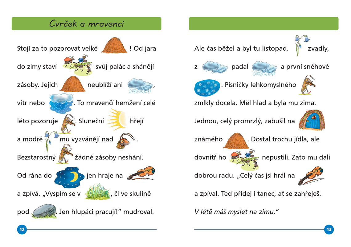 Krátké příběhy pro děti, ve kterých jsou některá slova nahrazena obrázky. Začínající čtenáři mohou procvičovat čtení a ti, kteří ještě písmenka neznají, mohou číst pomocí obrázků.