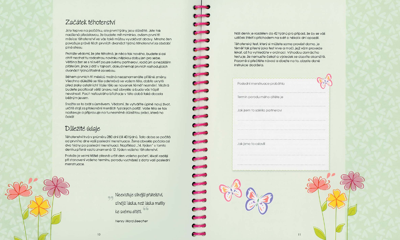 Tento krásný deník přináší dostatek prostoru pro vaše poznámky, zápisky a fotografie. Součástí jsou i praktické informace a doporučení k jednotlivým týdnům těhotenství. Dozvíte se, jak miminko roste, jaká vás čekají vyšetření, jak zdravě jíst nebo jakým aktivitám se vyhnout.