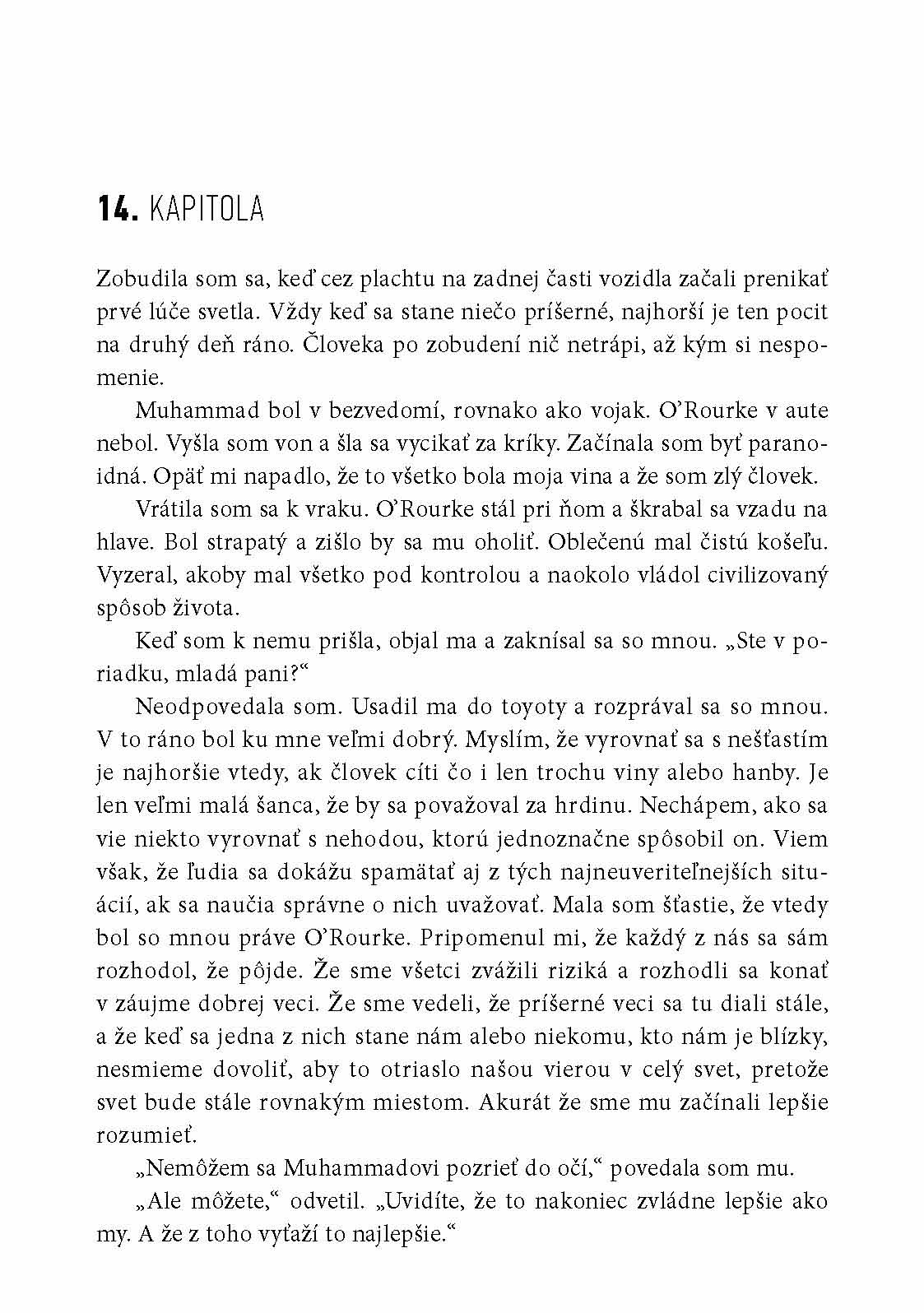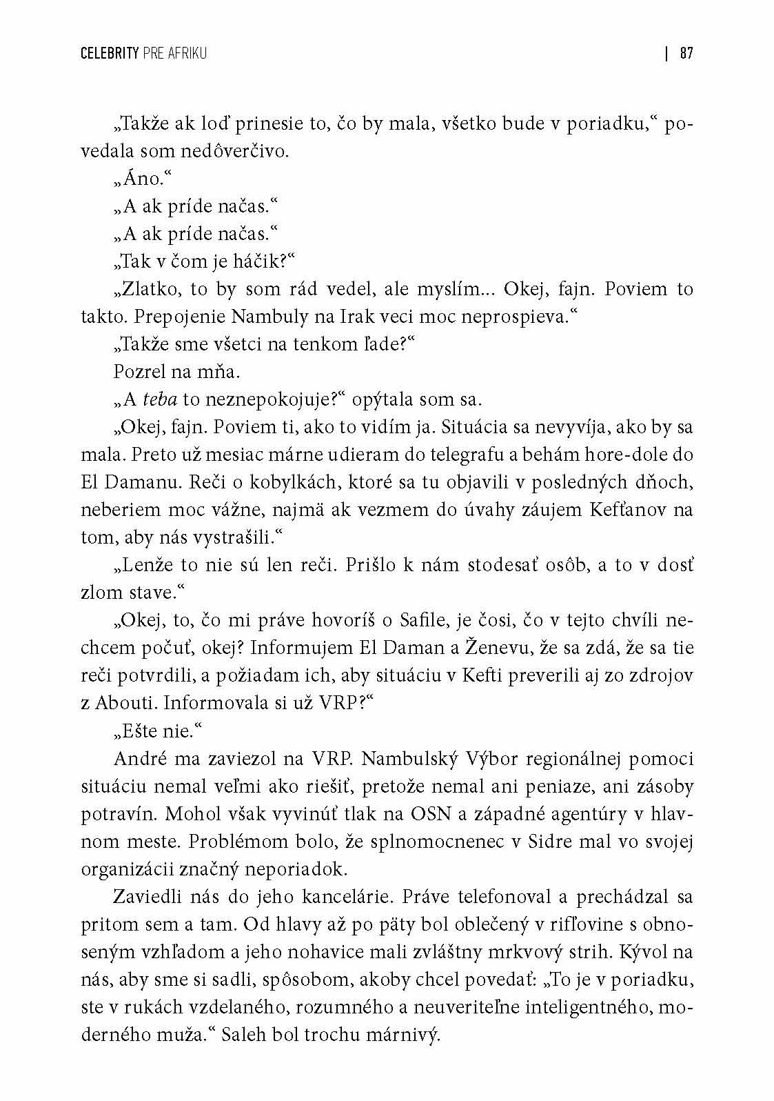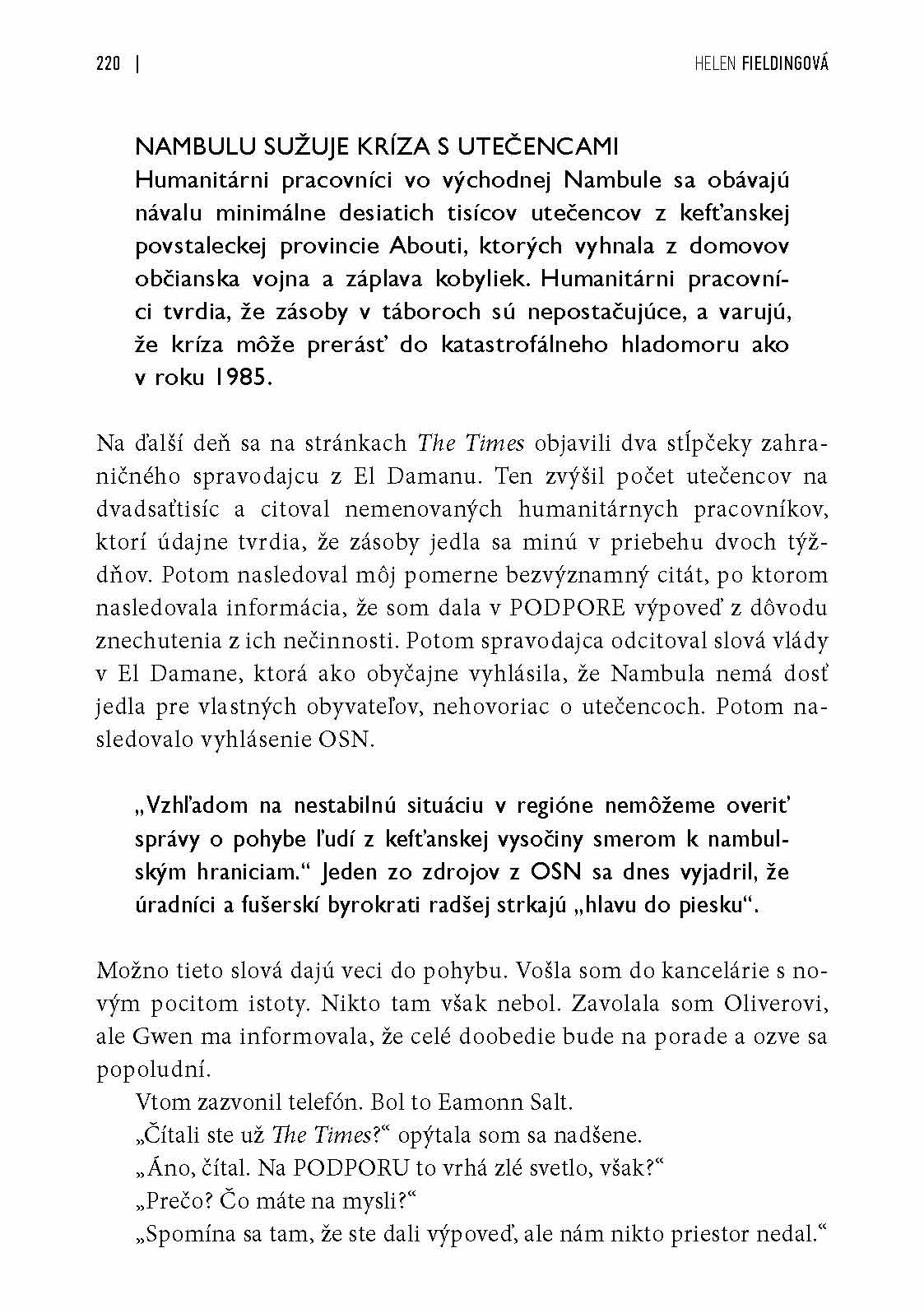 „V noci prišlo ďalších tridsať utečencov a vysielačka ráno stále nefungovala. Neostávalo mi nič iné, ako sa vybrať do hlavného mesta a poriadne pritlačiť na Malcolma a OSN. Predpokladala som, že sa k nim už informácie dostali, akurát neodhadli, aká vážna bola situácia."