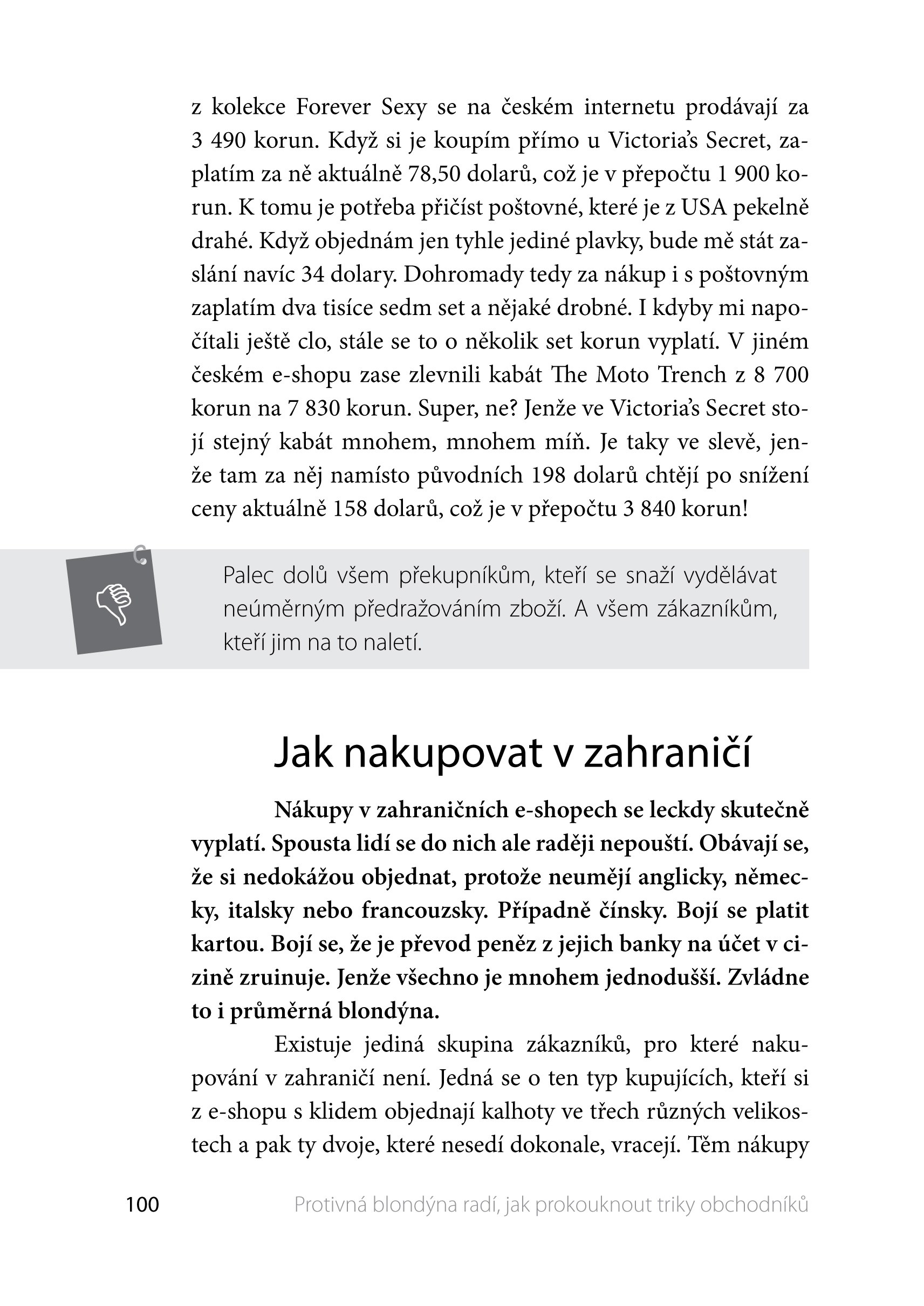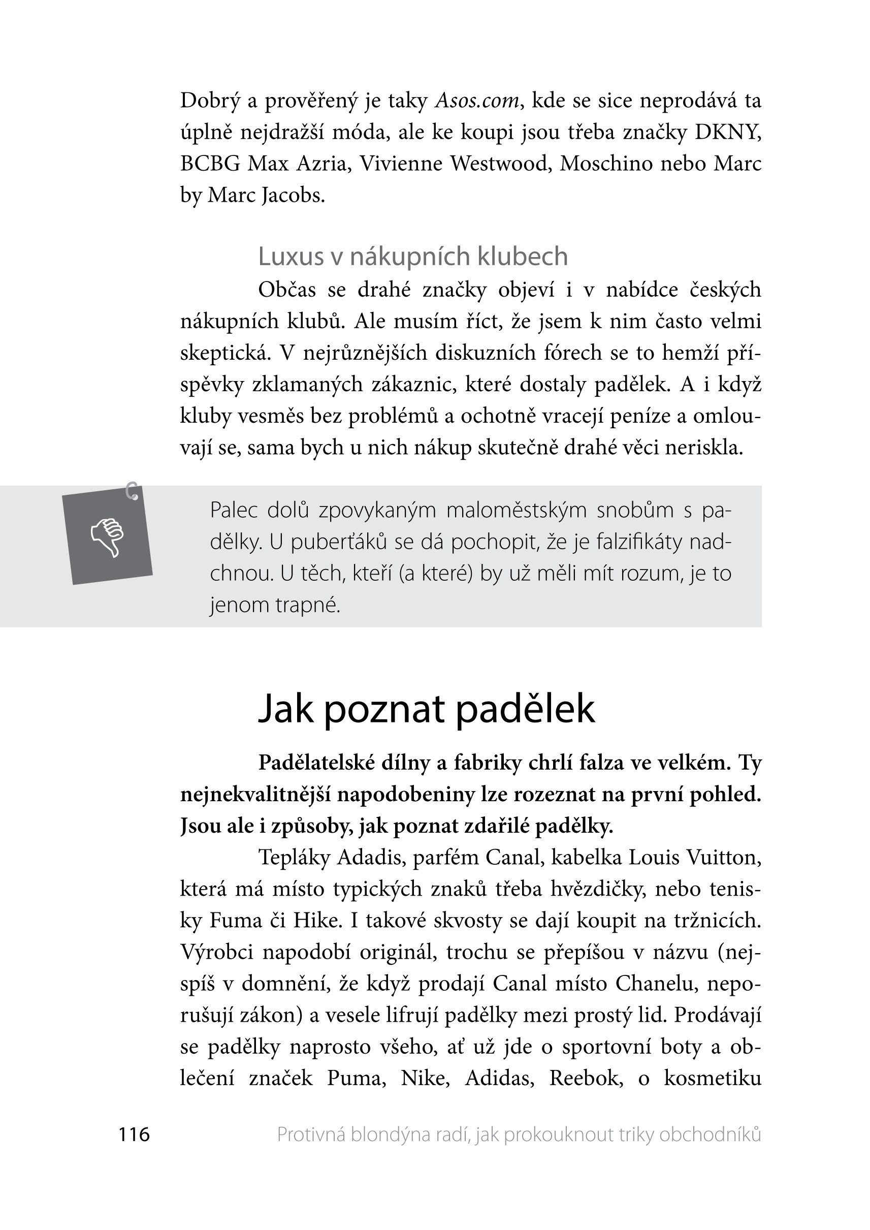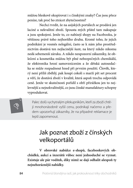 Kniha tvoří soubor nejzajímavějších a nejčtenějších článků z blogu Protivná blondýna (www.protivna-blondyna.cz), jehož autorka již léta pranýřuje nepoctivé prodejce, podvodníky a další škodnou v obchodním revíru. Její testy výrobků, varovné příběhy i úsměvné historky si každý měsíc přečtou tisíce návštěvníků webu. V letech 2012 a 2013 obsadil tento blog třetí místo v anketě Křišťálová Lupa v kategorii One (wo)man show.
