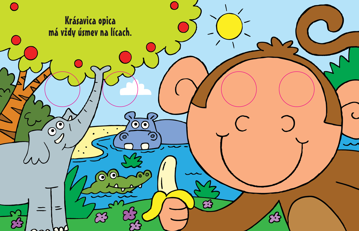 Prestrčte prsty dierkami a oživte hravé očká zvieratiek z džungle! Zagúľajte očami vpravo aj vľavo a poriadne sa po džungli rozhliadnite. Na chvíľu sa stanete krokodílom, opicou alebo hrochom a môžete prevracať oči nad tým, čo tieto zvieratká všetko vidia.