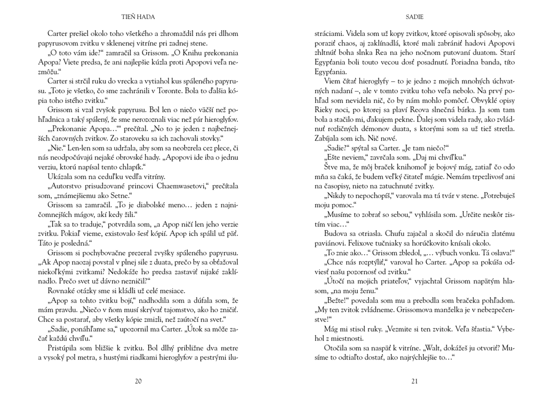 Som Carter Kane a posledný rok, čo sme so sestrou Sadie prežili, bol veru poriadne rušný. Pred očami nám ožila doslova celá egyptská mytológia so svojimi bohmi a netvormi. Preniknúť do tajomstva egyptskej mágie takisto nie je žiadna hračka. Najťažšie prekážky nás však ešte len čakajú. Zlé sily získavajú prevahu, had chaosu Apop unikol zo svojho väzenia a časť rebelských mágov povstáva proti Domu života. Na záchranu sveta nám zostávajú už len tri dni a rozhodujúca bitka sa blíži...