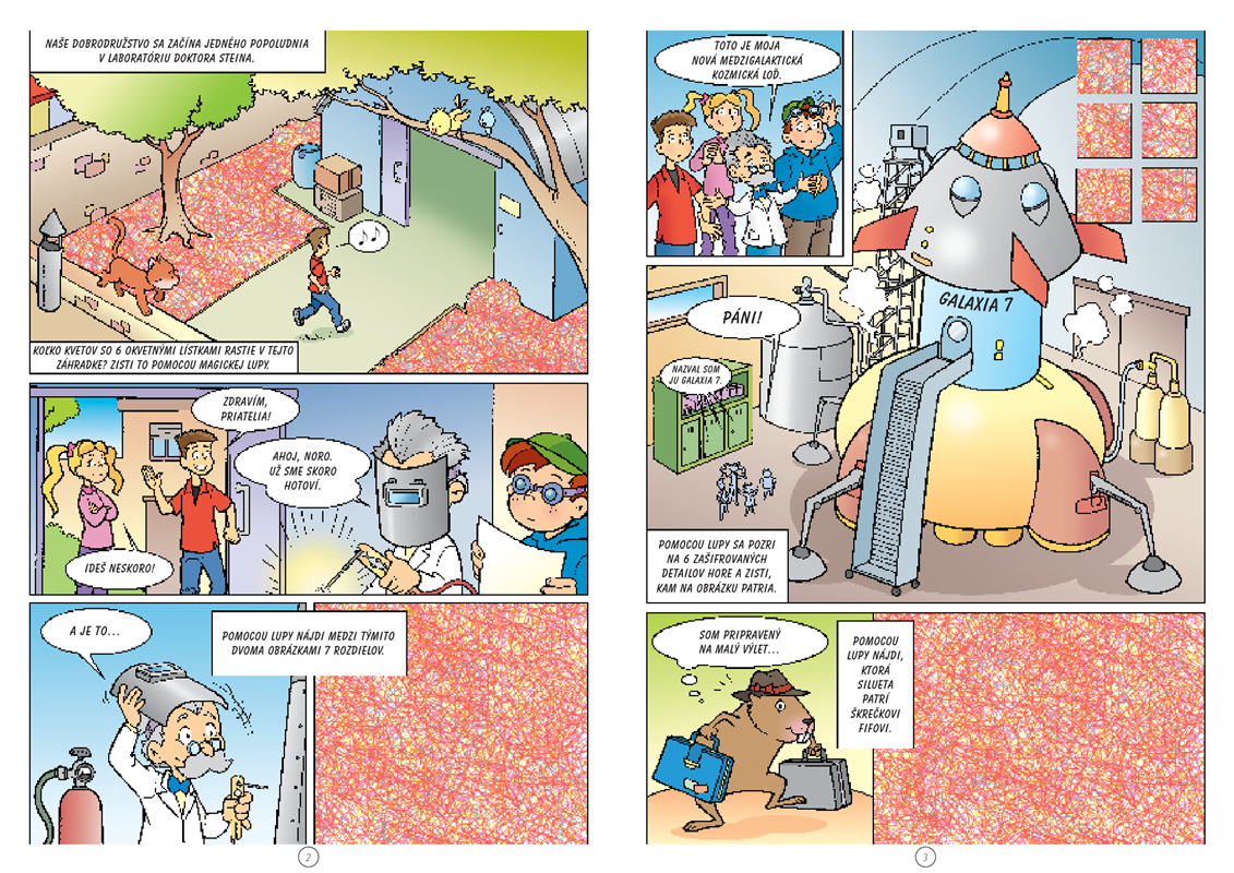 Vyber sa na úžasnú dobrodružnú cestu vesmírom! Spolu s Norom, Erikom a Miškou budeš riešiť záhady, lúštiť šifry, prechádzať bludiskami, skladať obrázky alebo medzi nimi objavovať odlišnosti. Nepotrebuješ žiadnu batožinu ani cestovný pas, pomôže ti magická lupa, logické myslenie, fantázia a vynachádzavosť.