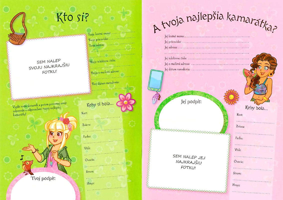 Vyplňte tento kamarátniček spolu so svojou najlepšou kamoškou. Odpovedzte na otázky, aby ste zistili, či sa navzájom dobre poznáte. Nalepte sem fotografie, ktoré zachytávajú vaše spoločné zážitky. Nájdete tu nápady, ako spoločne stráviť voľné chvíle - pyžamová párty, spoločenské hry, recept na nejakú maškrtu, niečo na lúštenie a, samozrejme, test, ktorý vám odhalí skutočnú silu vášho priateľstva.