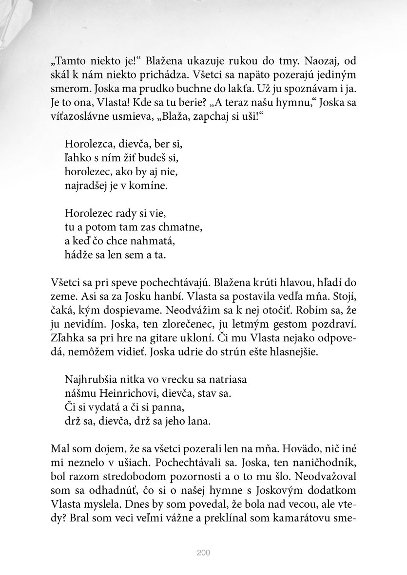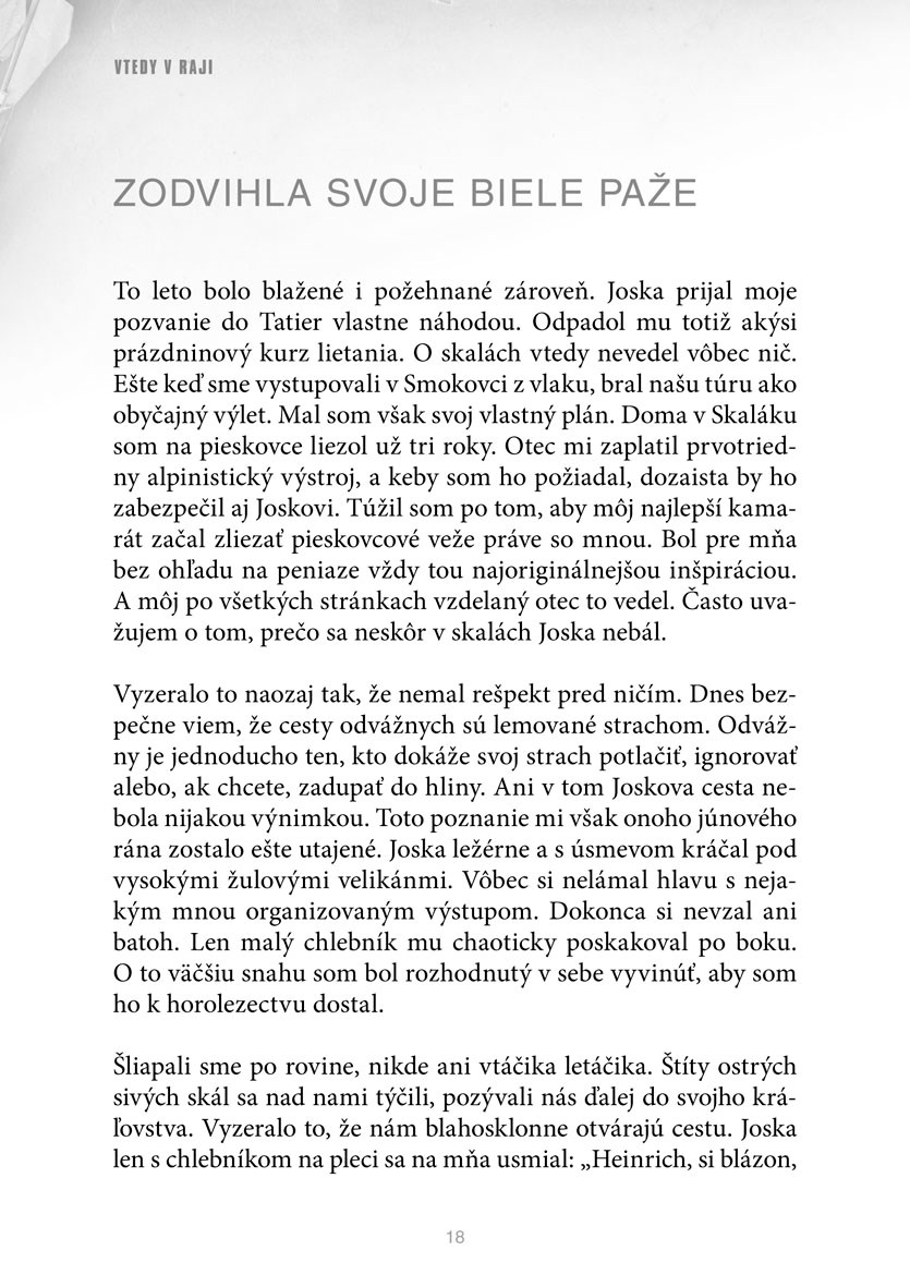 Román o osudoch legendárneho horolezca Josku Smítka nás zavedie do divokých skál Českého raja v období tridsiatych rokov a okupácie. Príbeh rozpráva nielen o strmých cestách v pieskovcových stenách, ale predovšetkým o krivolakej ceste k slobode. Za neobvyklé pohľady na svet a prežívanie harmónie sa platí cena prevysoká. Aj za osudovú lásku, ktorá hlavného hrdinu doženie k extrémnemu rozhodnutiu. Zrážka s okupačnou mocou dodáva príbehu fatálny charakter. V zápase o slobodu a o vysnívanú ženu je hranica medzi priateľstvom a nenávisťou niekedy tenšia ako list nepopísaného papiera.