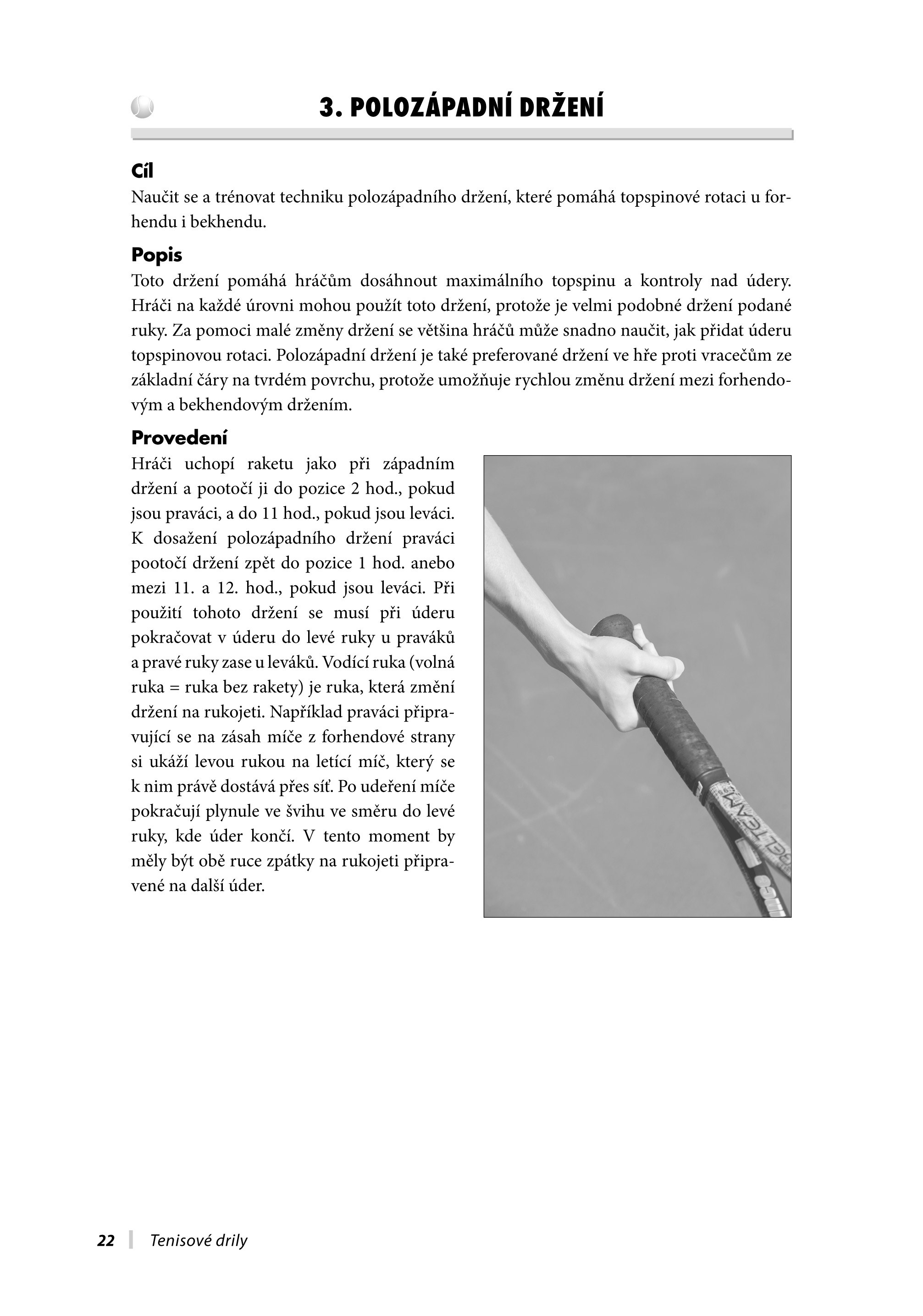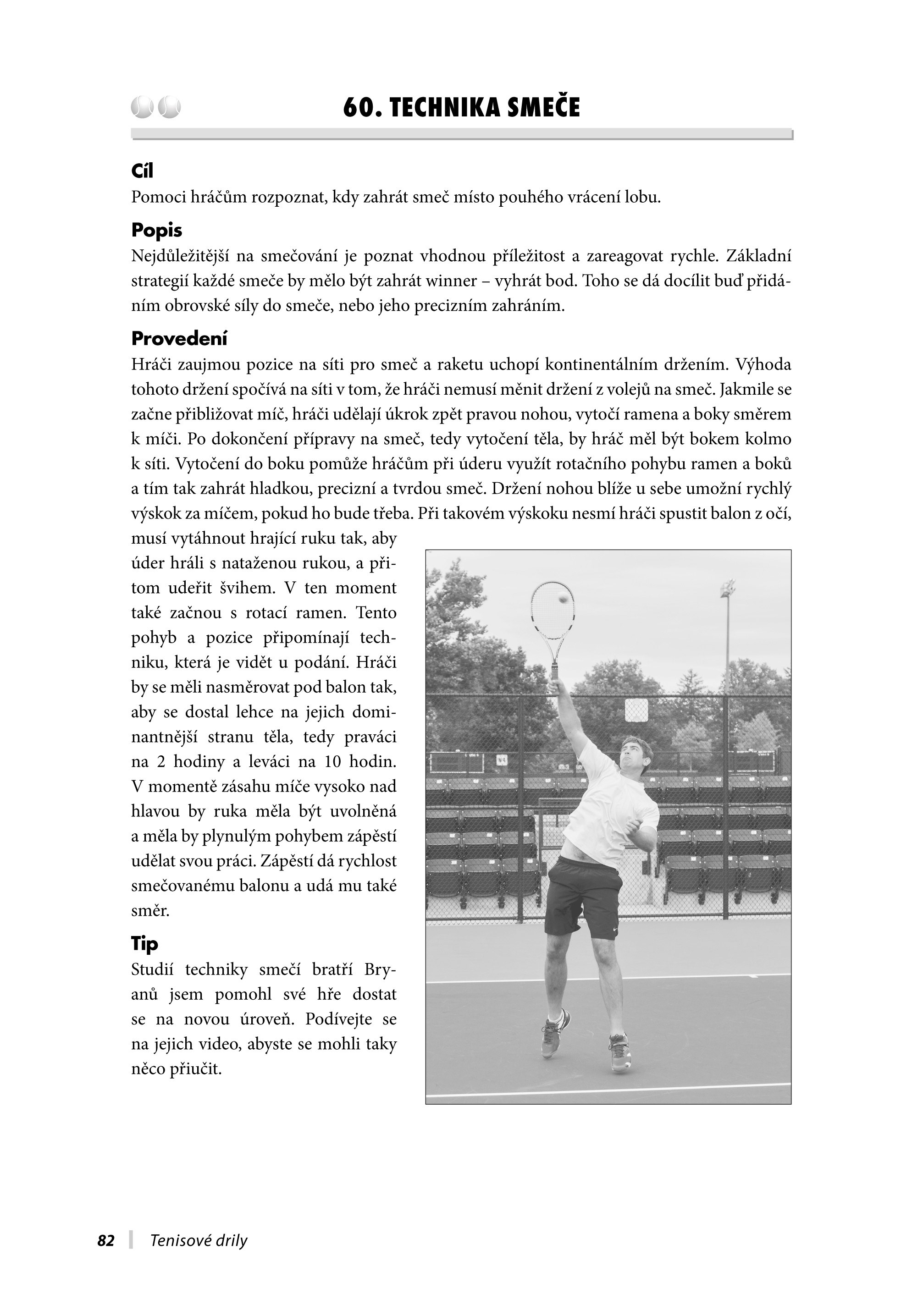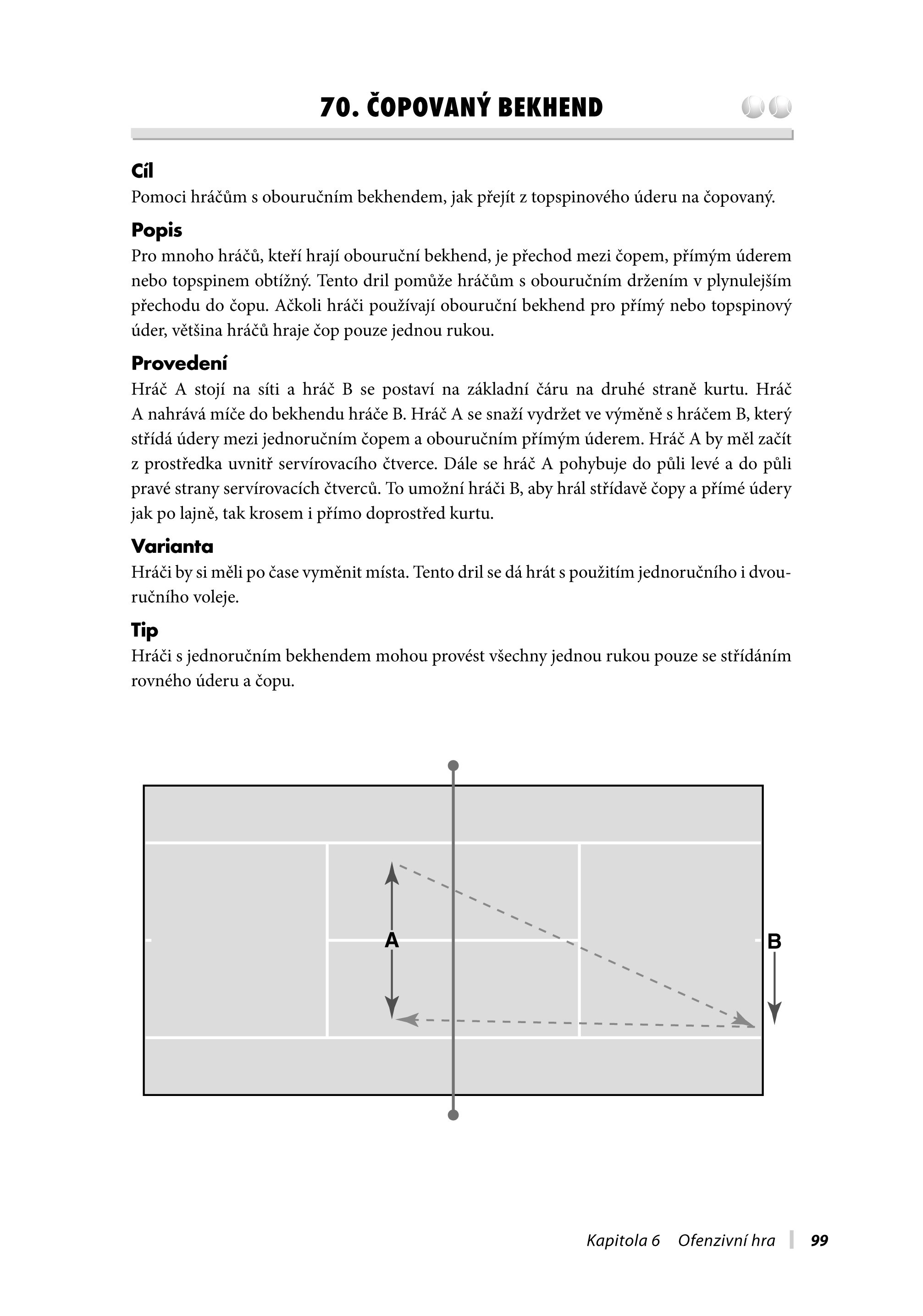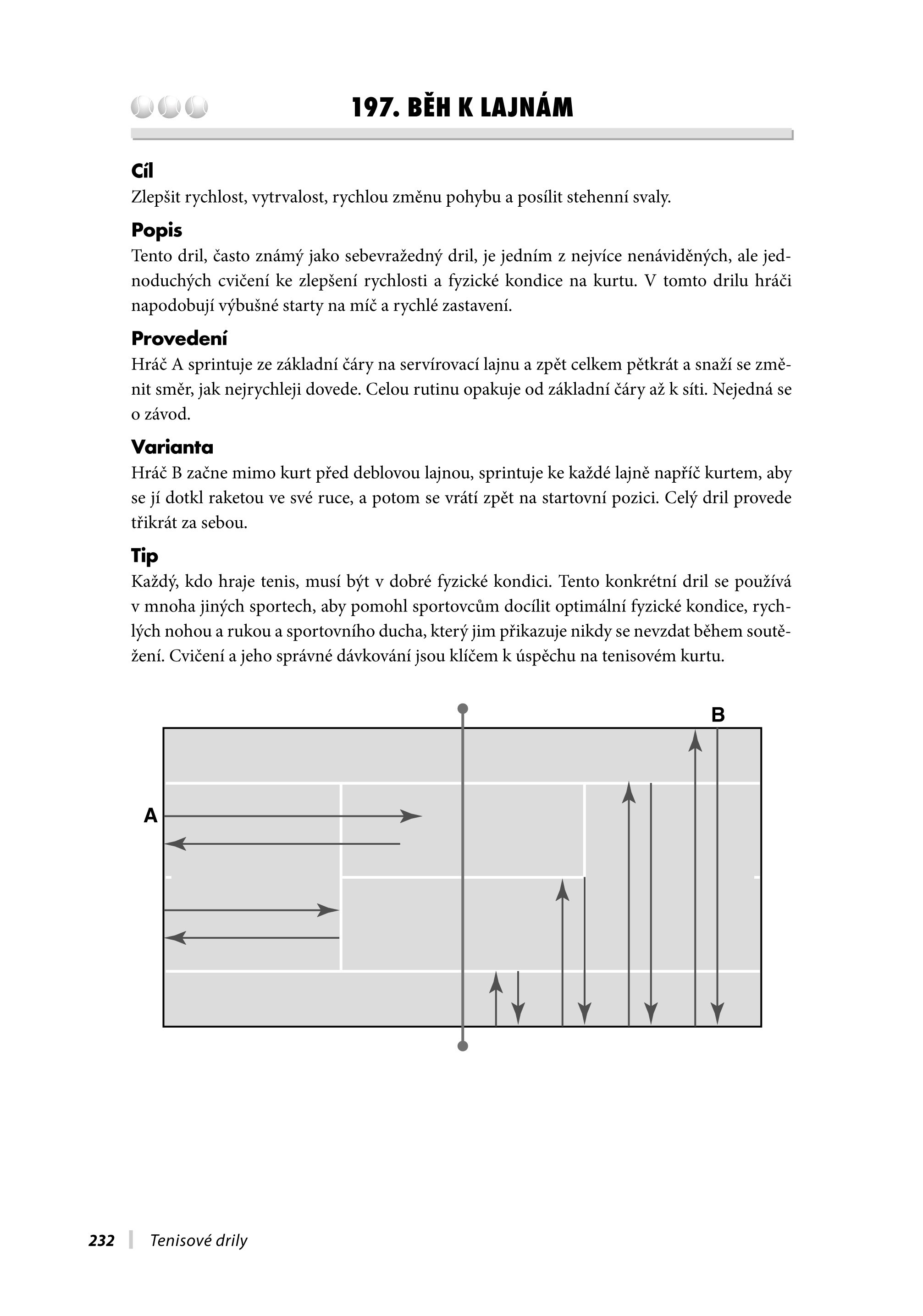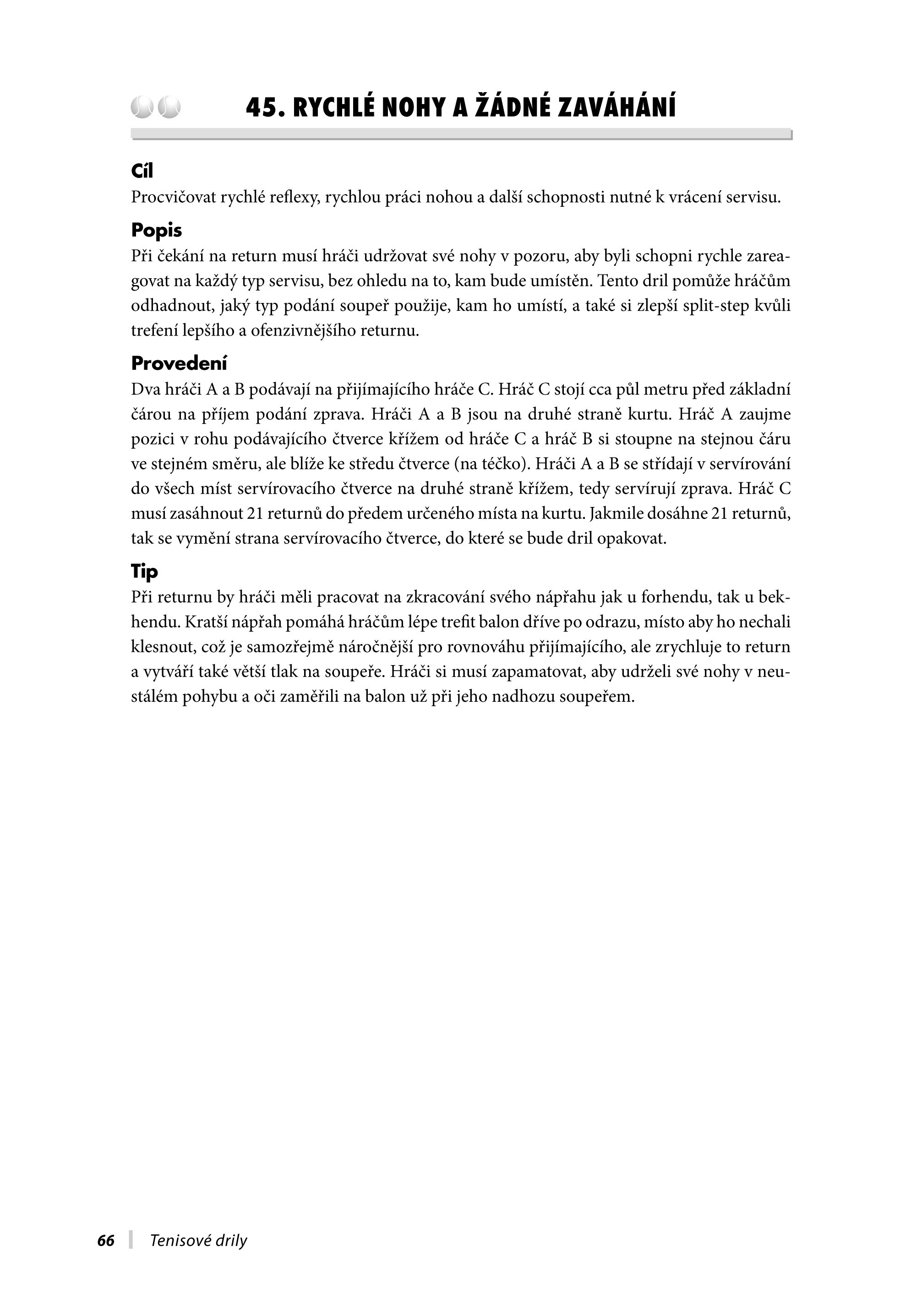 Je uspořádaná tak, abyste vždy snadno a rychle našli ten správný dril podle dovednostní úrovně hráče. Zahrnuje kapitoly, které přiblíží soutěžní zápasy, drilová cvičení pro singly a debly, údery, strategii, simulaci náročných zápasů a přípravu na kurtu i mimo něj pro malé děti, juniory a dospělé. Jste-li hráč, můžete si vybrat ze široké škály drilů, a to jak pro vaši hru se sparingem, týmovým hráčem, kamarádem, tak i pro hru se starou dobrou zdí. Naleznete zde drily pro trénování jednotlivých úderů, pro styly hry, jako je například servis-volej, nebo pro hraní proti určitému hernímu stylu.