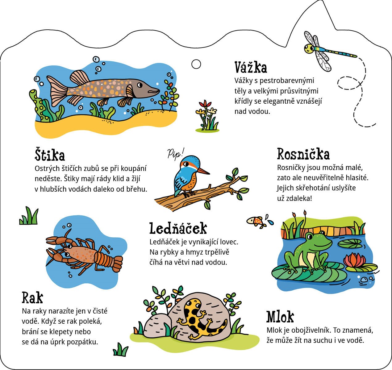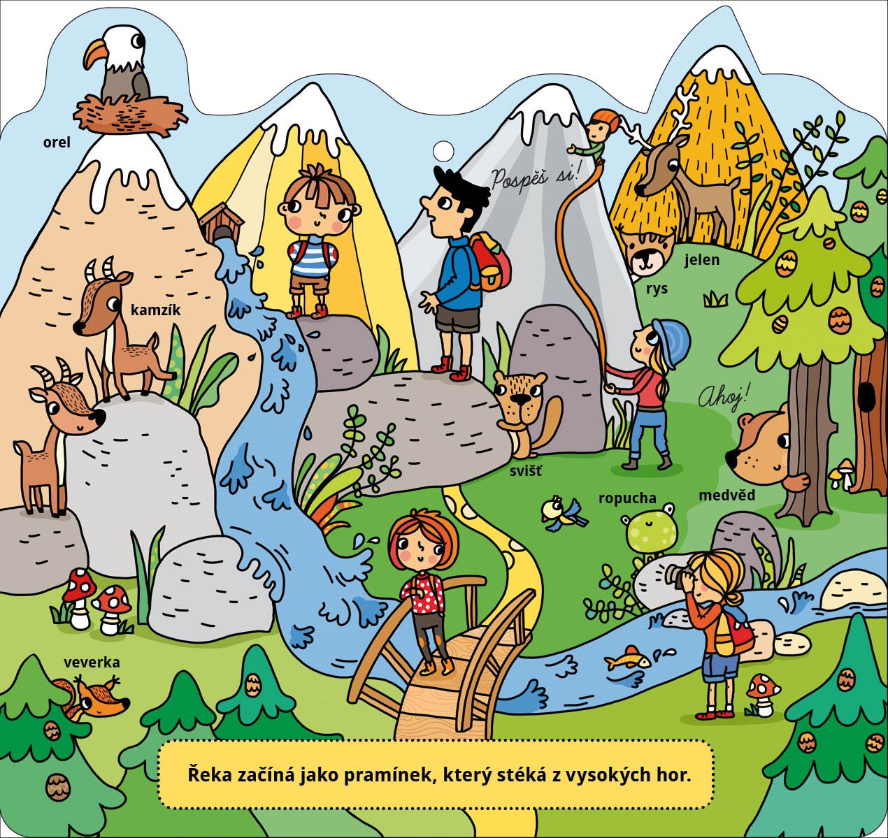 Teče poblíž vašeho domu řeka? A napadlo tě, kde začíná a kde končí? Rozlož si tuto knížku a můžeš její příběh sledovat od nenápadného pramene, který se nachází v lese či v horách, přes potůček, říčku, veletok a přehradu až do chvíle, kdy se stane součástí moře. Dozvíš se, jak postupně sílí, co se děje v jejím okolí, poznáš zvířata, která žijí ve vodě či v její blízkosti,