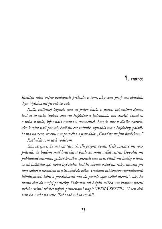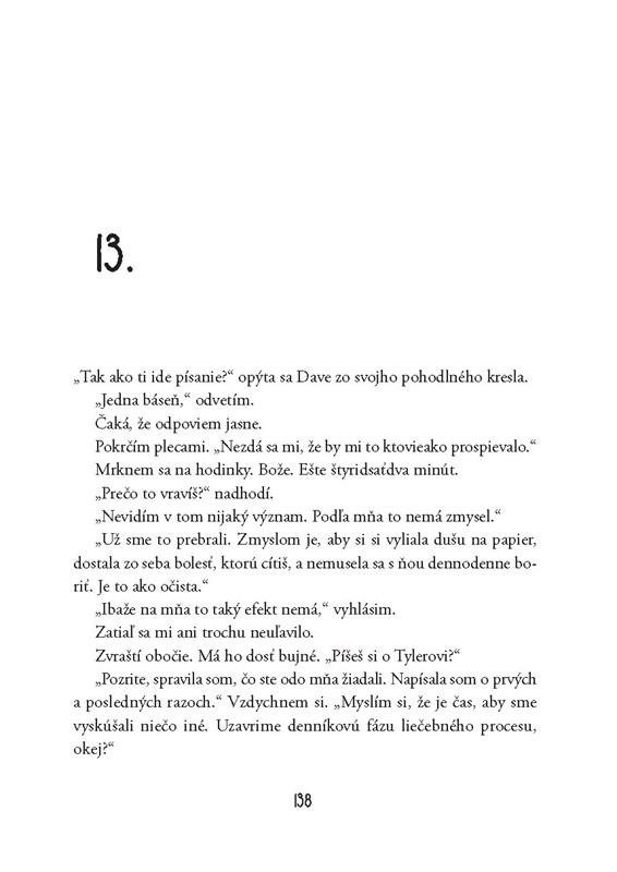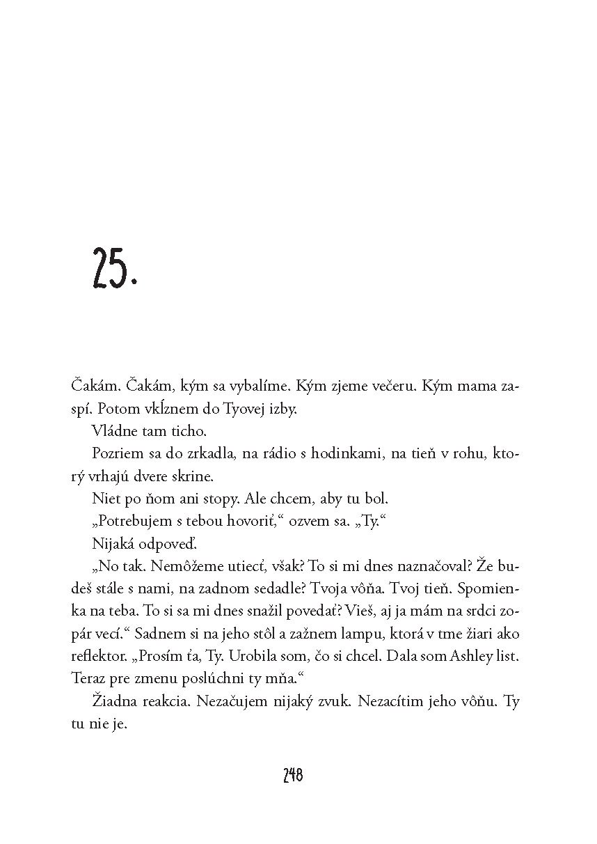 Kedysi bola Lexie naozaj šťastná – mala skvelého priateľa, chápavých rodičov a pohodového brata, s ktorým si vždy užila kopec zábavy a za každých okolností sa naňho mohla spoľahnúť. Patrila medzi najlepšie študentky a nechýbali jej ani kamaráti s podobnými záujmami. Všetko jednoducho klapalo. Teraz je z nej však len dievča, ktorého brat je mŕtvy. Lexie sa snaží dať svojmu životu po smrti Tya nový zmysel, no len ťažko sa jej darí prehrýzať vlastným smútkom a výčitkami. Napokon však objaví odkaz, ktorý Ty po sebe zanechal a ktorý by azda všetkým jeho blízkym mohol pomôcť urobiť krok ďalej.
