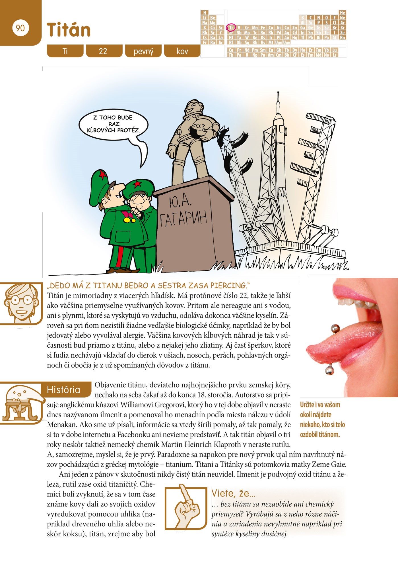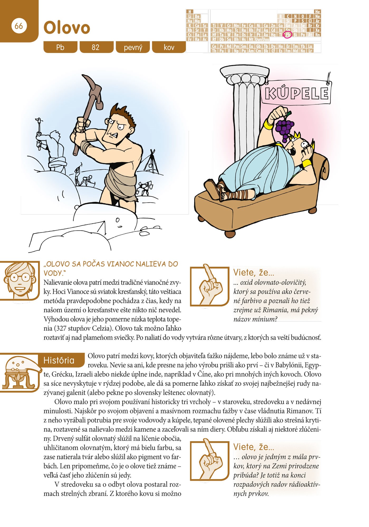 Chemické prvky tvoria našu potravu, naše telá, predmety v dielni, kúpeľni, komore... Mnohé nájdeme aj tam, kde by sme ich vôbec nečakali. Ich objavovanie, výroba i používanie majú navyše zaujímavú históriu aj súčasnosť. V tejto knihe je ich viac ako štyridsať. A sú to práve tie, ktoré sa najčastejšie objavujú v školských vzdelávacích programoch slovenských škôl, a teda aj v písomkách. Poďme sa s nimi zoznámiť bližšie...