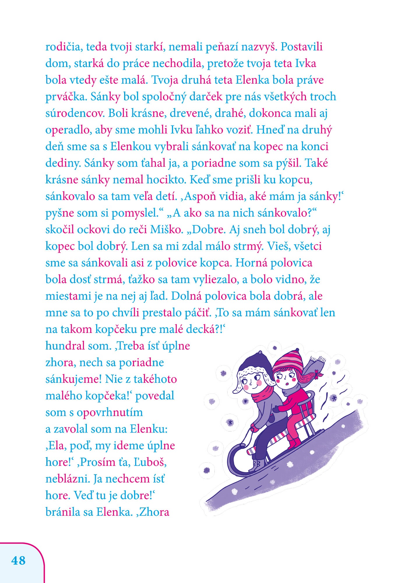 Texty v knižke sú vytlačené veľkými písmenami a dvojfarebne, rozdelené po slabikách.
