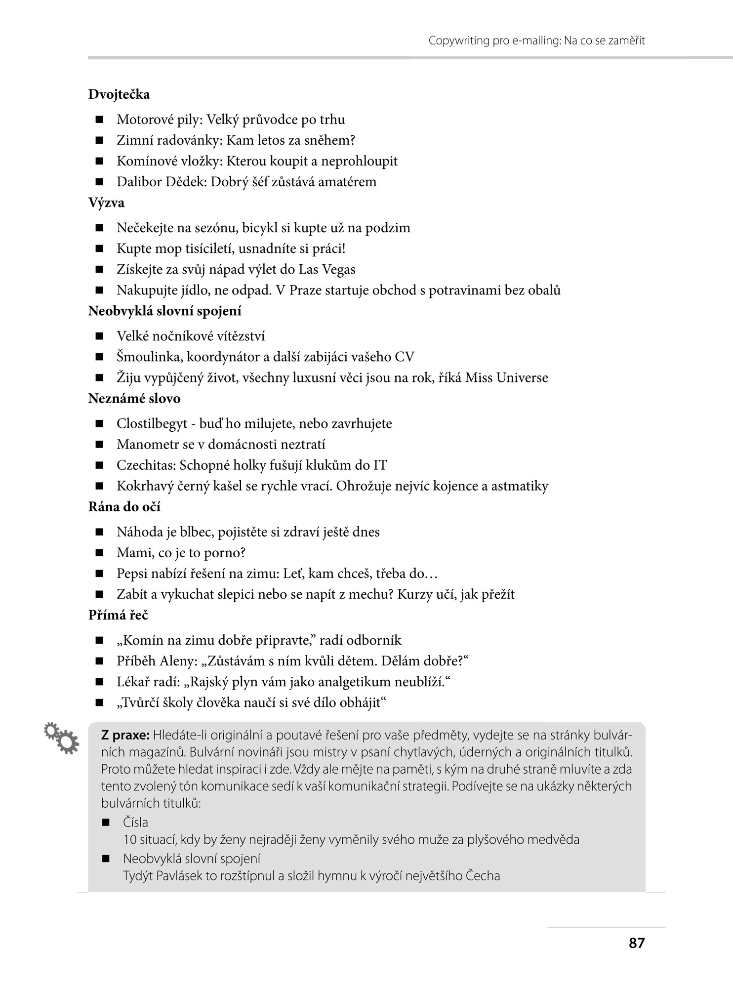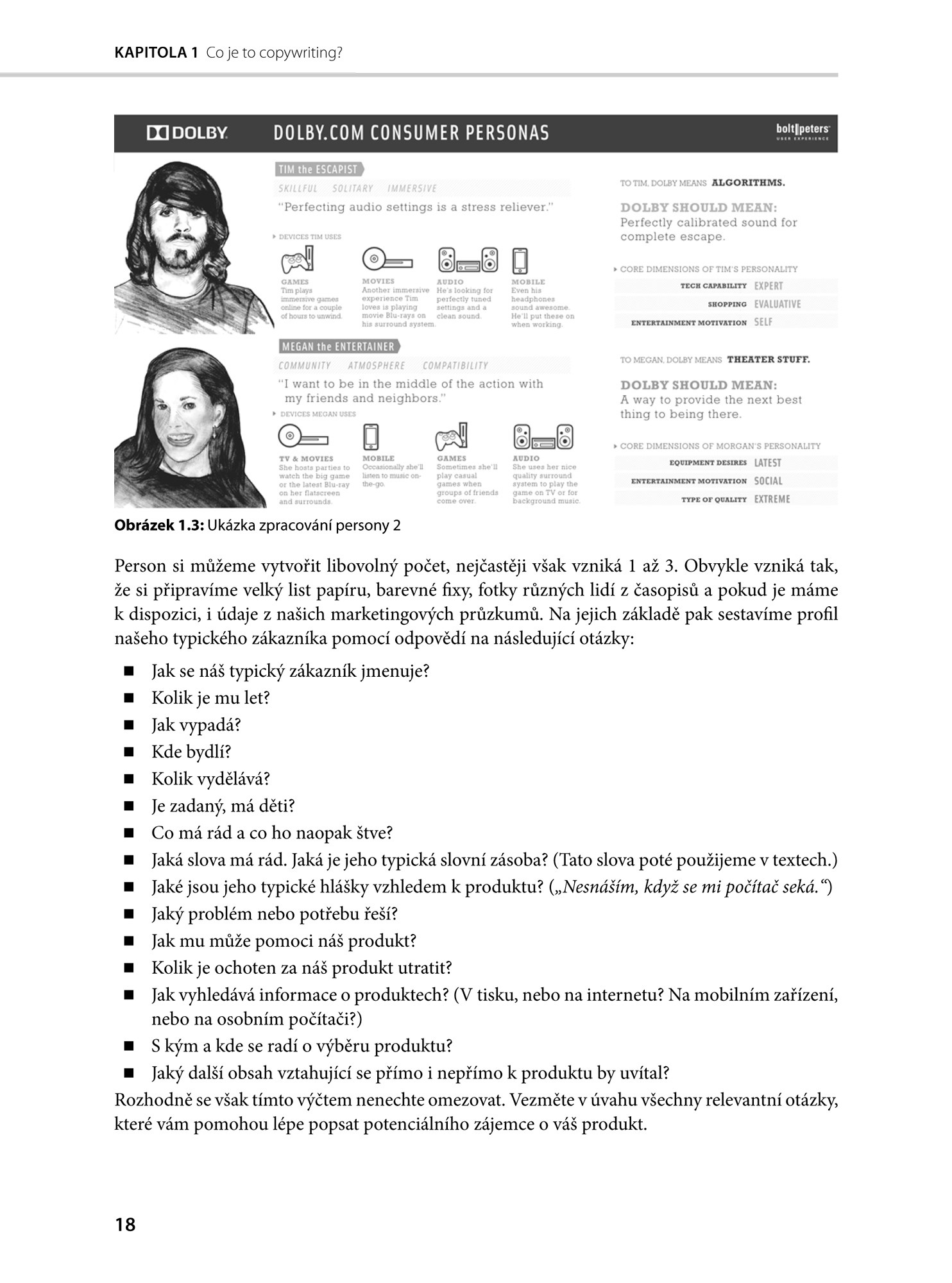 Trúfate sa zamestnať ako copywriter no stále nemáte jasno čo obnáša byť copywriterom? Práve tejto téme venujú pozornosť kapitoly s názvom Co je copywriting a Profil profesionálního copywritera. Okrem podrobného popisu pojmu copywriting sa autori v kapitolách zamerali na základy marketingu a reklamy, ktoré by mal poznať každý copywriter. Predstavia aj koncepty ADAM (Attention Interest Desire Action) a AIDA (Attention Desire Action Memory), ktoré napomáhajú bližšie porozumieť rozhodovaciemu procesu zákazníka.