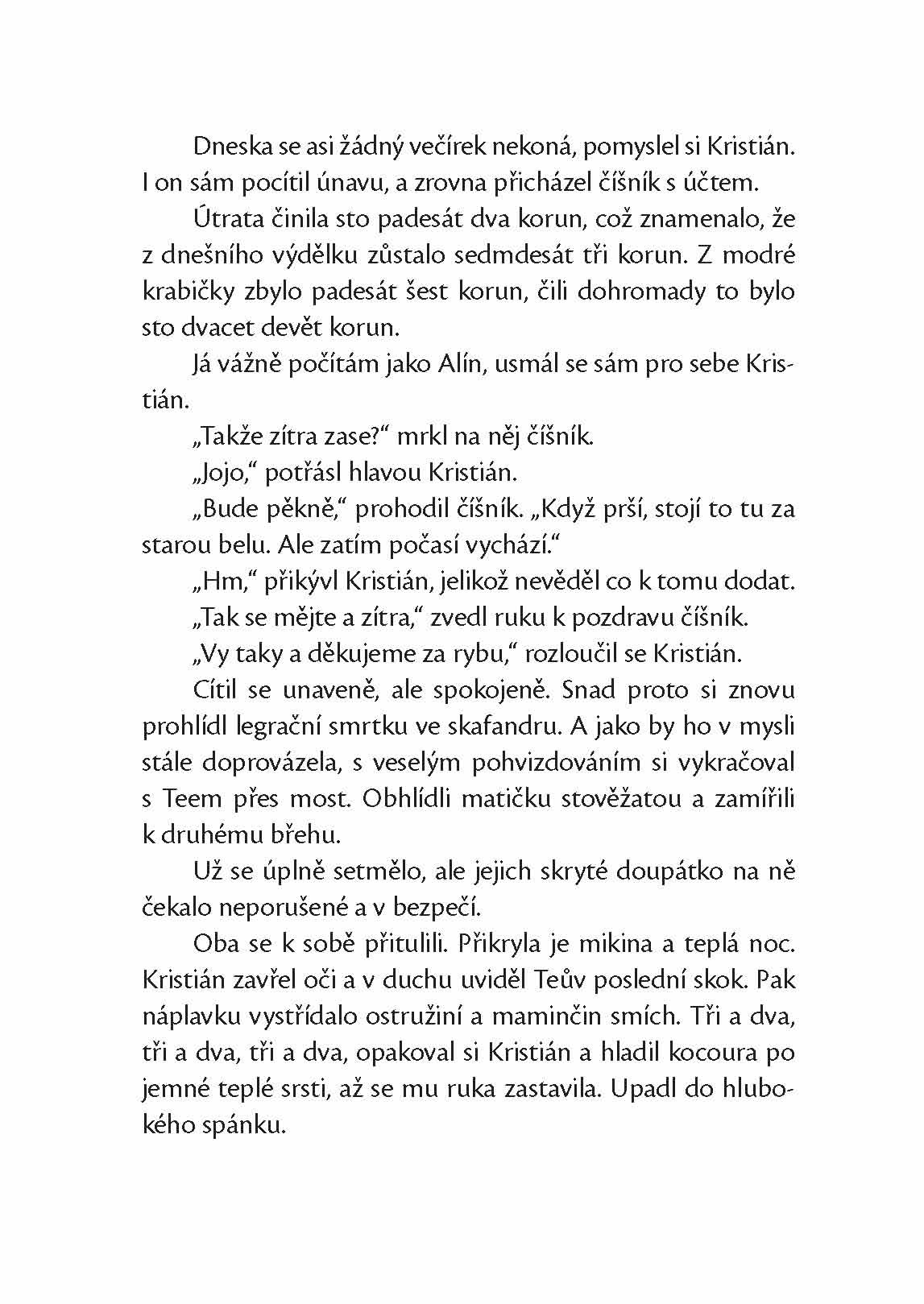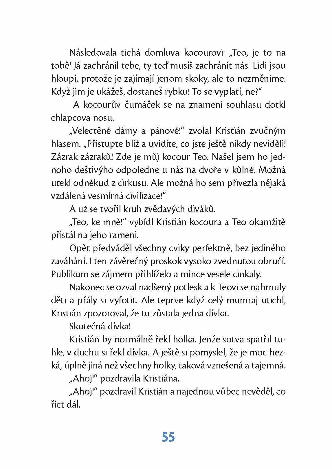 Tyhle prázdniny nezačaly pro Kristiána zrovna šťastně. Maminka alkoholička se jednoho dne nevrátila domů, a tak po dlouhém úzkostném čekání vylekaný Kristián utíká z domova. Útočiště najde na nábřeží Vltavy, kde se potlouká se svým jediným kamarádem – černým kocourem. Cvičený Teo předvádí turistům akrobatické kousky, a tím oba tuláci získávají trochu peněz k přežití. Kristián ví, že se nemůže skrývat věčně. Ale jak má zachránit maminku i sebe?