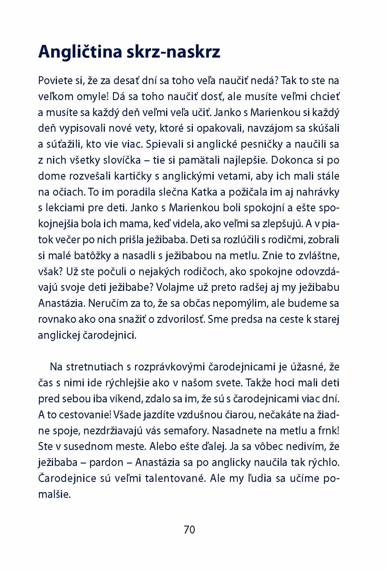 Toto je len jeden rozmer Madam ježibaby. Ježibaba vďaka deťom objaví celkom nový svet, začne sa inak obliekať a zmení aj svoje spiatočnícke kanibalské stravovacie návyky. Otvorila sa jej celkom nová dimenzia, túži spoznať ďalšie ježibaby a deti ju v tom nadšene podporujú. Marienka vie z kníh o ježibabách v Anglicku a tu sa začína druhý rozmer tejto knihy: deti učia ježibabu po anglicky a tým pádom sa učí aj čitateľ. Básničky, slovensko – anglické prešmyčky, základné vety a frázy, všetko je prirodzenou súčasťou deja, čitateľ sa učí, ani o tom nevie. Tretím rozmerom knihy sú hry: medzi kapitolami je niekoľko zastávok v deji, ktoré sú vyplnené návrhmi na vedomostné kvízy a hry, dokonca dvojjazyčné recepty, nechýbajú tajničky a stolová hra, všetko v kombinácii angličtiny a slovenčiny. Ježibabu to celkom zmení, vyzerá omnoho viac k svetu, začne používať počítač a dokonca cestuje. Ako zmení život znalosť cudzích jazykov život ľuďom, to asi netreba nikomu dvakrát vysvetľovať. Čím skôr budú deti považovať viacjazyčnosť za normálnu, tým lepšie pre nich.