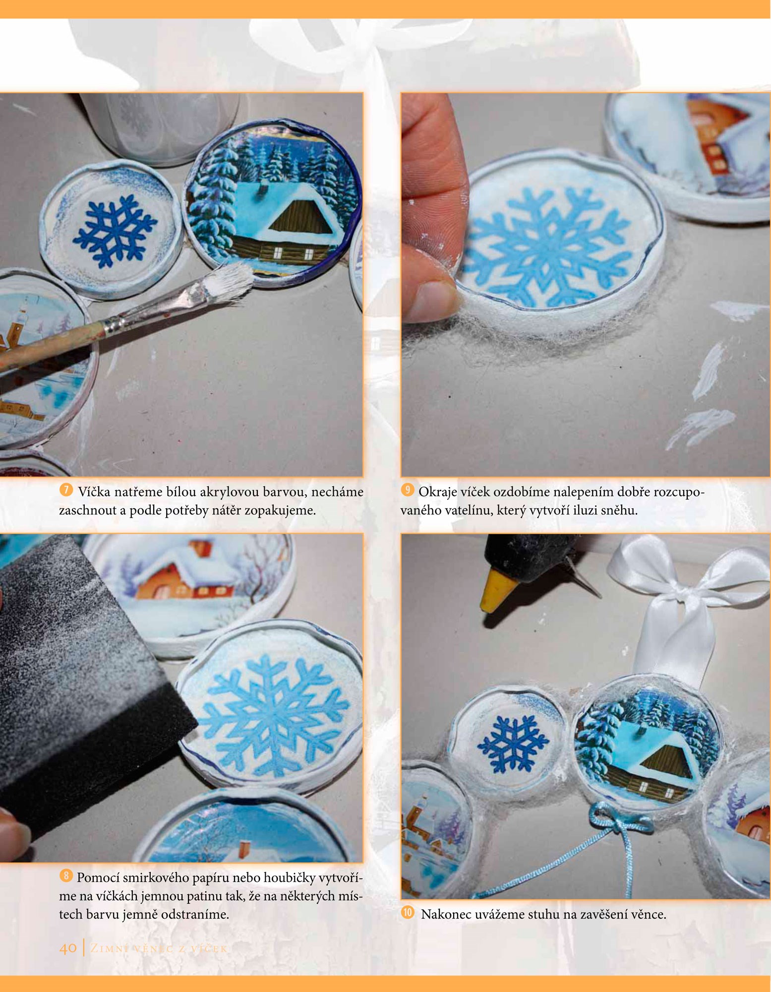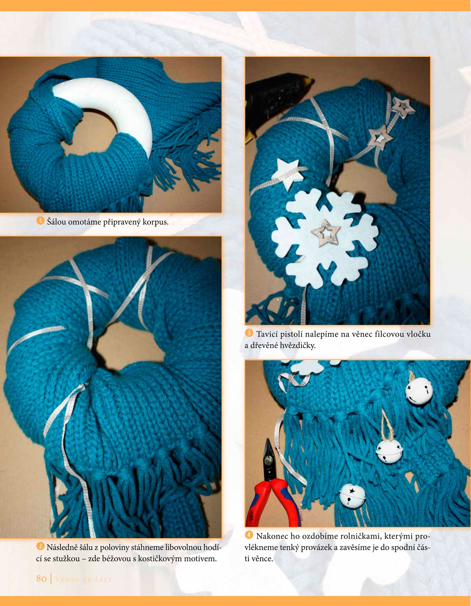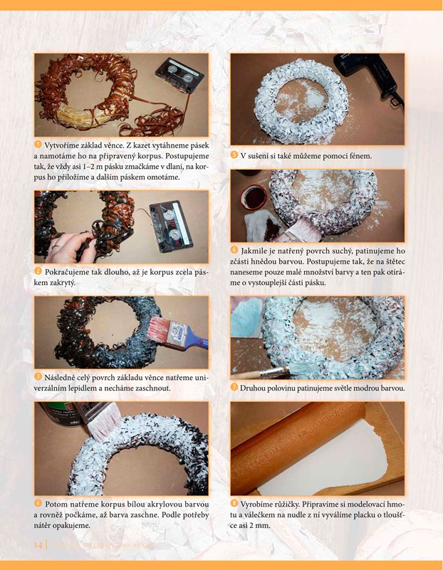 Ve zbrusu nové publikaci naleznete 35 jedinečných projektů, ve kterých vás zkušená autorka přesvědčí, že věnec je možné vykouzlit opravdu z čehokoliv, co vás zrovna napadne. Staré kazetové pásky, vyhořelé kalíšky čajových svíček, kovová víčka od zavařenin či obyčejná cibulová nať – to vše můžete použít jako základní materiál pro výrobu krásného dekorativního věnce. Dokonce ani stará šála nemusí ležet v šuplíku a může se stát ozdobnou dekorací na vašich dveřích. Zkrátka, fantazii se meze nekladou a vůbec nezáleží na tom, zda jste začátečník nebo pokročilejší, důležitá je pouze chuť tvořit.