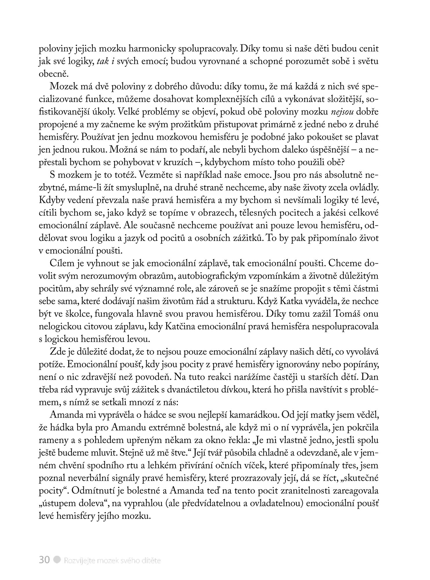 Náš „patrový mozek“, jenž rozhoduje a vyvažuje emoce, prochází až do věku mezi dvaceti a třiceti lety „výstavbou“. Zvláště malé děti pak mají sklony k tomu, aby nad logikou levé mozkové hemisféry převládla pravá hemisféra se svými emocemi. Proto není divu, když děti předvádějí záchvaty vzteku, perou se nebo mlčky trucují. Aplikováním těchto objevů na každodenní rodičovské situace můžete proměnit jakýkoli výbuch, hádku nebo záchvat strachu v příležitost integrovat dětský mozek a podpořit jeho životně důležitý růst.