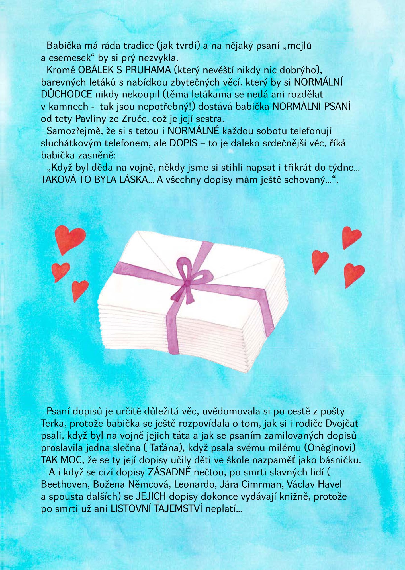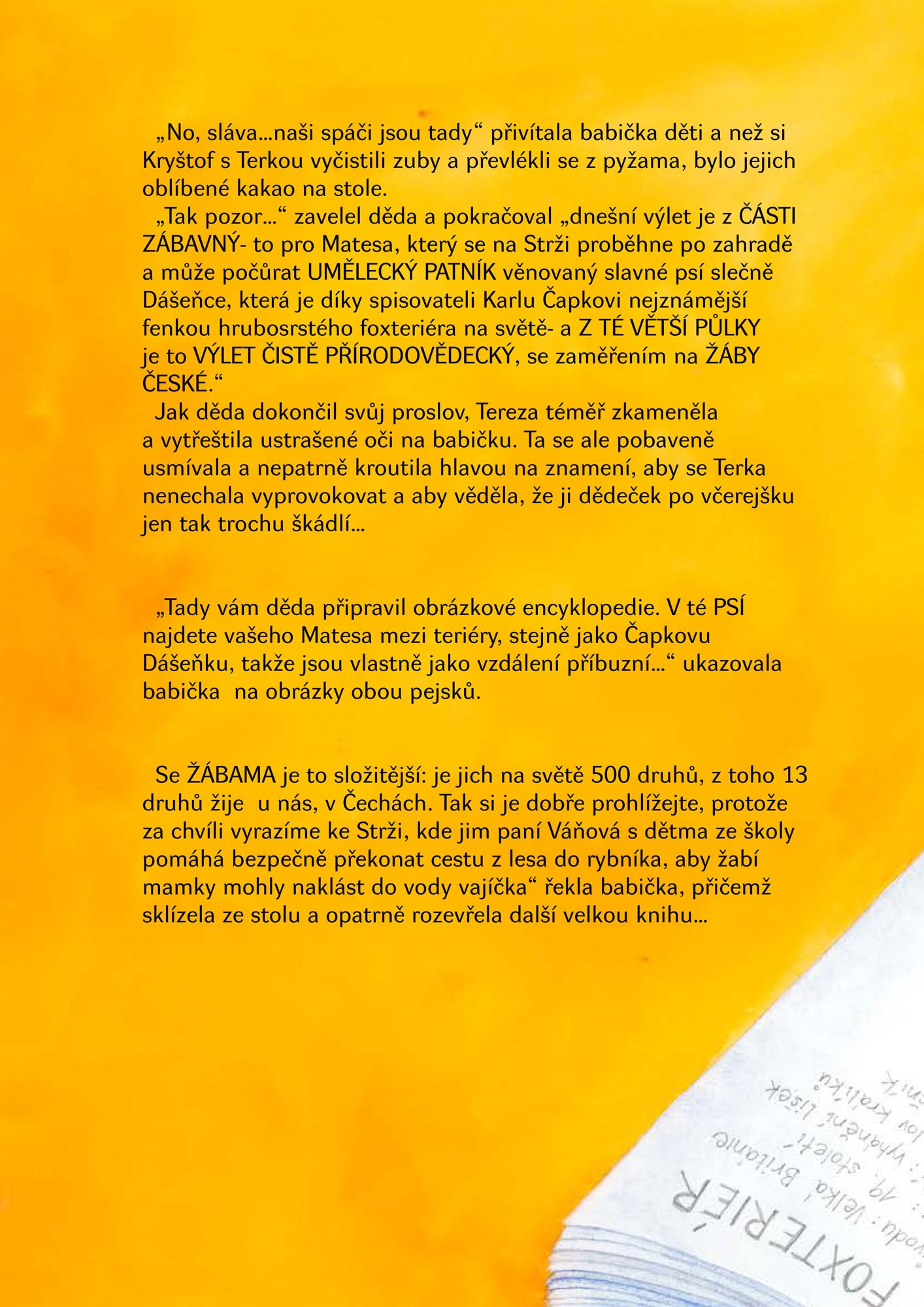 Kdo štěně "adoptoval", zda jsou psi podobni svým pánům nebo naopak, jaké kočky má doma teta Alice, jak důležité je psaní dopisů a jak si Dvojčata s babi a dědou doma hrají na OPRAVDICKÉ kino - o tom všem je napsáno a namalováno v této knize.