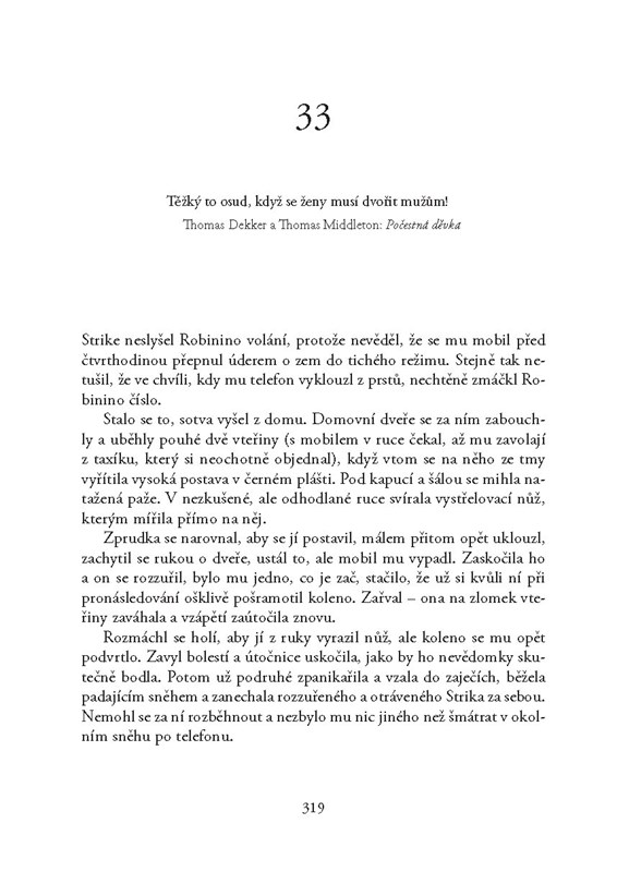 Jenže Strikovi během vyšetřování začíná být čím dál jasnější, že za Quineovým zmizením se skrývá větší tajemství, než si jeho žena myslí. Romanopisec právě dokončil rukopis, v němž s jízlivou zlomyslností vykreslil téměř všechny své známé. Kdyby se román zveřejnil, zničil by leckomu život. Existuje tudíž spousta lidí, kteří ho mohli chtít umlčet.