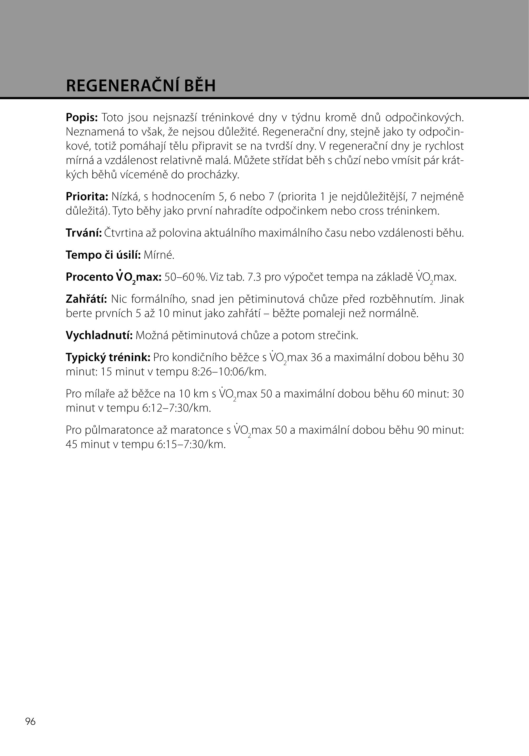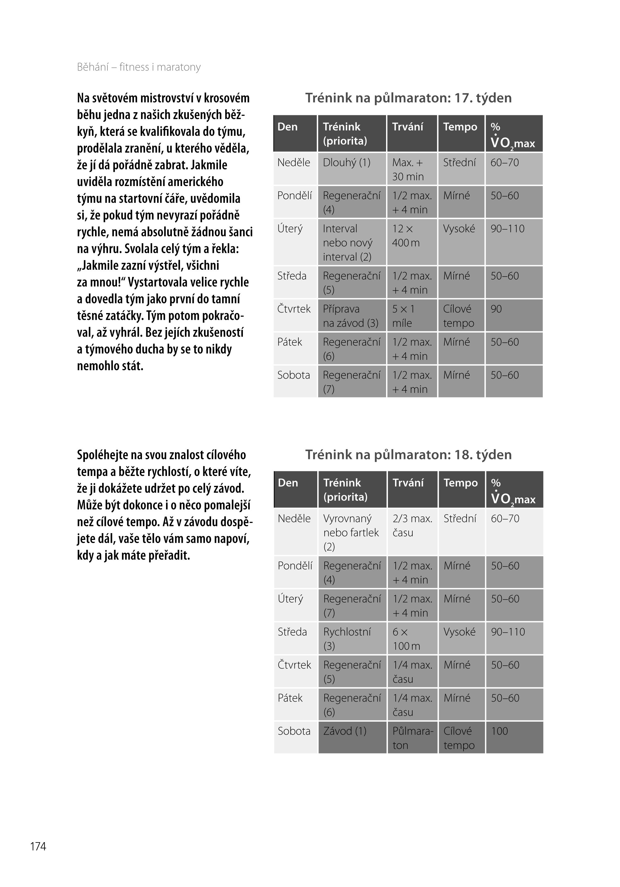 - Druhá část vás krok za krokem provede procesem využívání vašich vlastních cílů a charakteristik k naplánování efektivního běžeckého programu. Seznámíte se tu s deseti typy běžeckých tréninků, včetně nového intervalového tréninku, který vyvinul Peter Thompson. Zjistíte, co dělat před a po běžeckém tréninku; a dozvíte se, proč a jak využívat cross trénink nebo si vést běžecký deník. Dále tu najdete podrobné informace o strečinku, výživě, sledování indikátorů zotavování či o cross tréninku ve vodě.