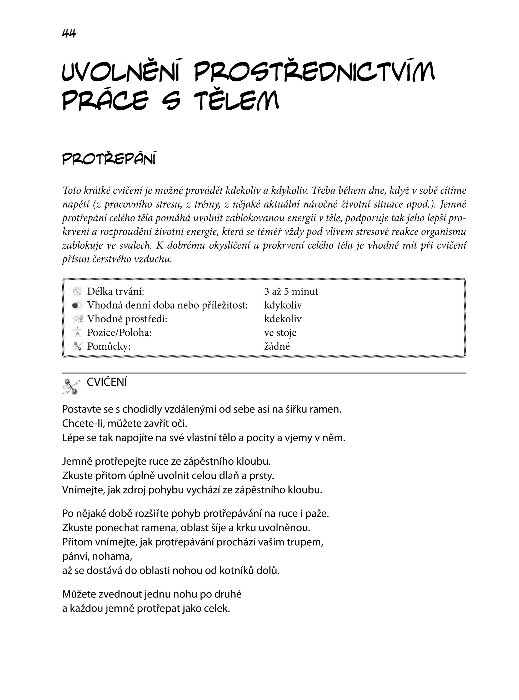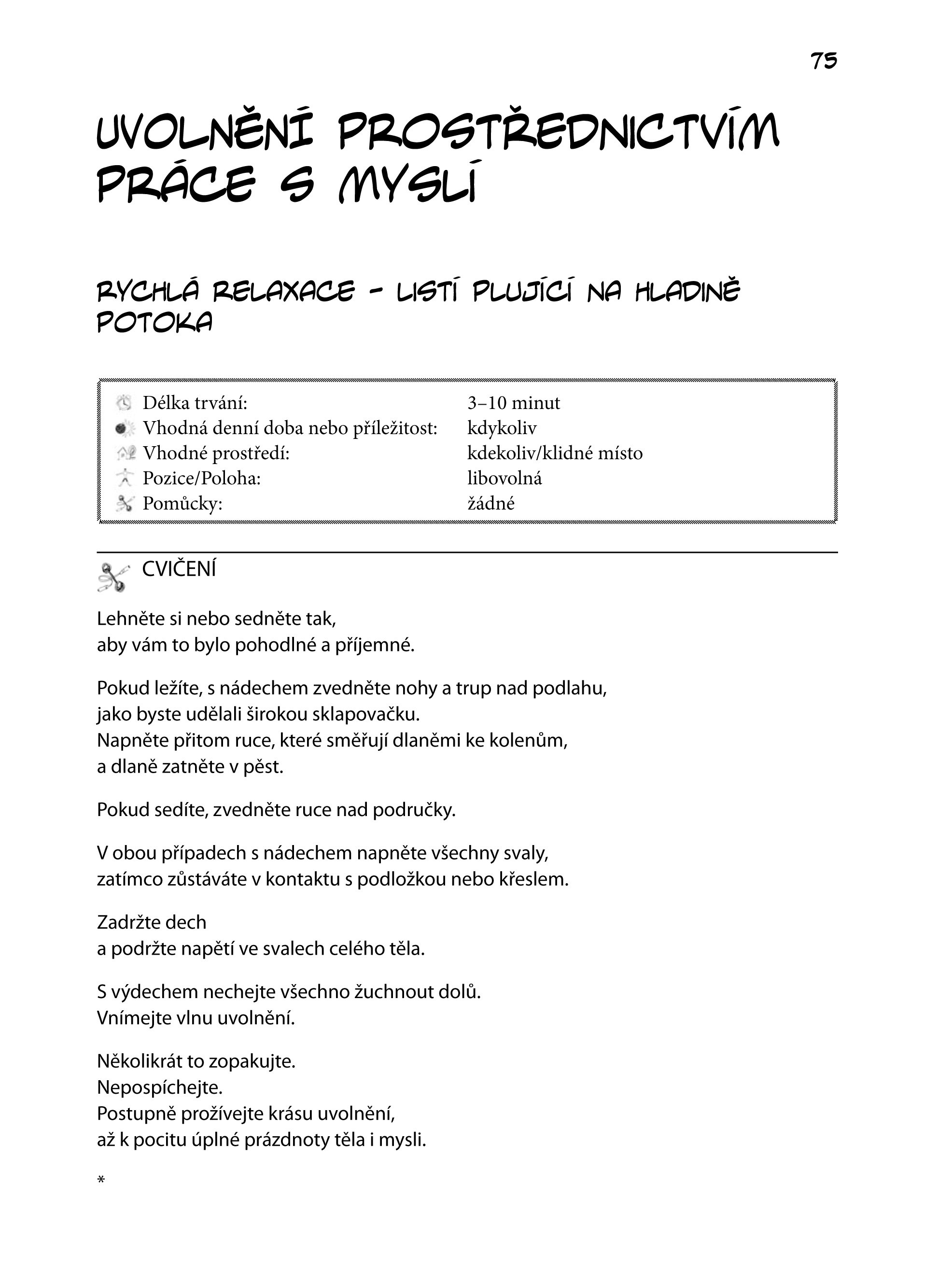 Našim záměrem bylo vytvořit texty k relaxacím tak, aby je mohl kdokoliv použít pro sebe, ale také při doprovázení druhého. Nejpraktičtější je pak nejspíše CD, které je přílohou této knihy, a kde najdete různá relaxační cvičení, od super-krátkých po téměř 40-minutová. Můžete si je nahrát do telefonu nebo do mp3 přehrávače a kdykoliv si je pustit.Kéž vám tato kniha pomůže k tomu, aby se uvolněný stav začal znovu stávat vaší přirozeností…