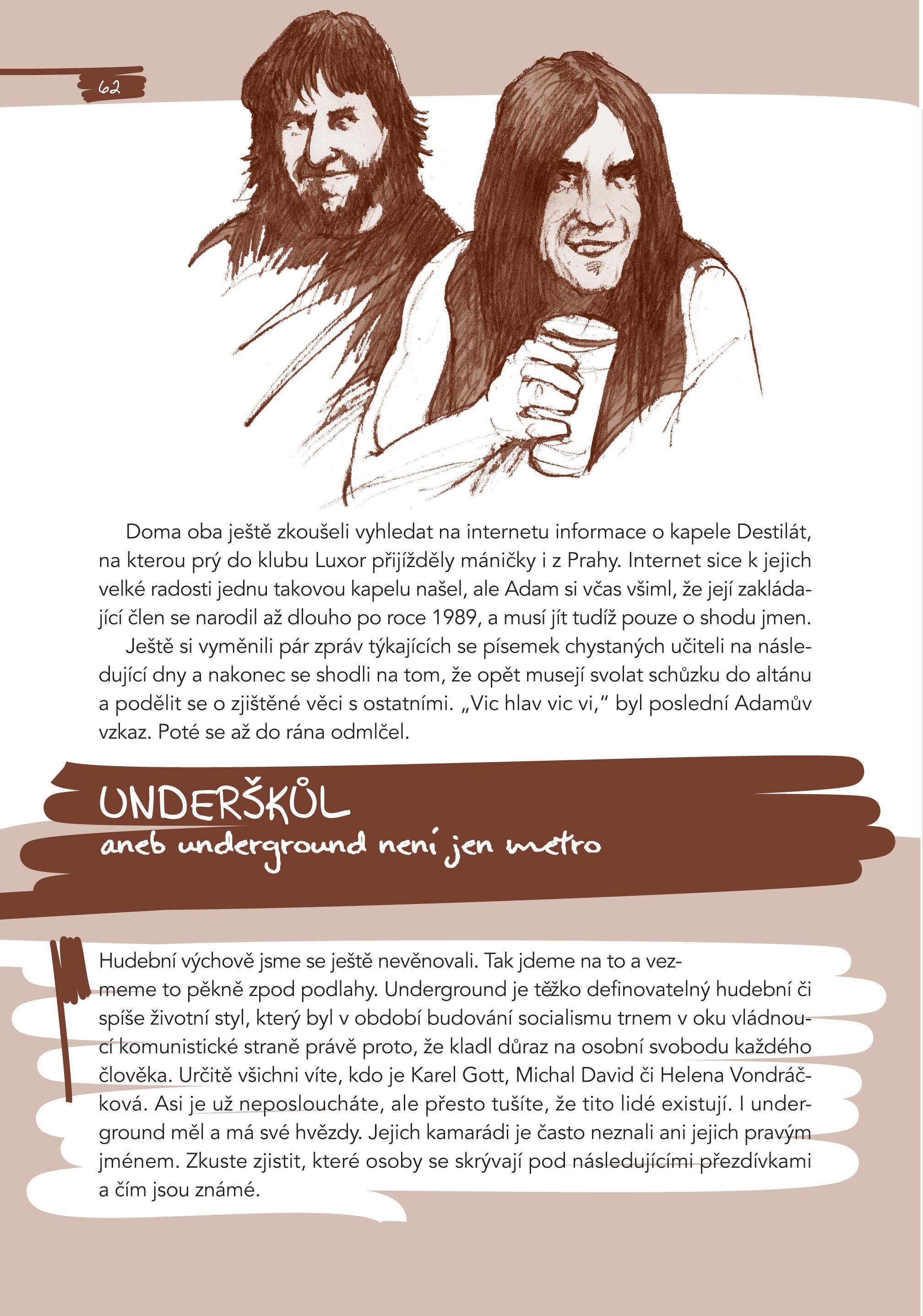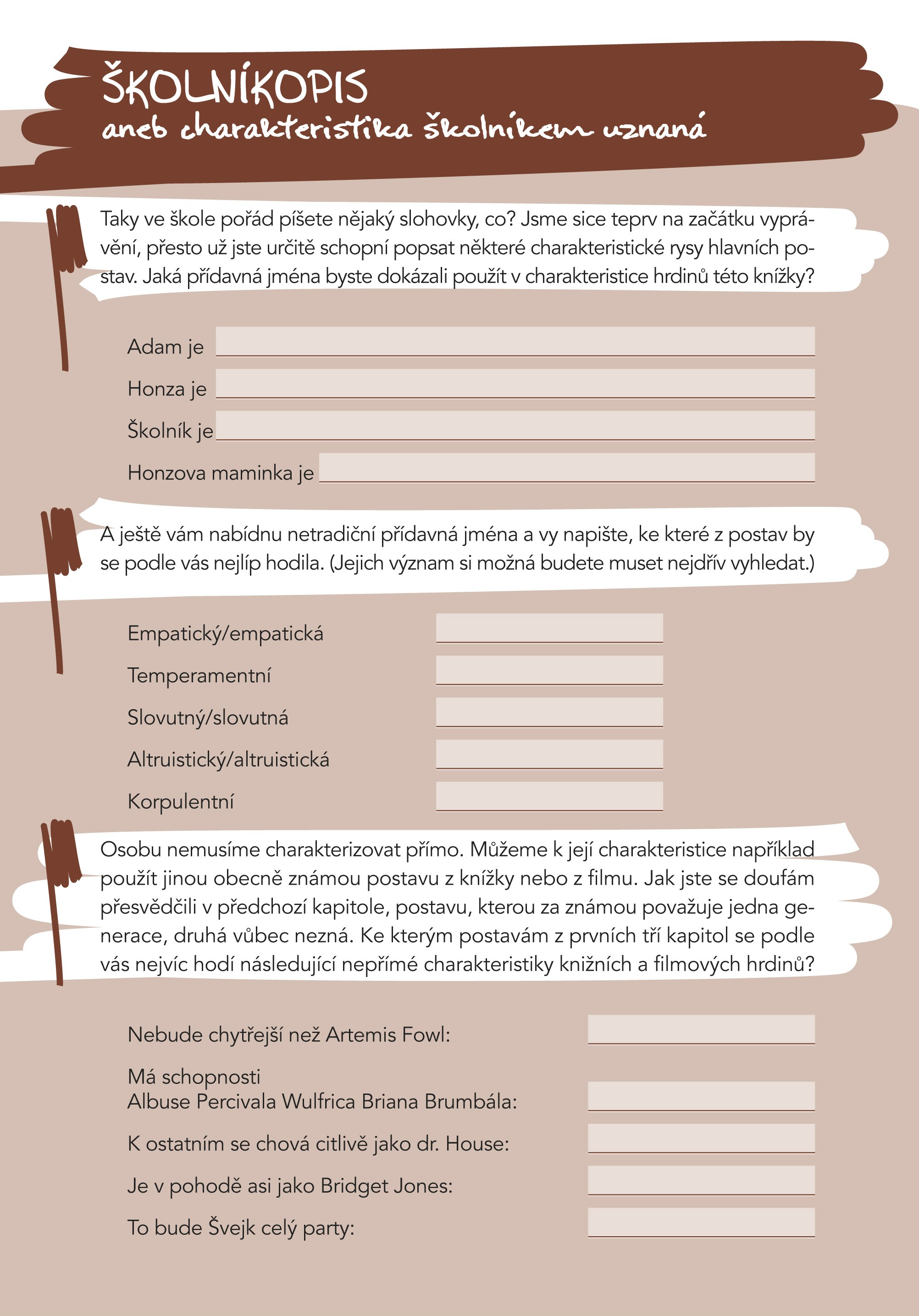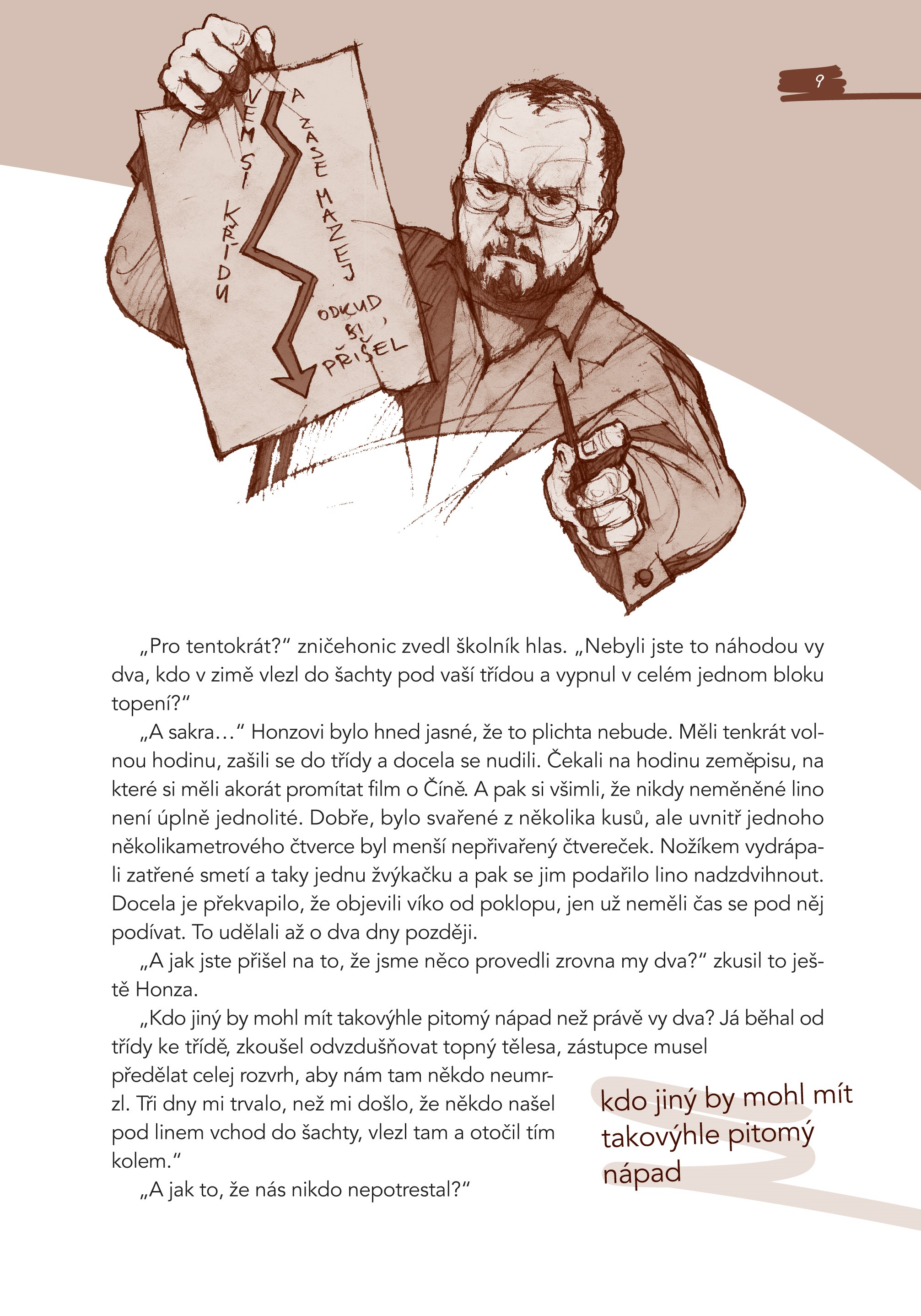 Ale co když chce týpek v montérkách něco víc? Co když si přeje zanechat trochu jinou stopu v myslích žáků. Obzvláště těch, kterým jsou lavice příliš těsné a kteří otevírají učebnice jen s největším odporem. Honza s Adamem nechápou, proč by si měli něco vtloukat do hlavy, když všechny informace jsou na internetu. Raději vymýšlejí lumpárny. V případě našeho školníka však narazila kosa na kámen. Když ho zamknou v dílně, nepopadne je za límec a neodtáhne do ředitelny… Stane se něco jiného.